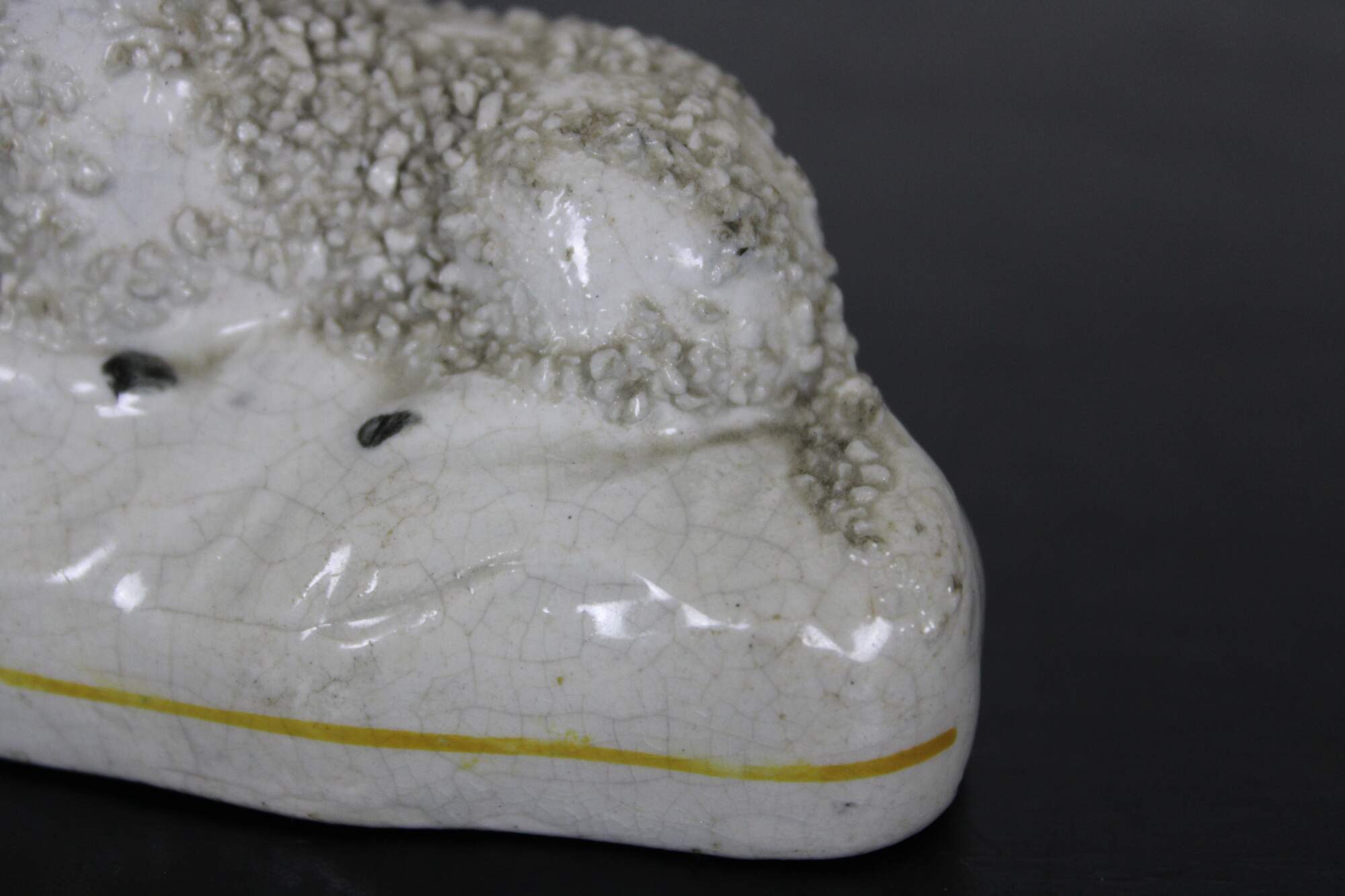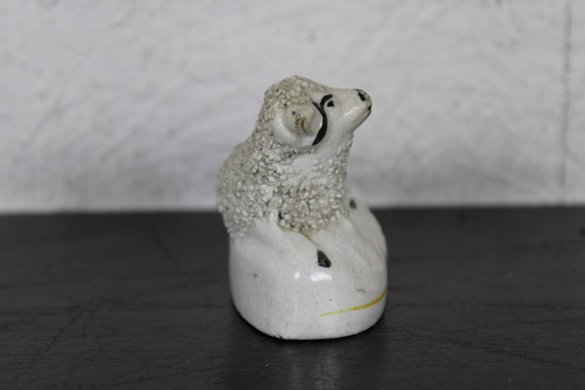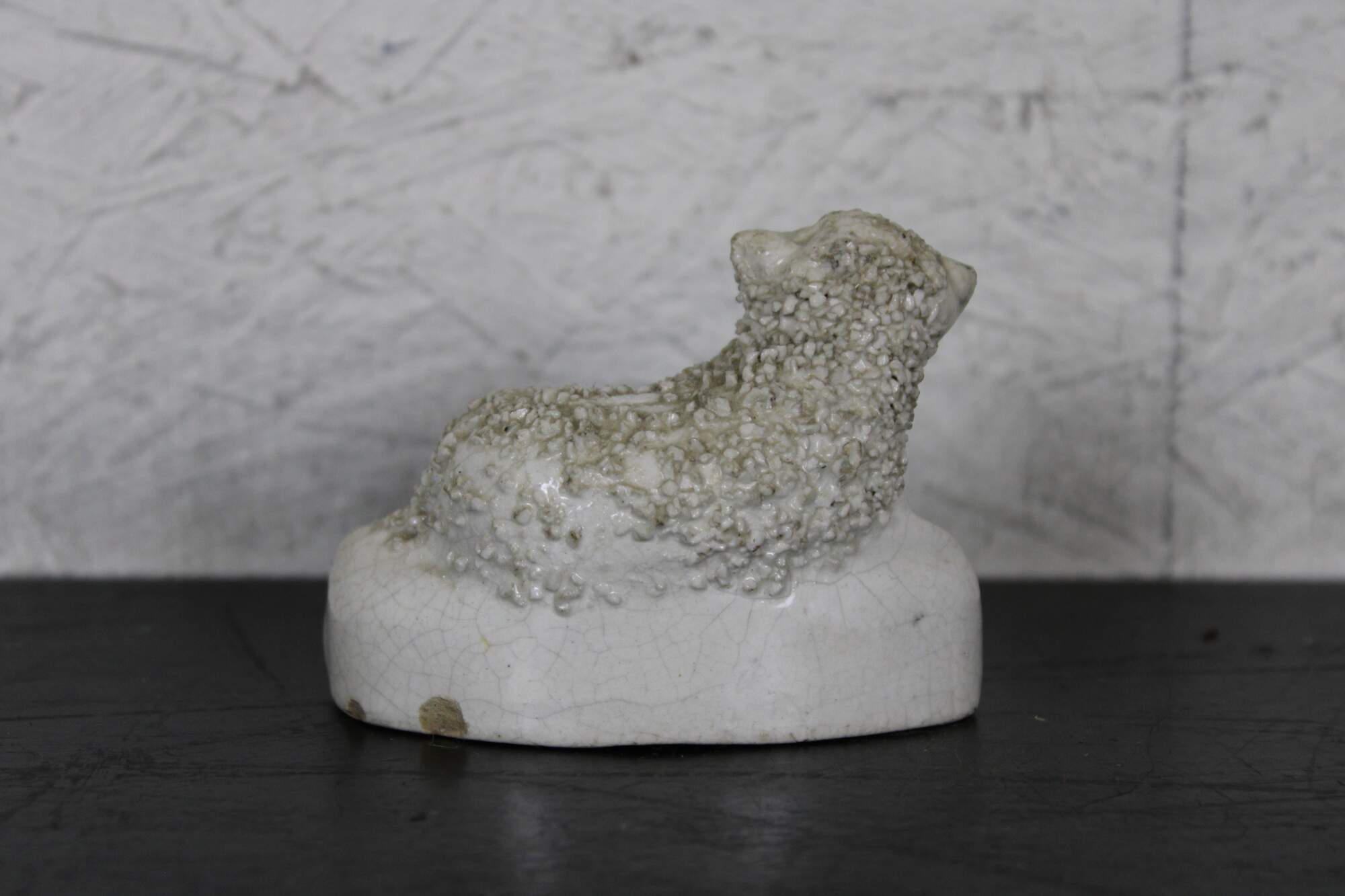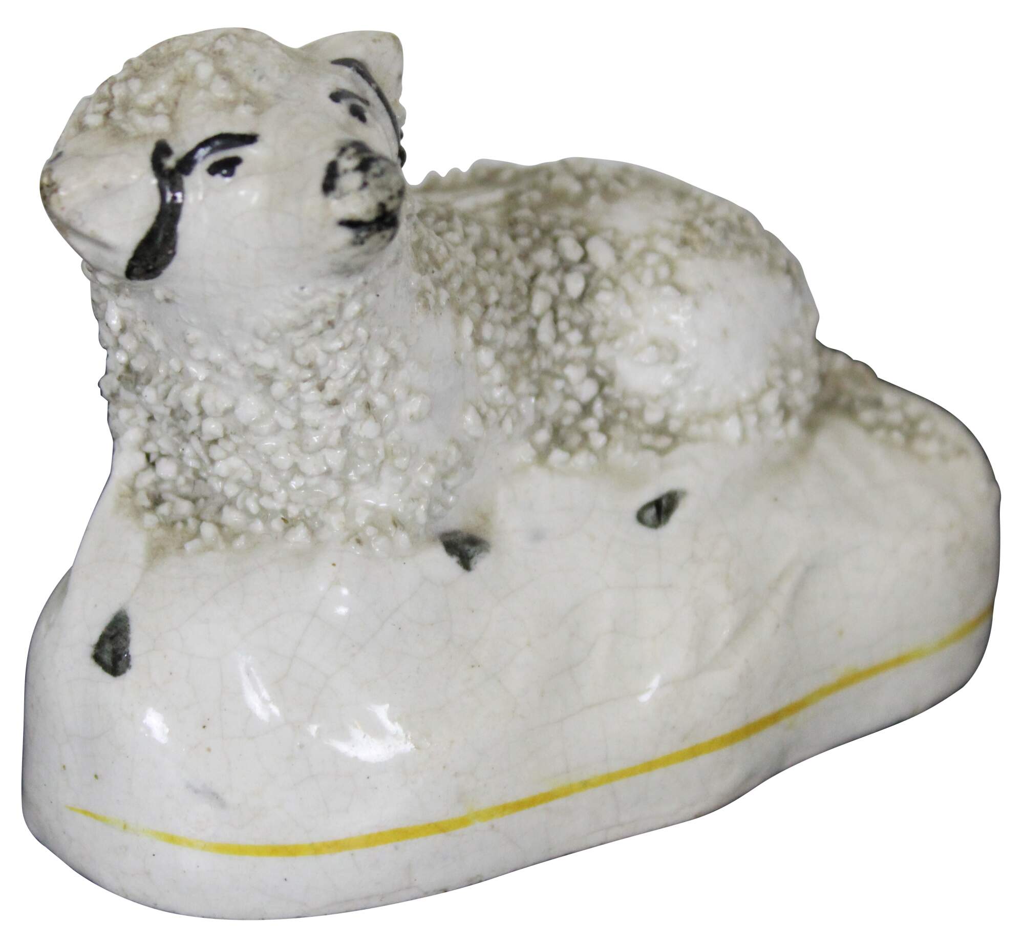 Antique Staffordshire figurine of a confetti porcelain sheep laying on a white base.