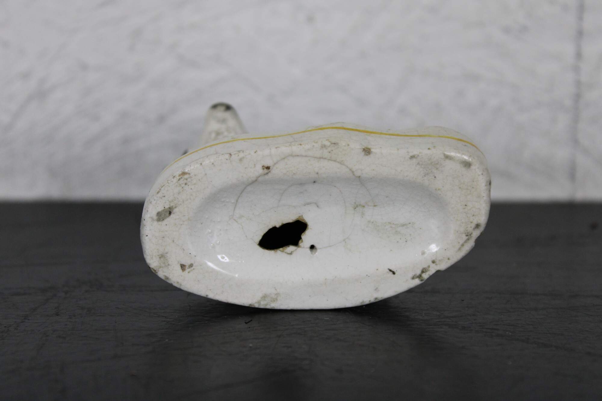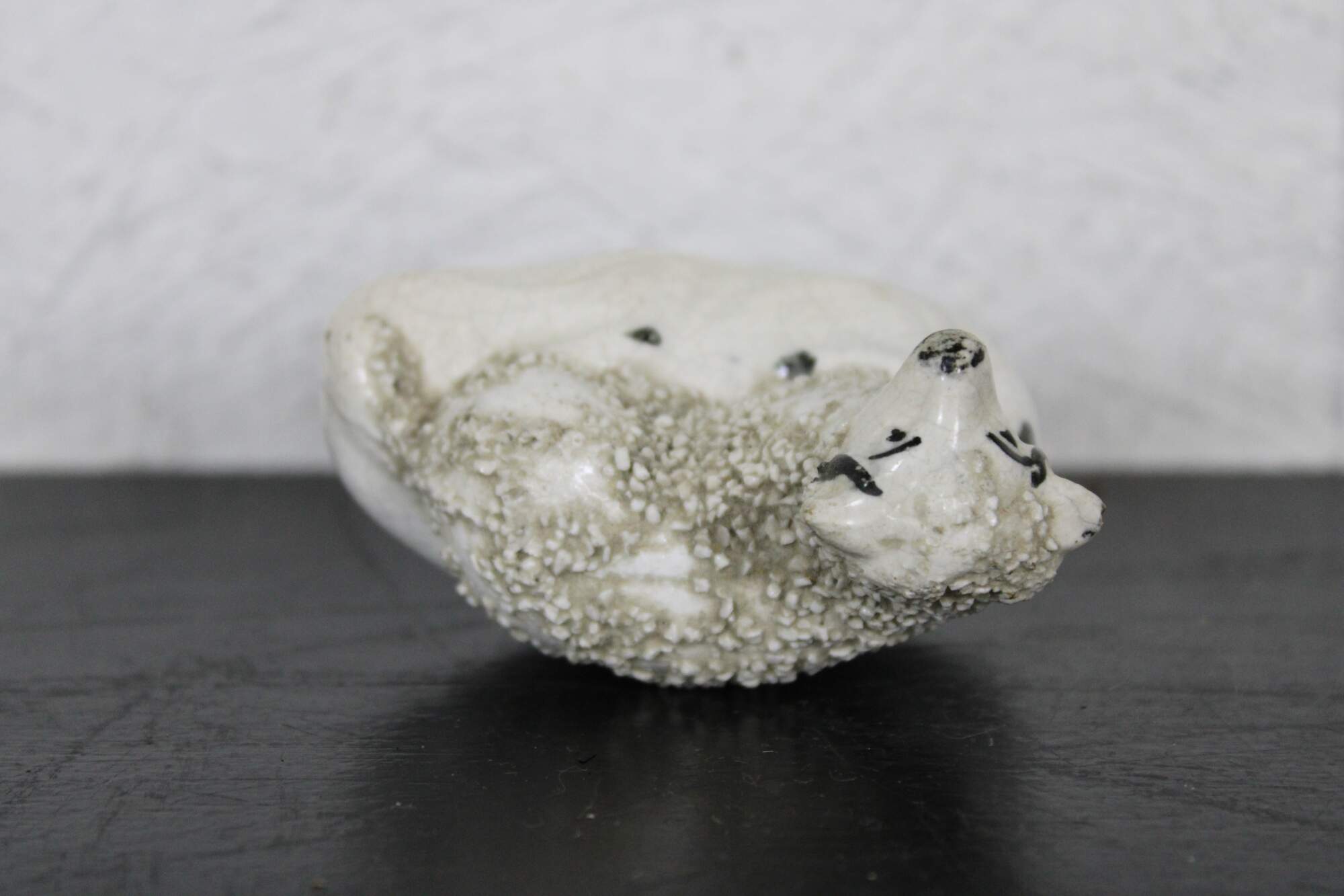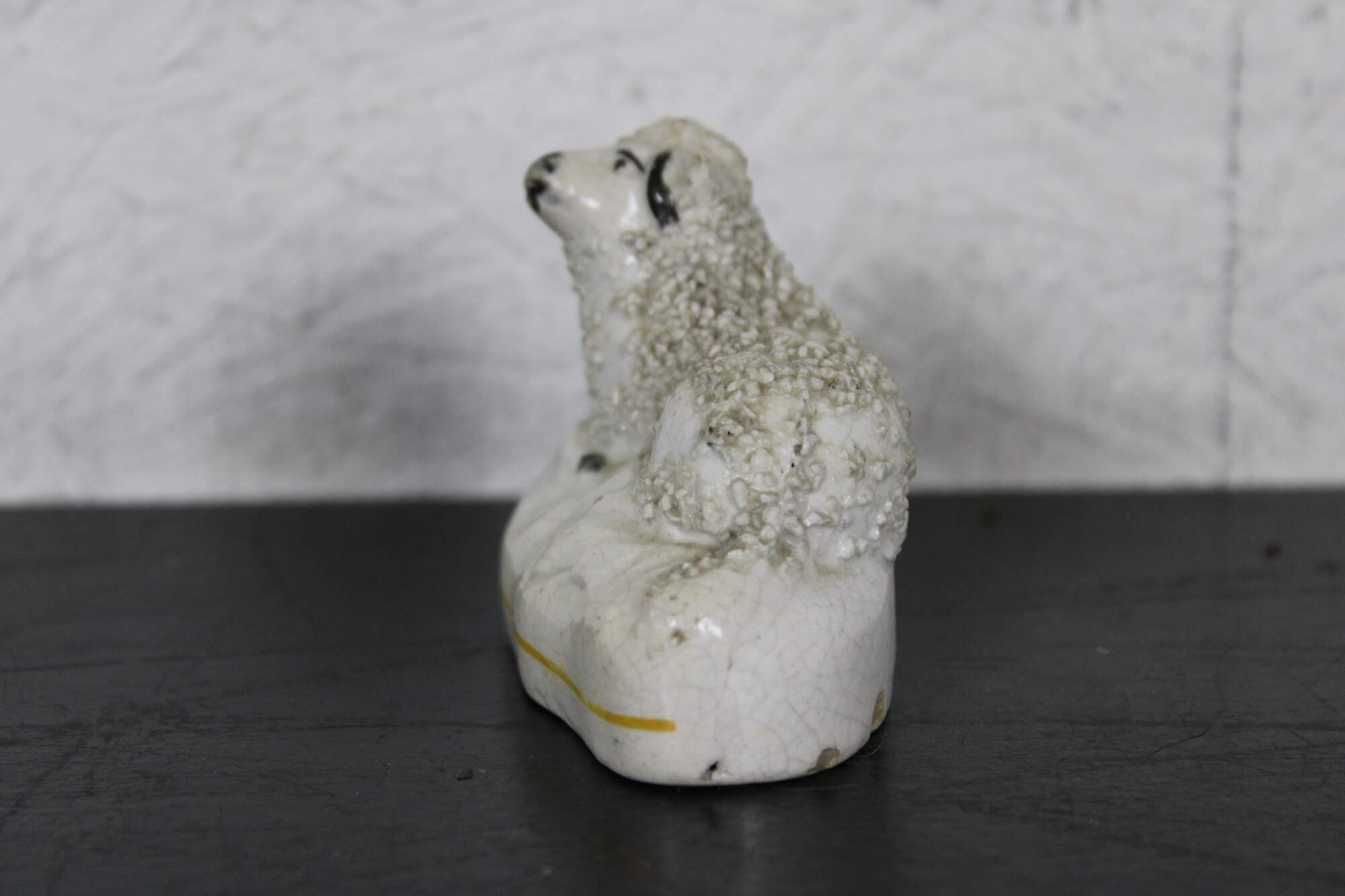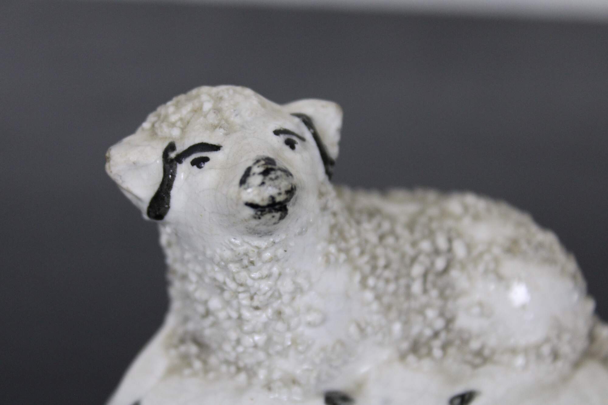 Antique Staffordshire figurine of a confetti porcelain sheep laying on a white base.