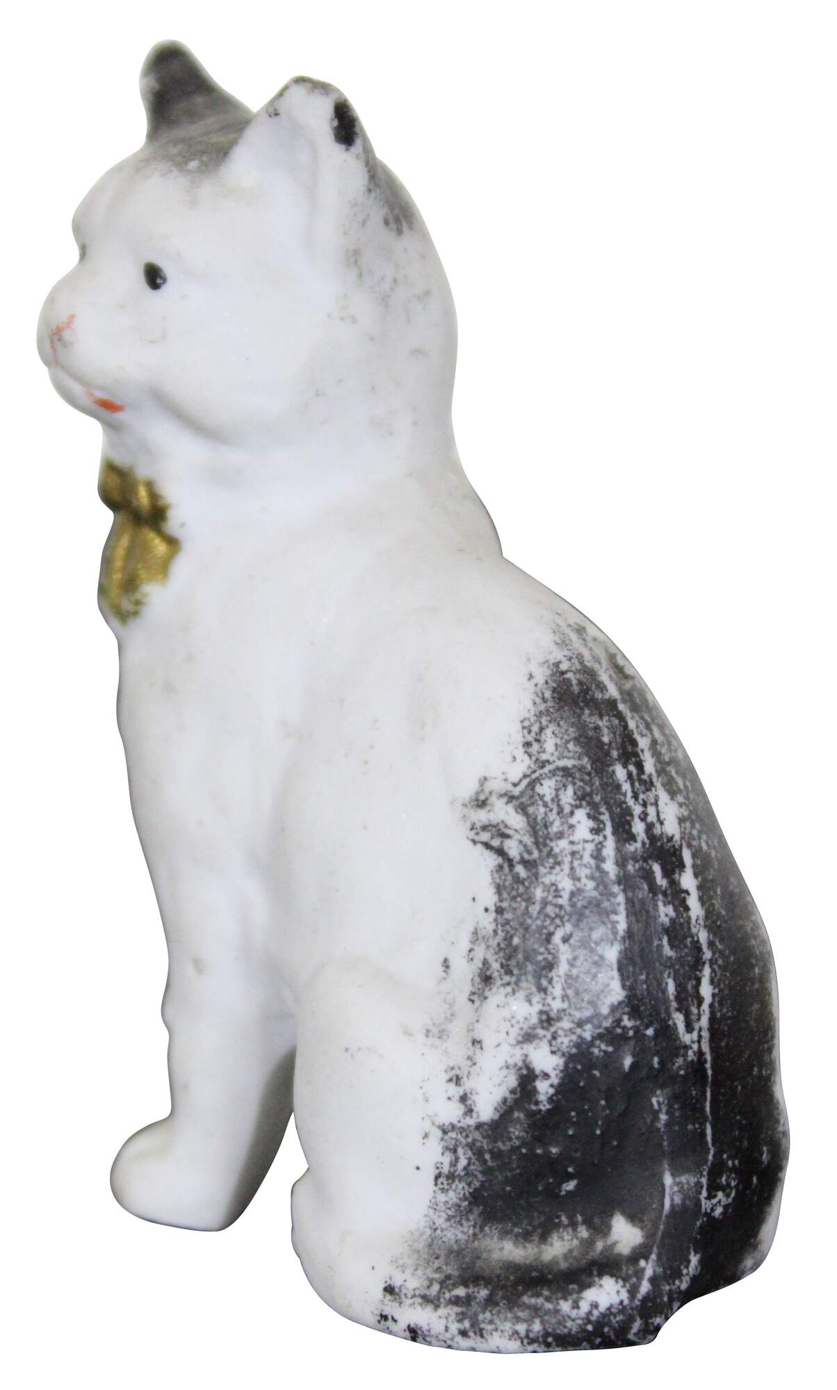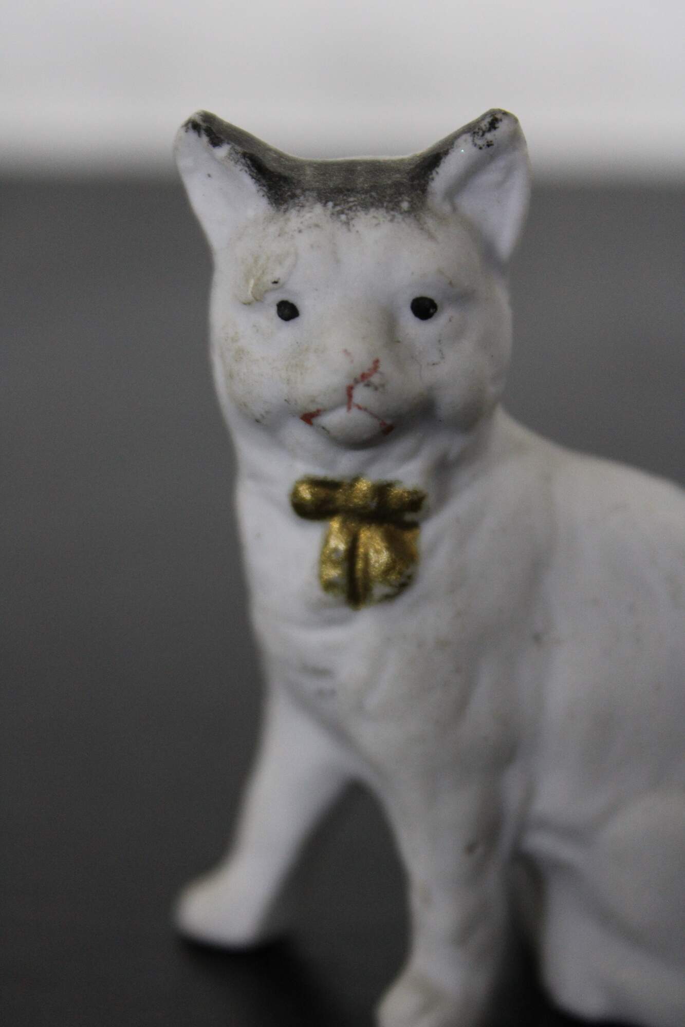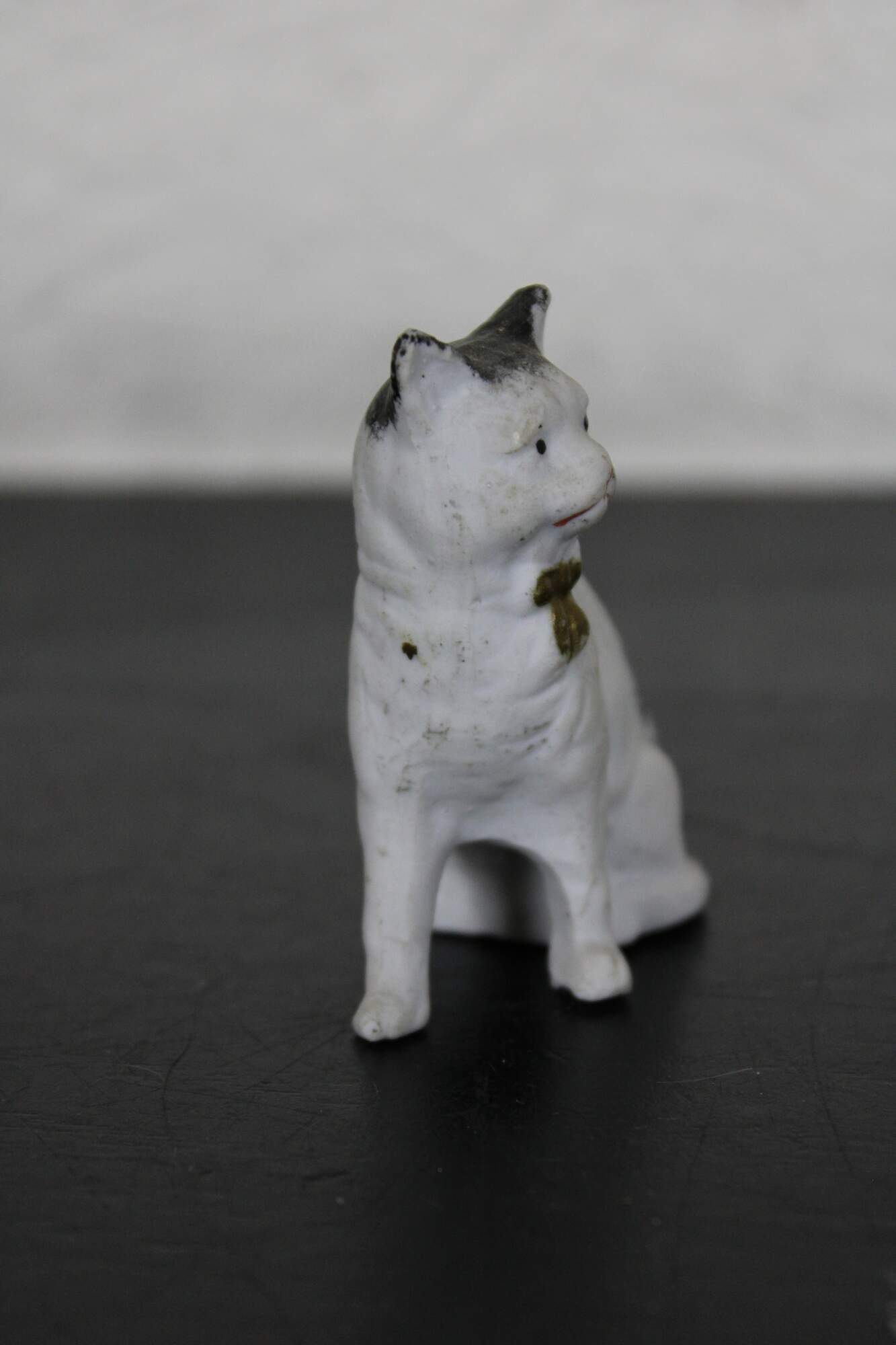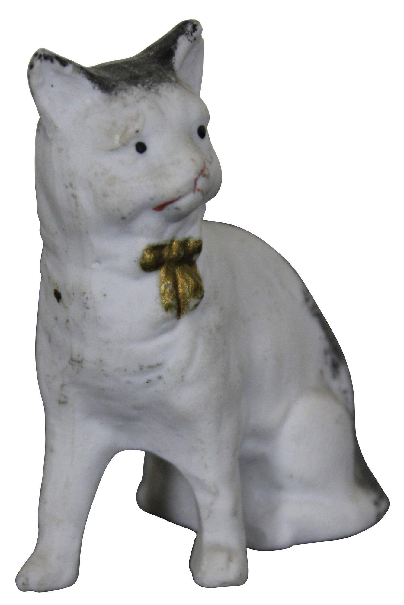 Antique painted bisque dollhouse cat figurine with gold bow / bell.
