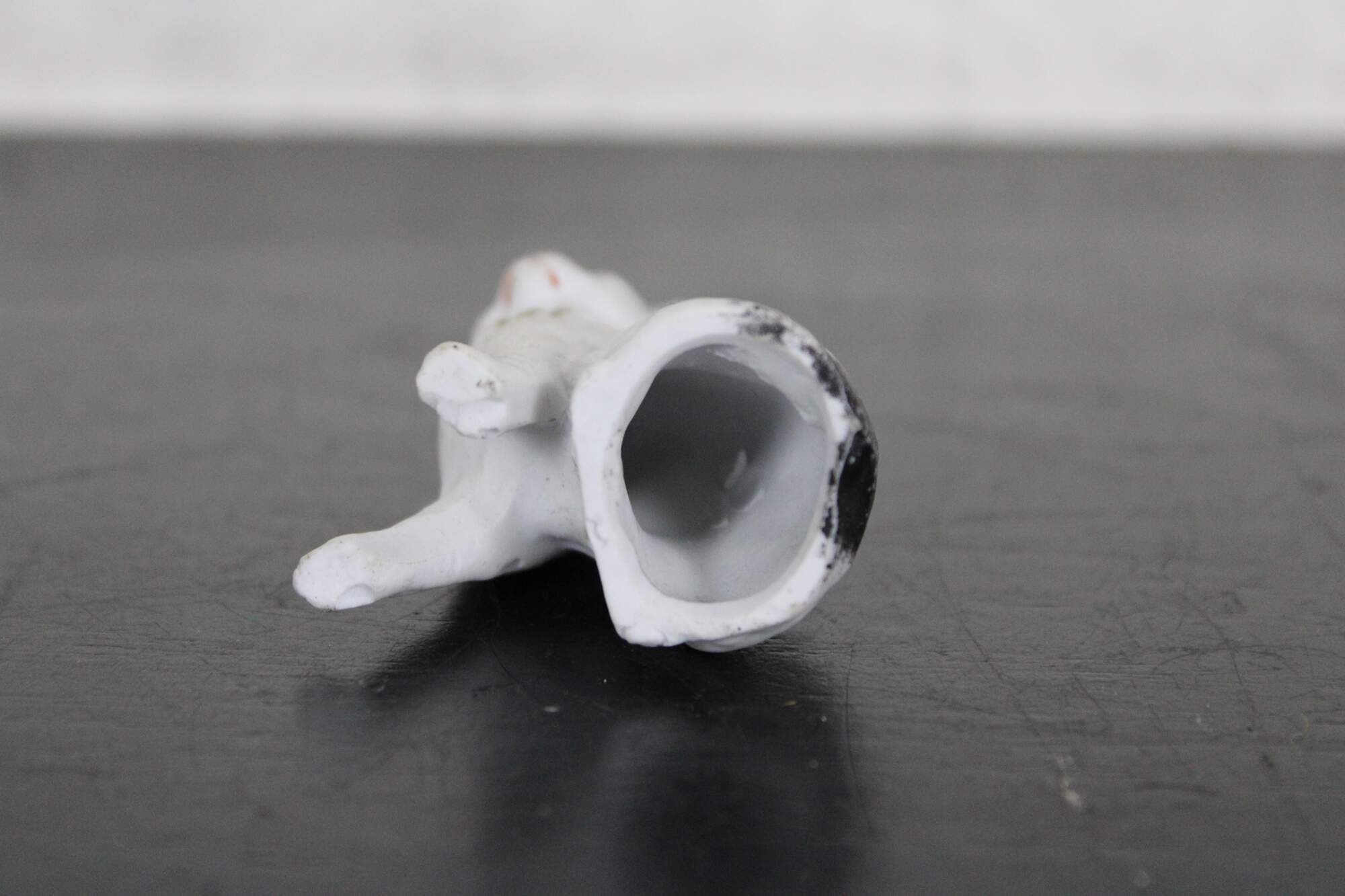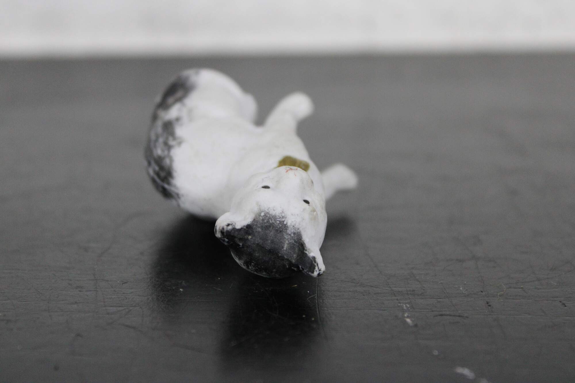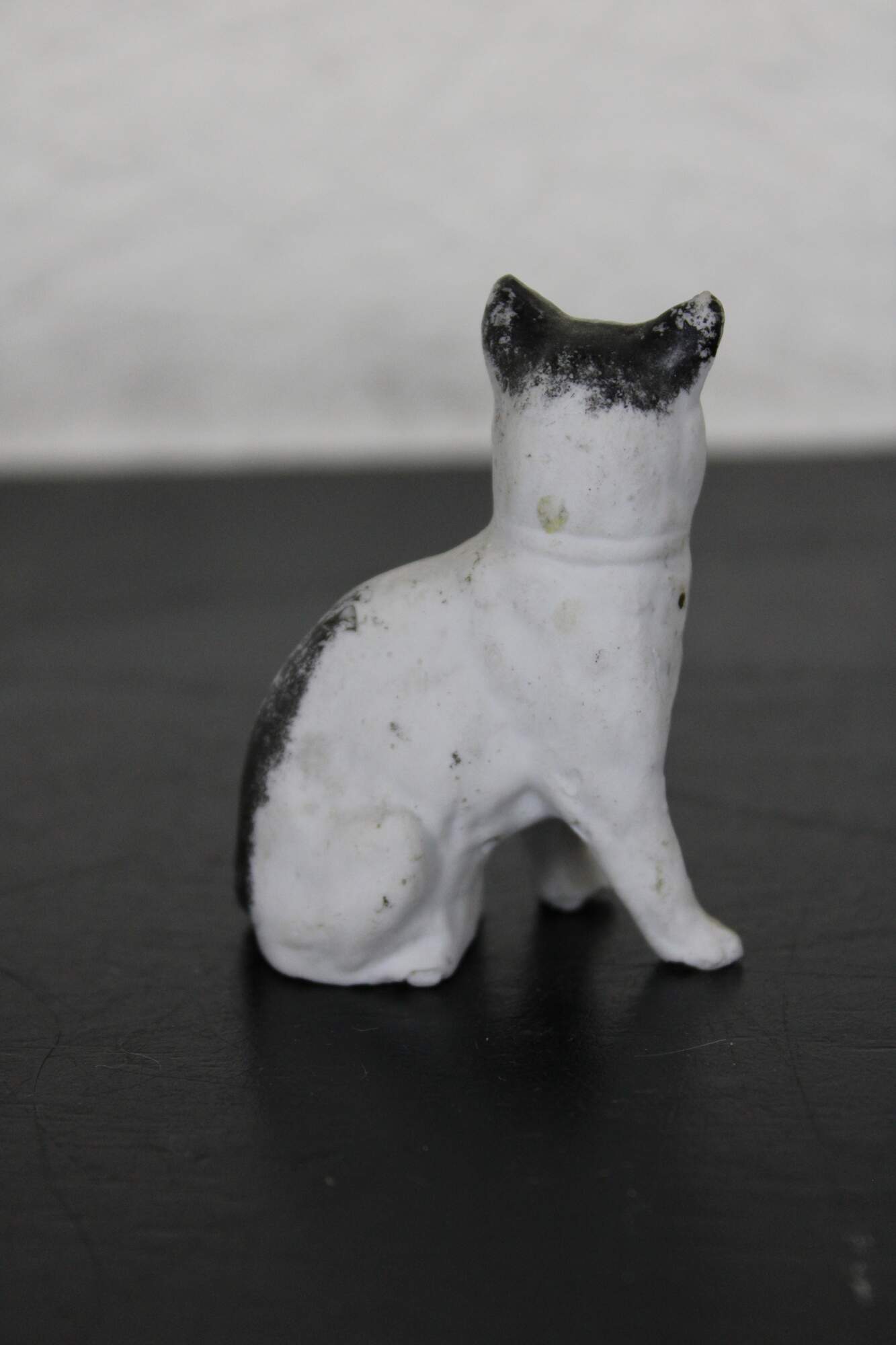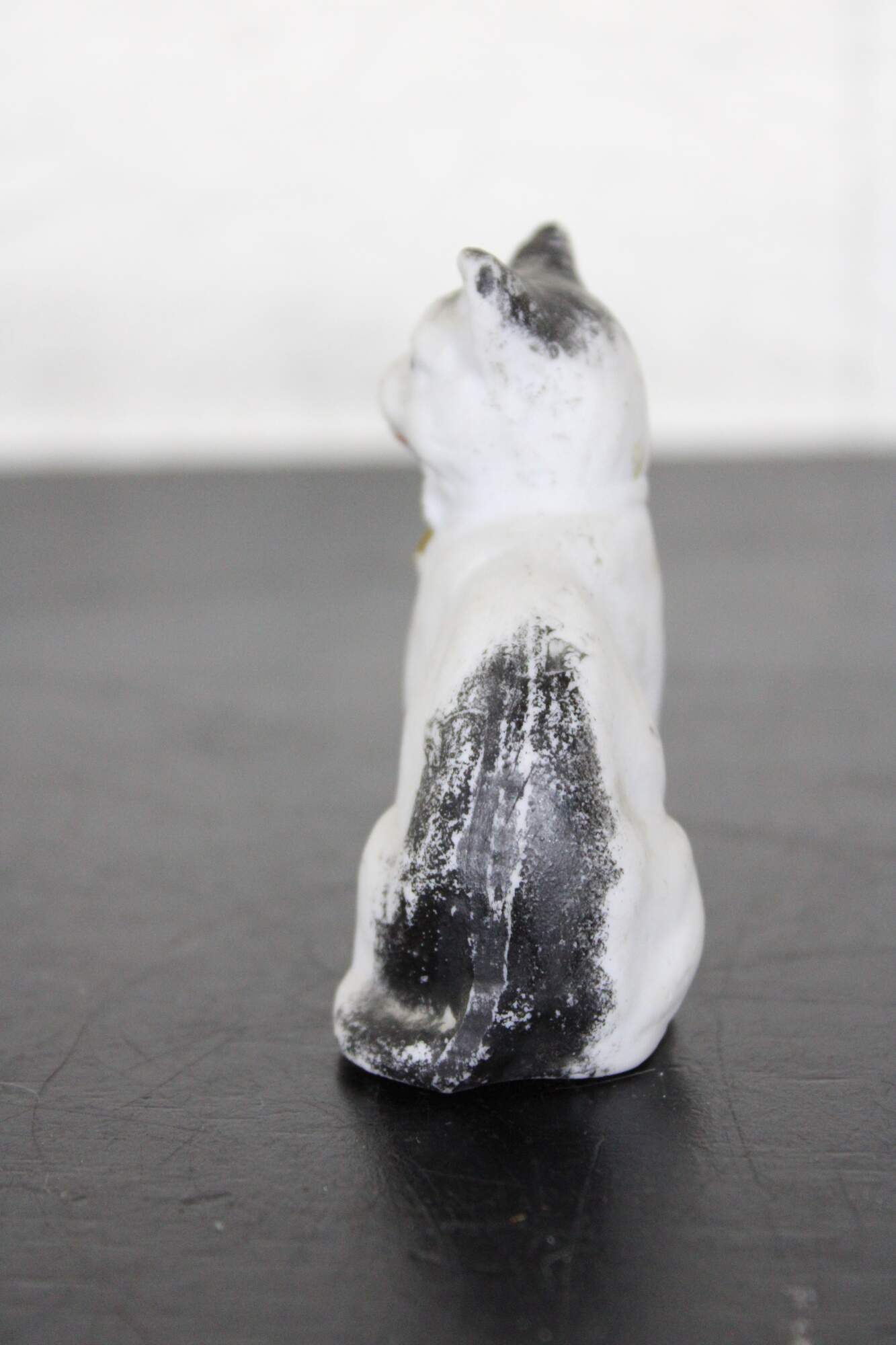 Antique painted bisque dollhouse cat figurine with gold bow / bell.