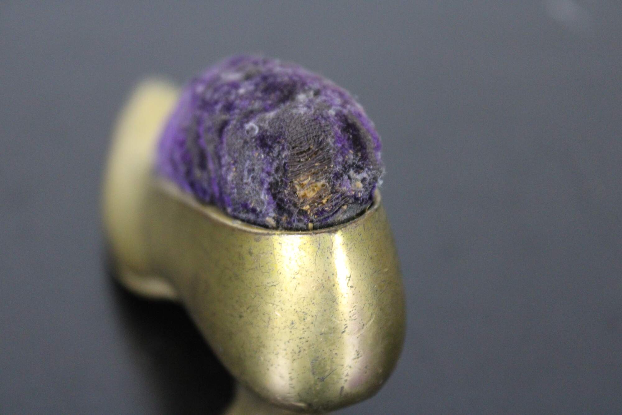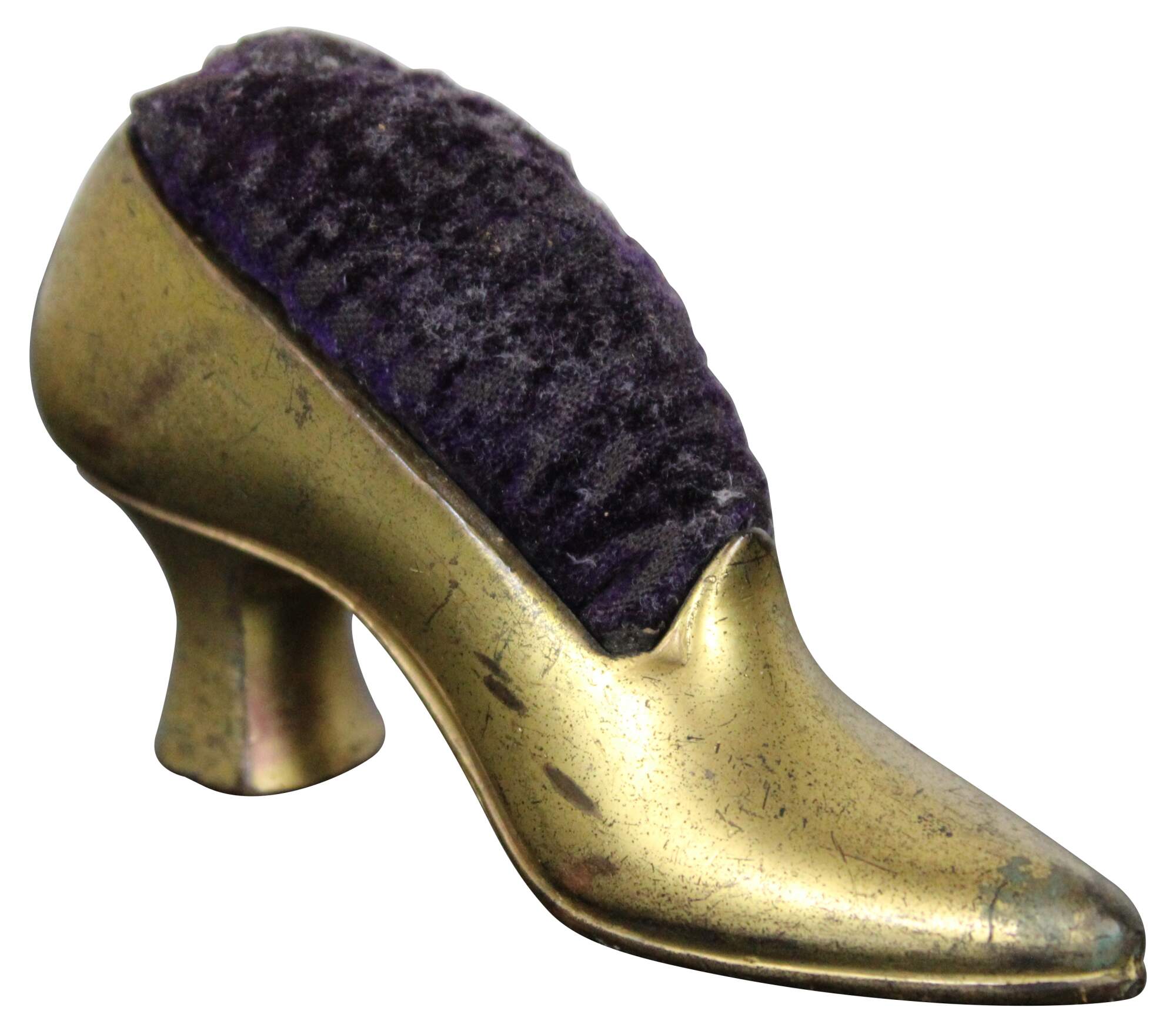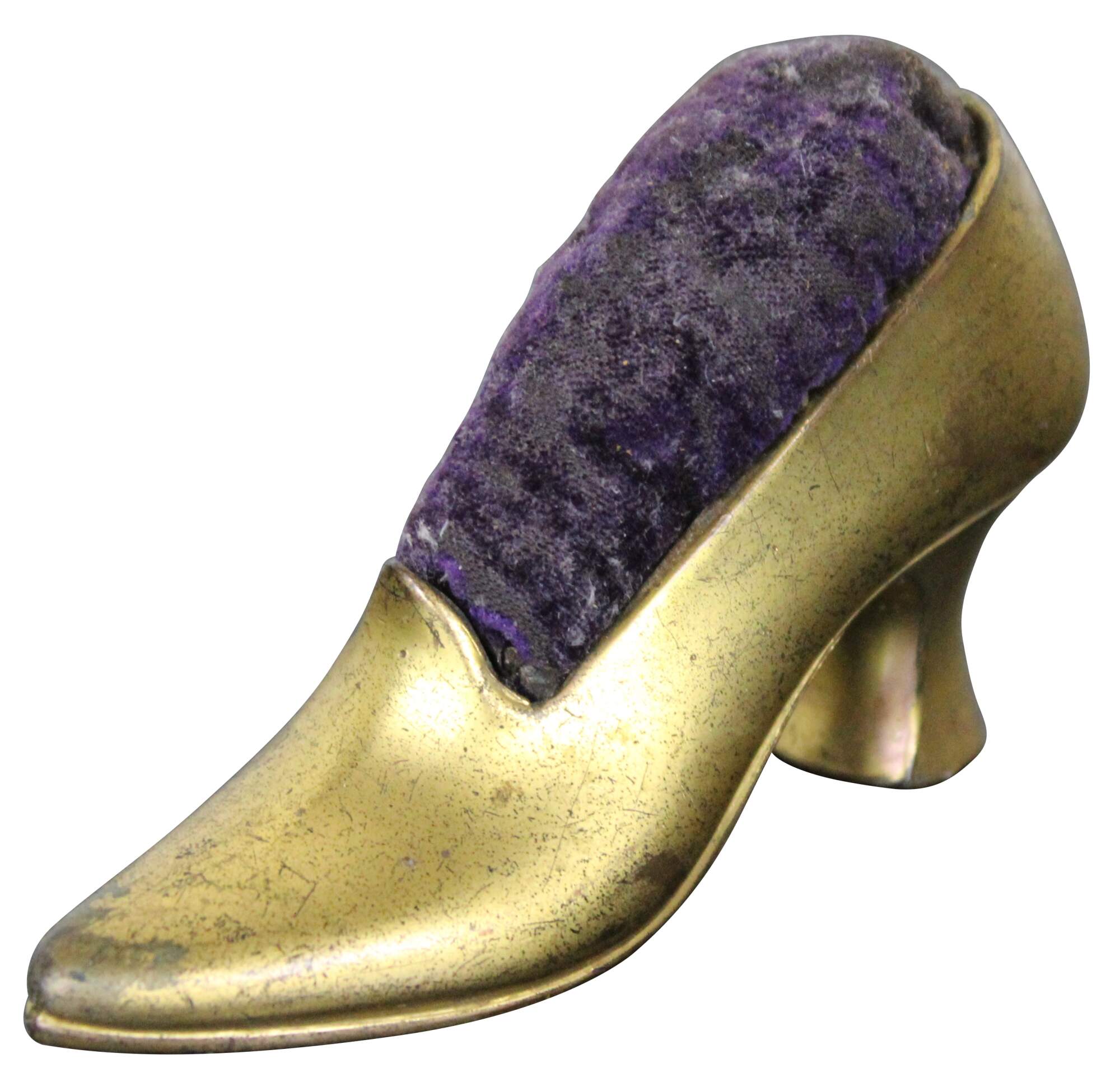 Antique Victorian saw dust filled, purple velvet pin cushion enclosed in a gilded brass miniature ladies shoe.
