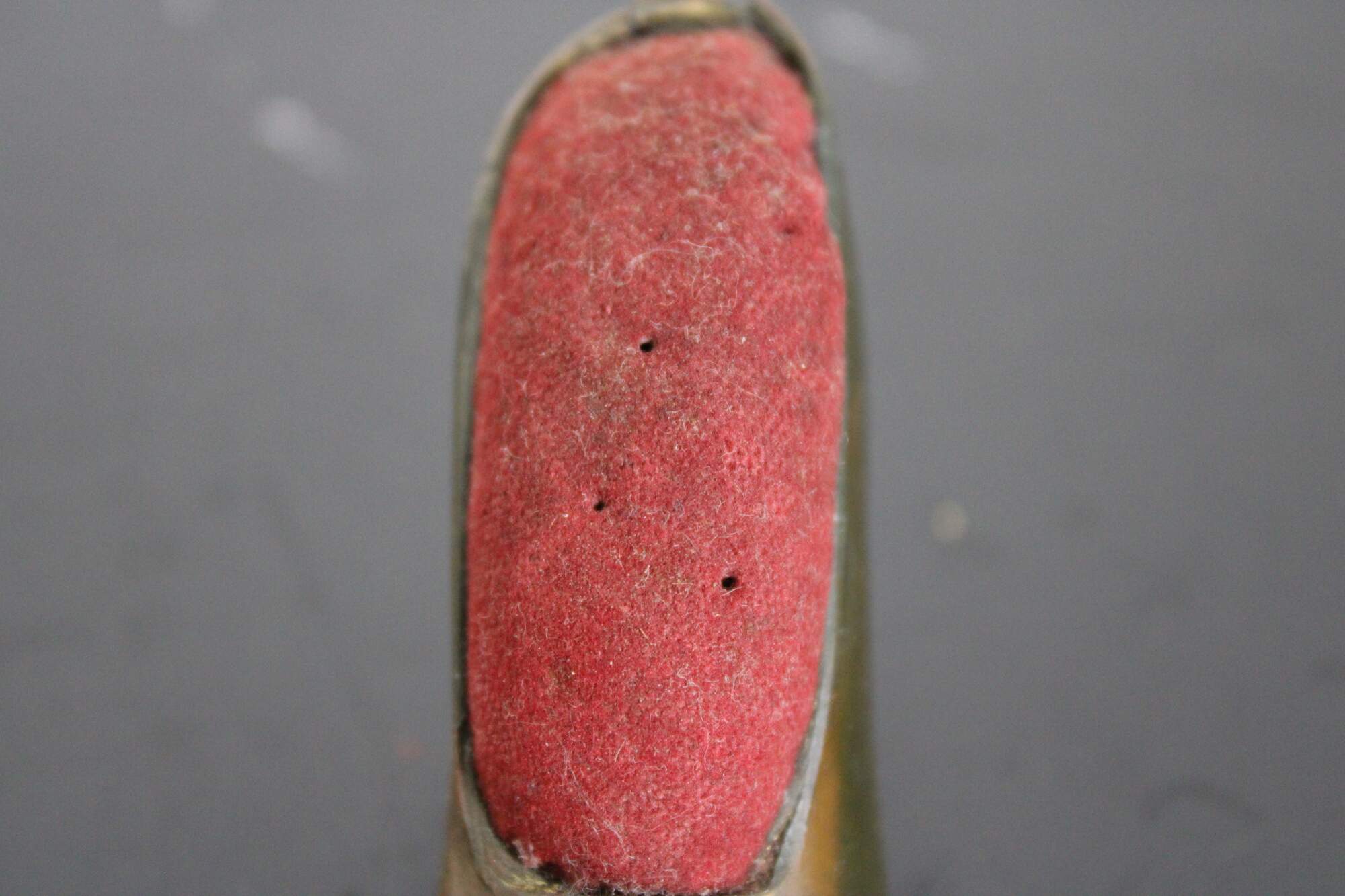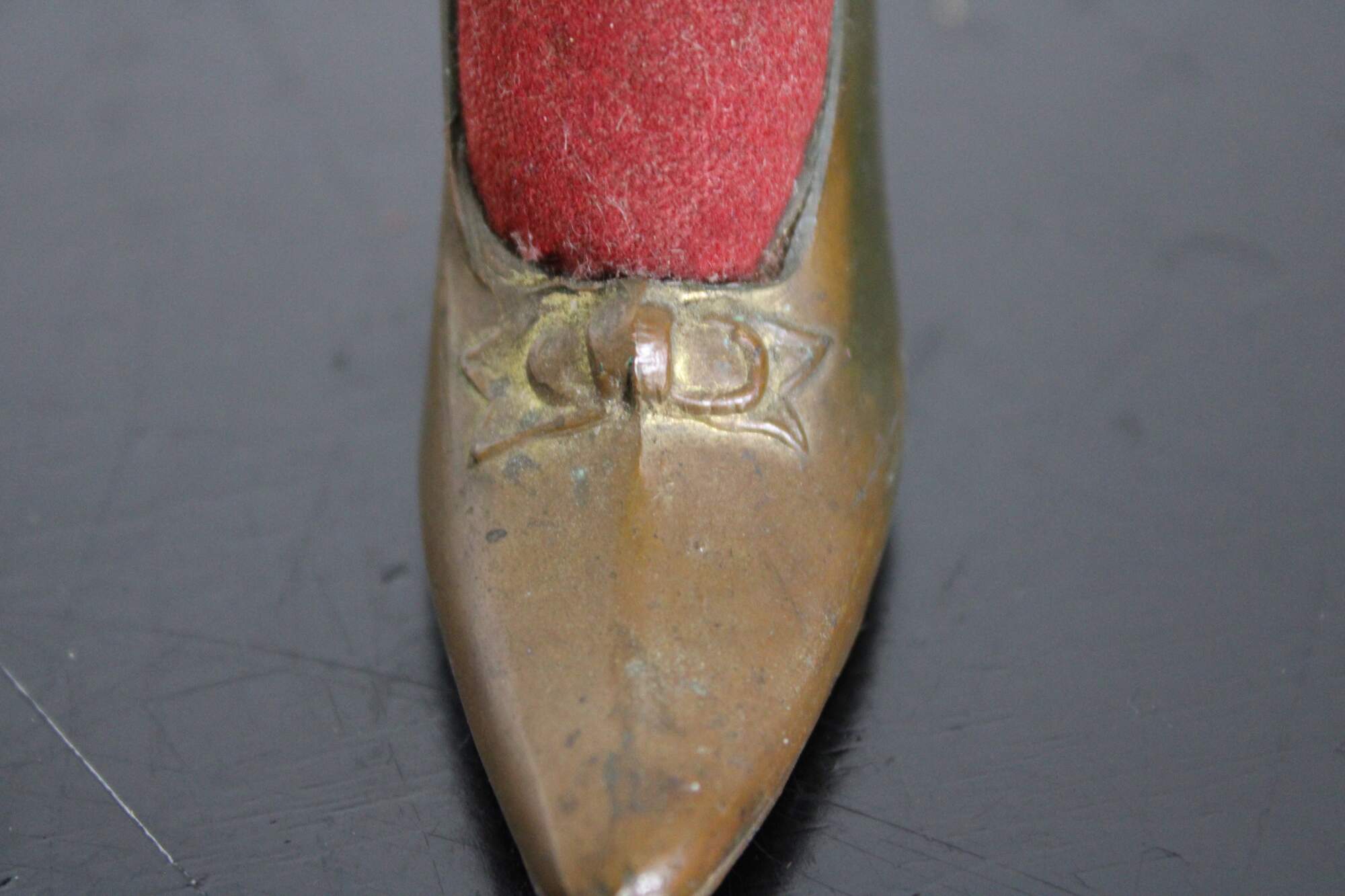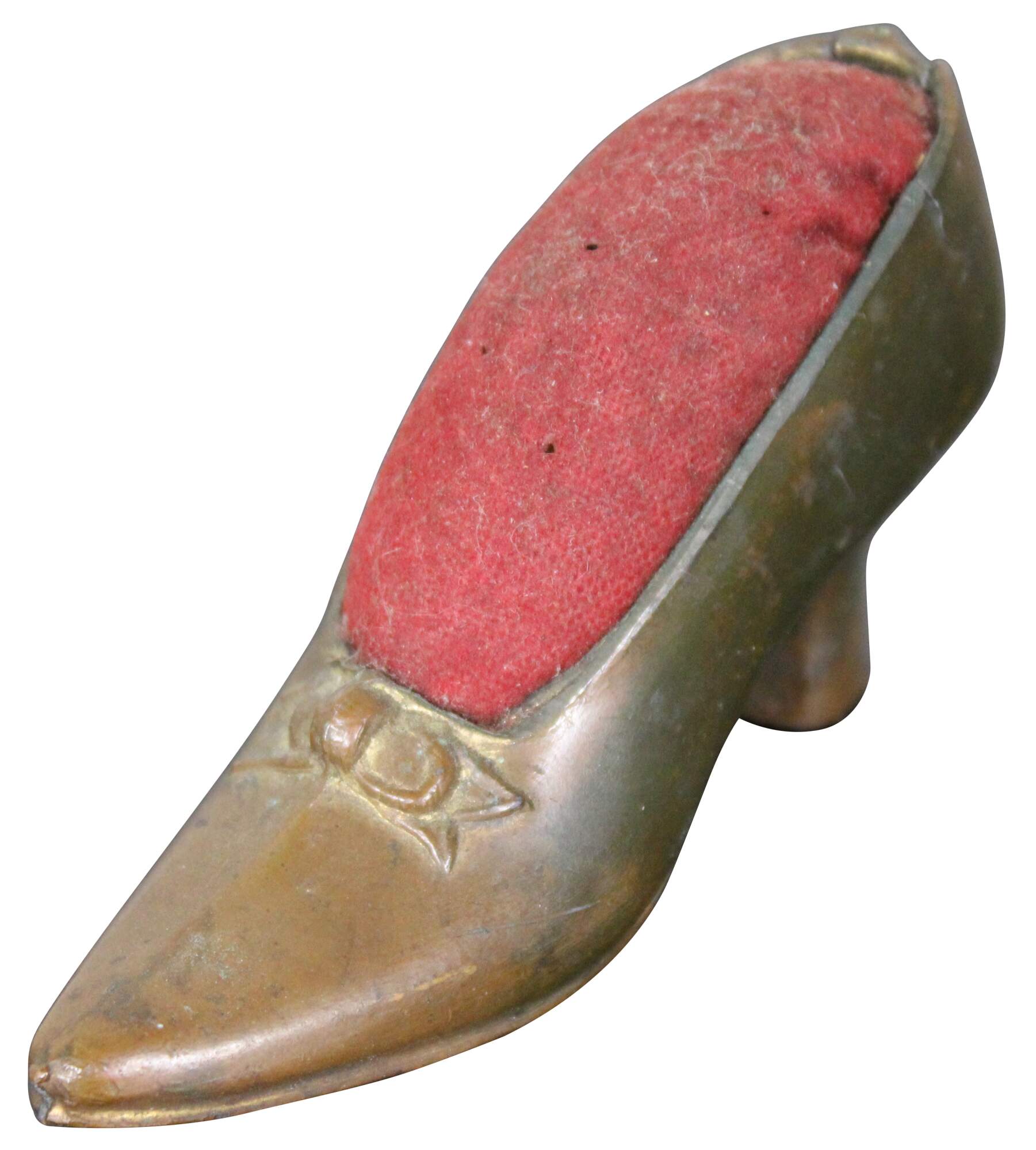 Antique Victorian red cloth pin cushion enclosed in a miniature copper ladies shoe. Marked USA.