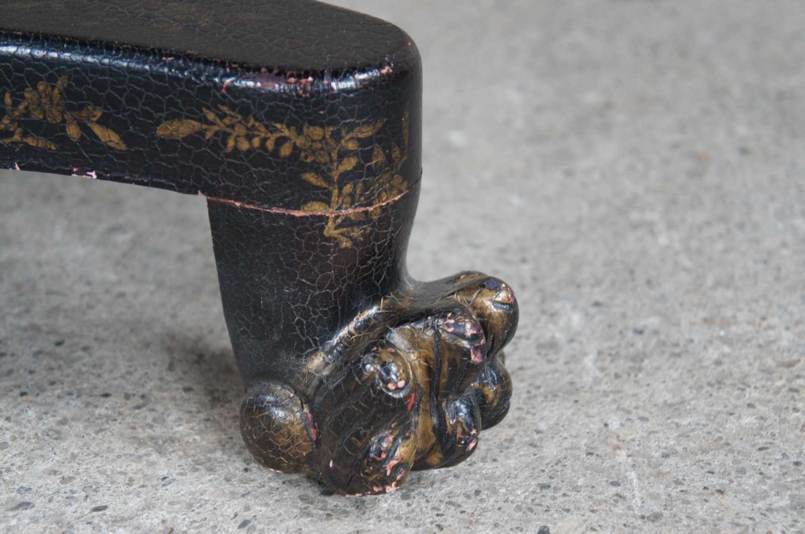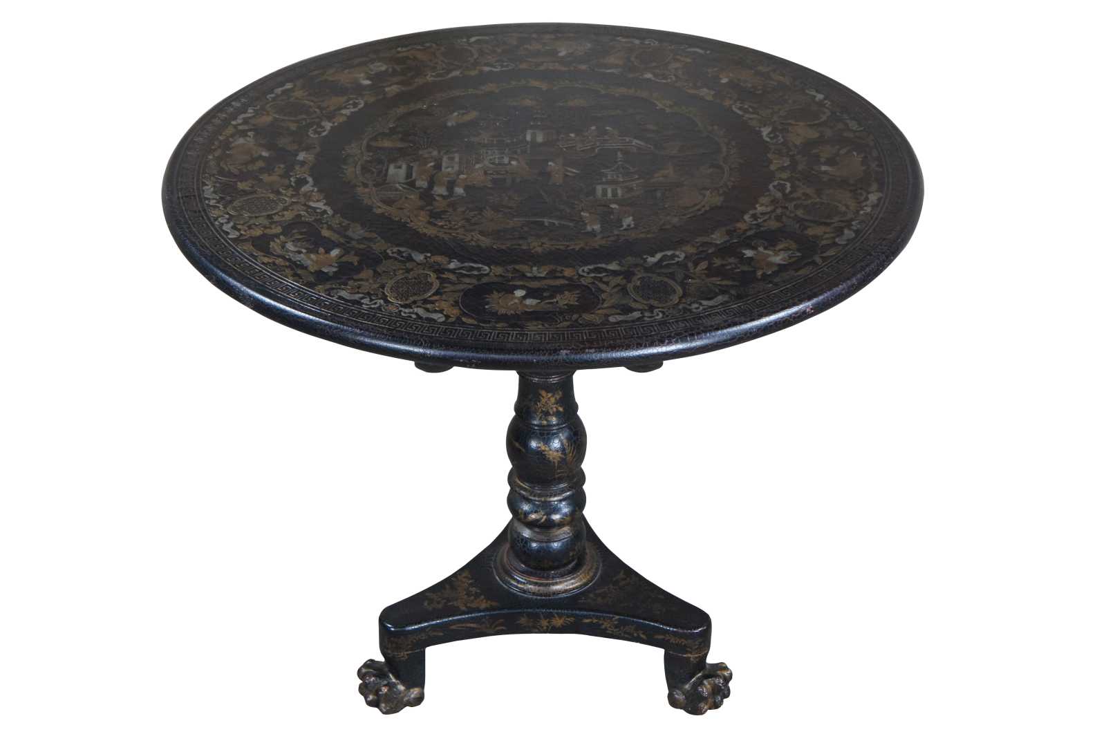Baker Furniture Company Historic Charleston Japanned tilt-top tea table, in the Regency or Empire style. Features a circular top with embossed gilt landscape and figural decoration, a secondary band of embossed gilt foliate and figural vignette decoration with a fret border, over a turned baluster that terminates into a triangular base with gilt decoration and gilt paw feet. Label beneath base.