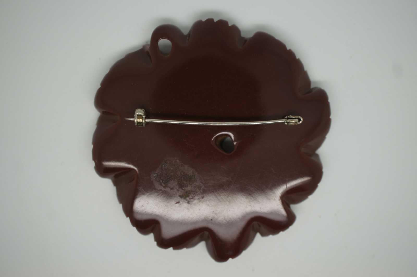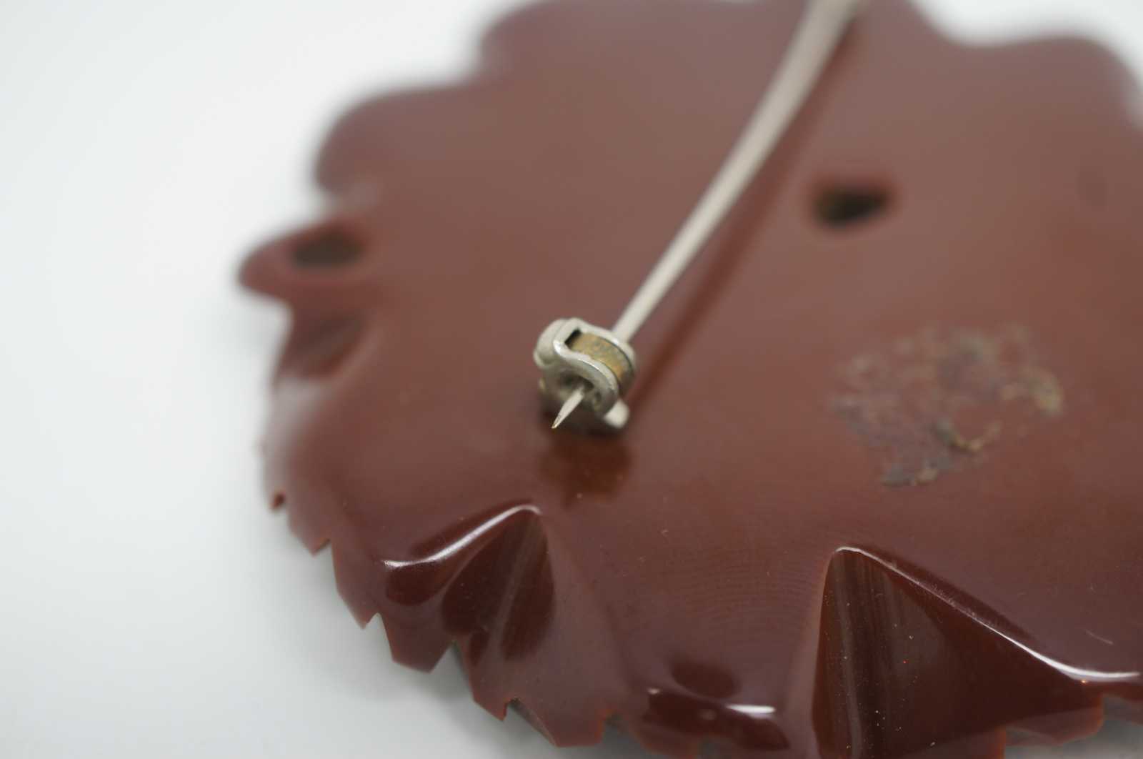 Early to mid 20th century rust brown bakelite pin, carved in the shape of veined autumn leaves.