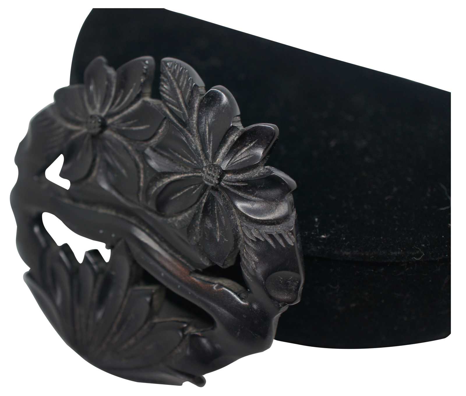 Early to mid century black floral bakelite mourning pin shaped like a basket of flowers.