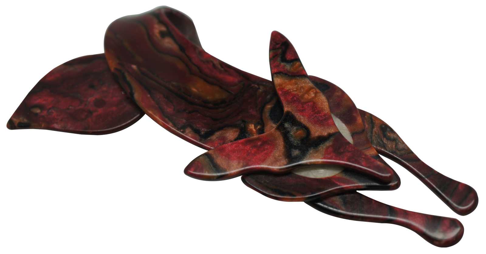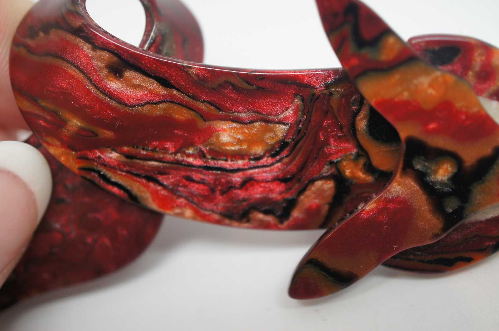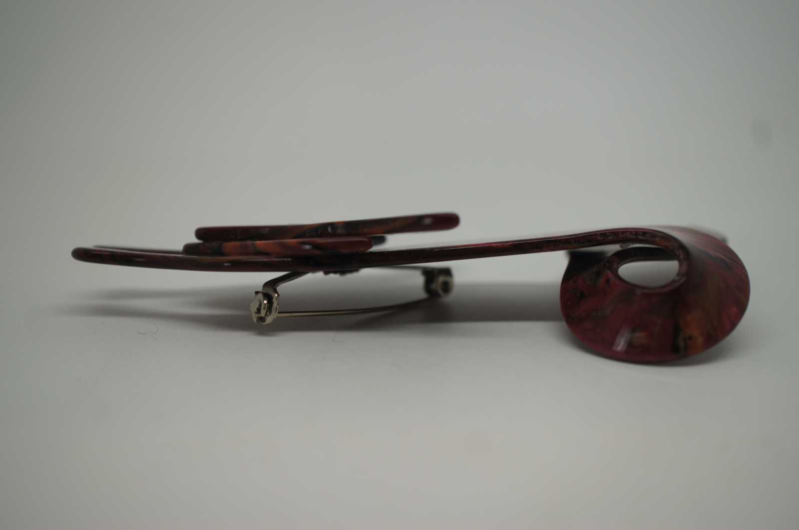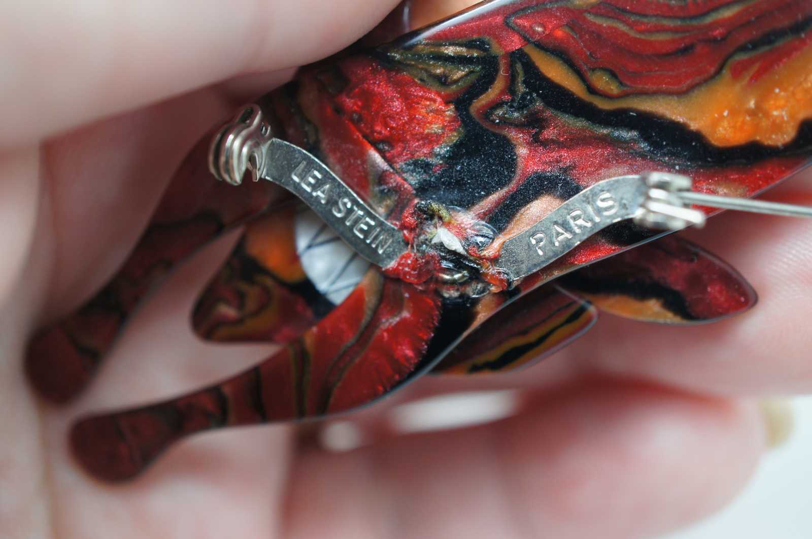 Vintage Lea Stein famous Renaud fox pin in swirling red, gold and black bakelite.