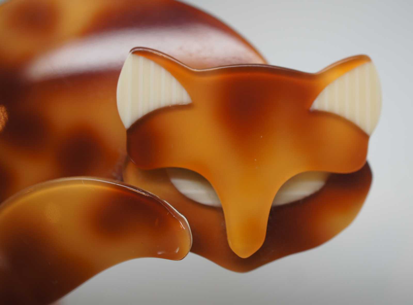 Vintage Lea Stein Gomina pin in the shape of a sleeping cat, made of orange tortoiseshell style bakelite with cream colored ears and eyes.
