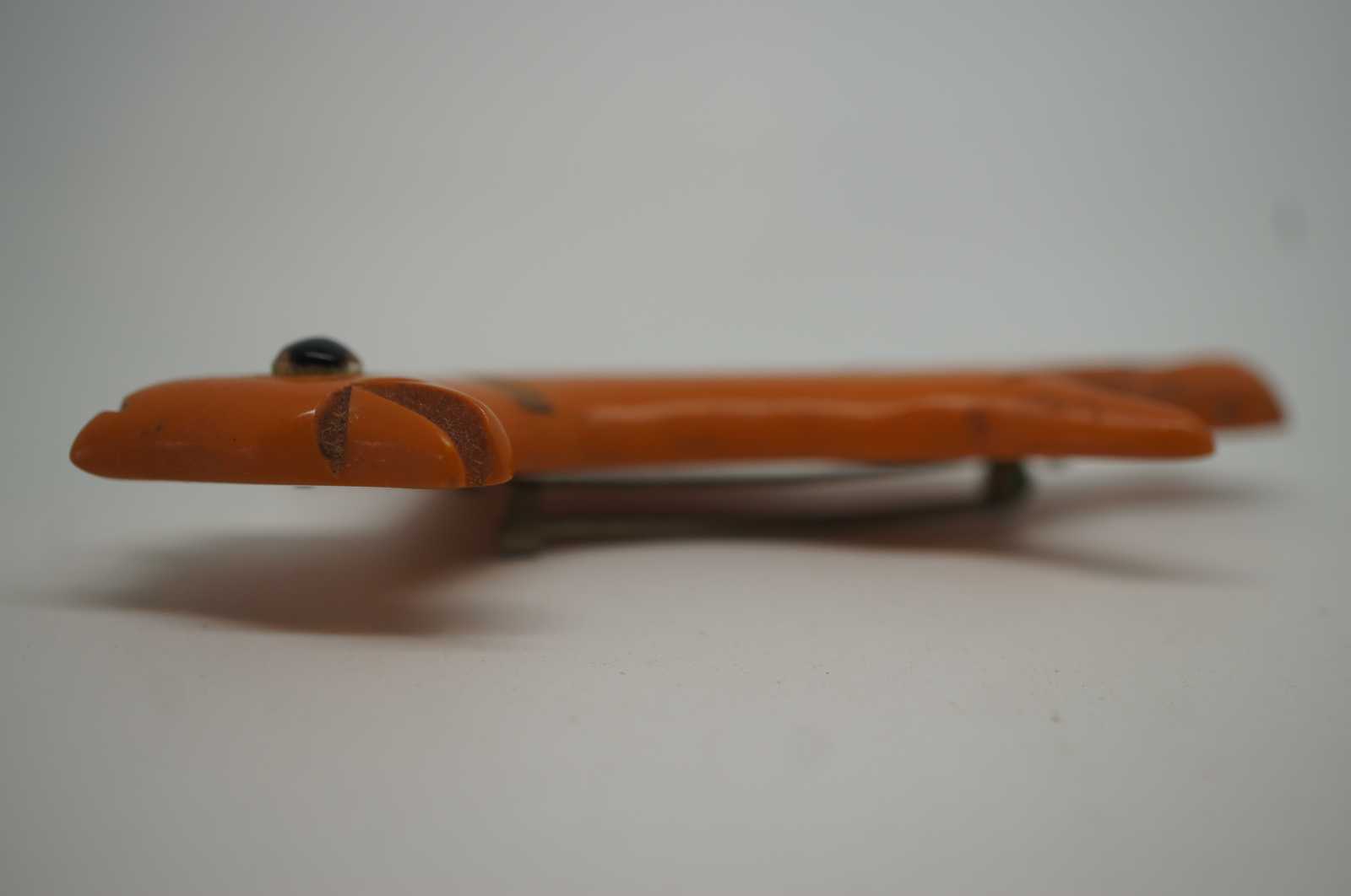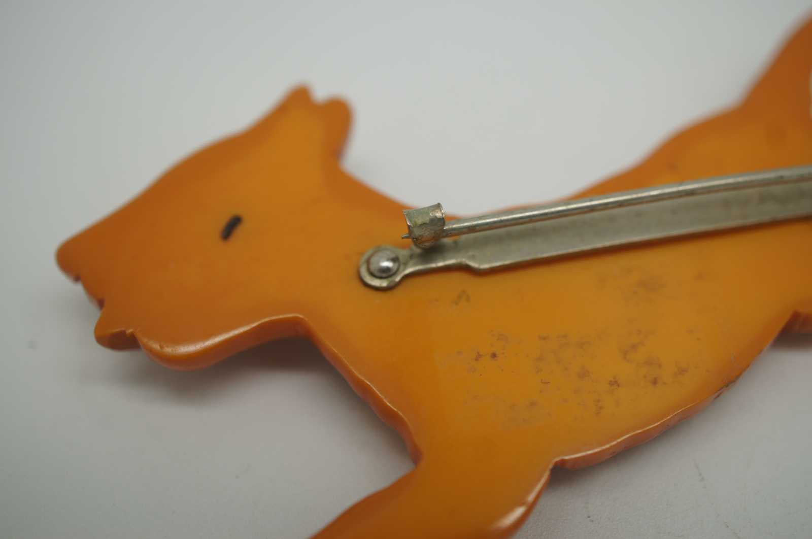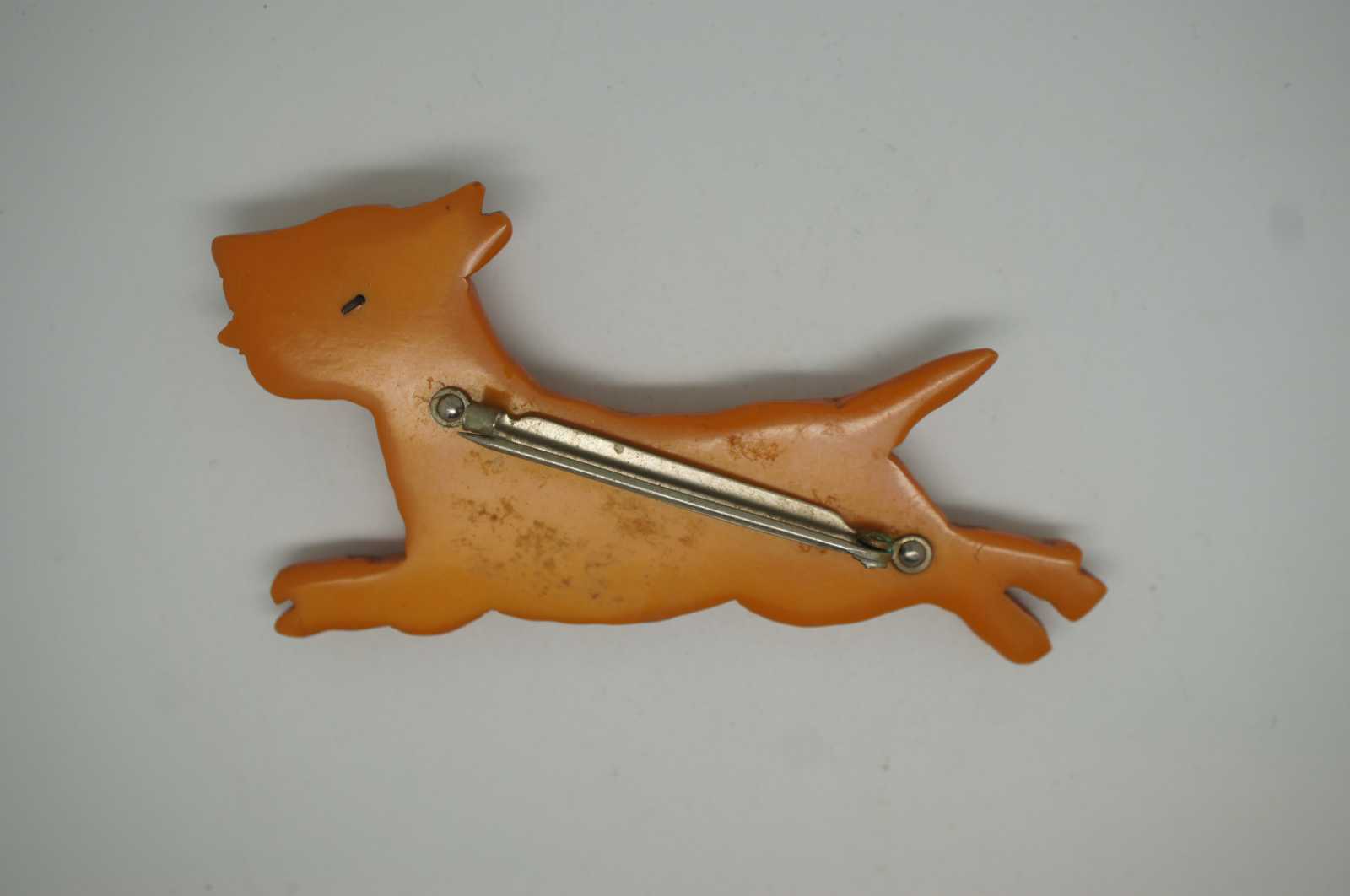 Early to mid 20th century orange bakelite pin in the shape of a running Scottish terrier with painted collar and glass eye.