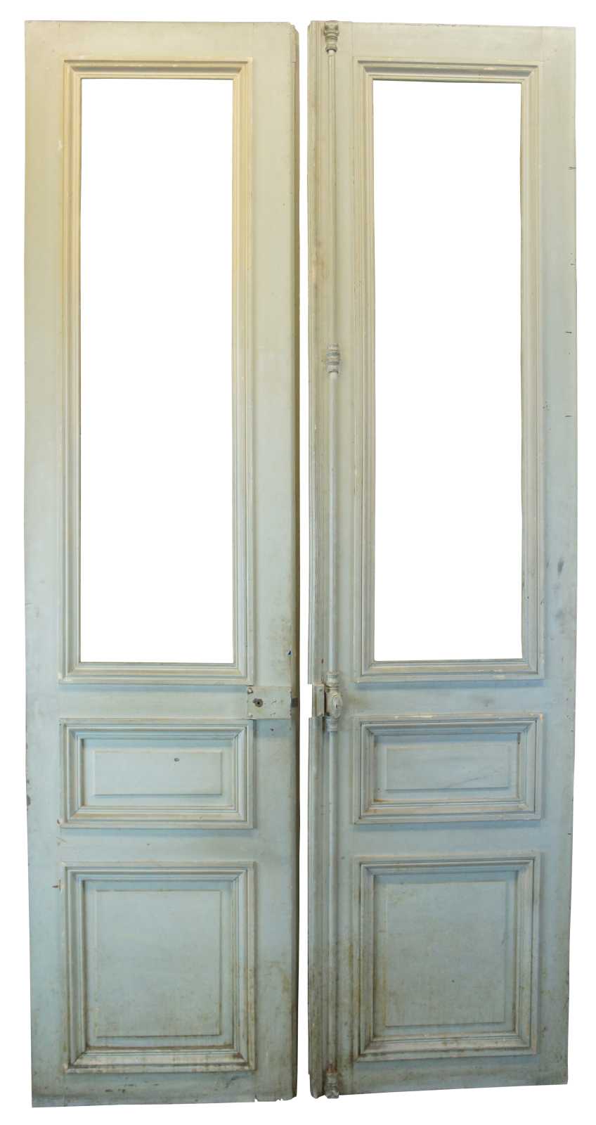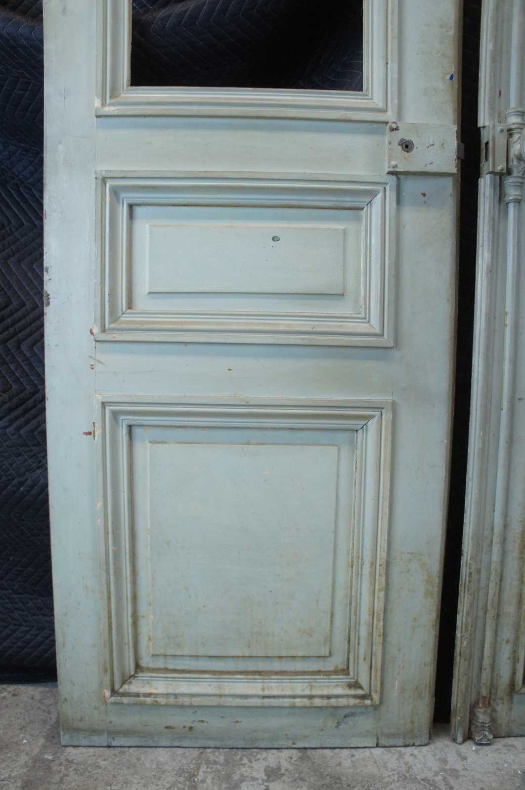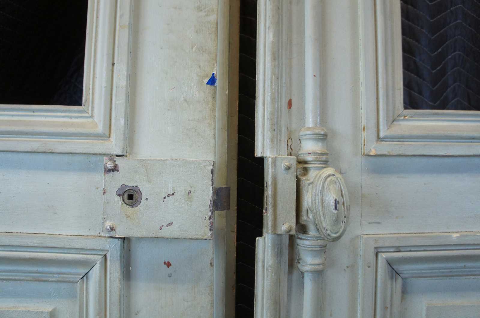Monumental late Victorian French double doors featuring paneling on both sides and an iron cremone bolt lock hardware.