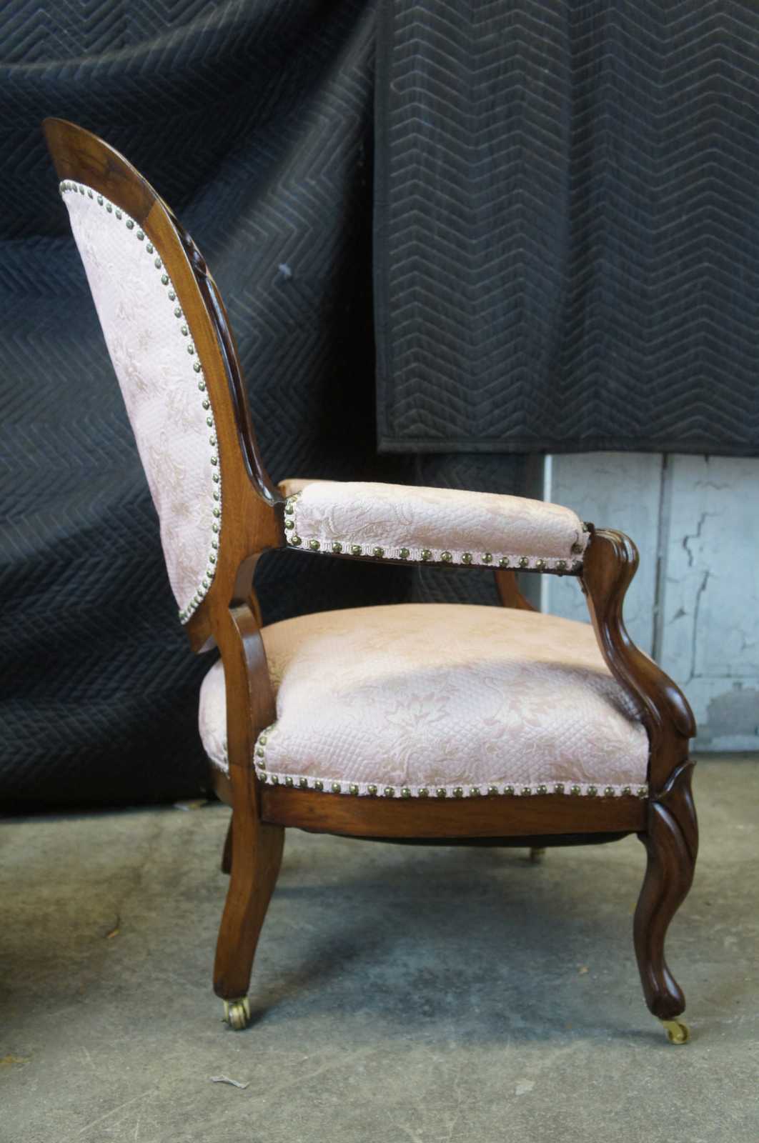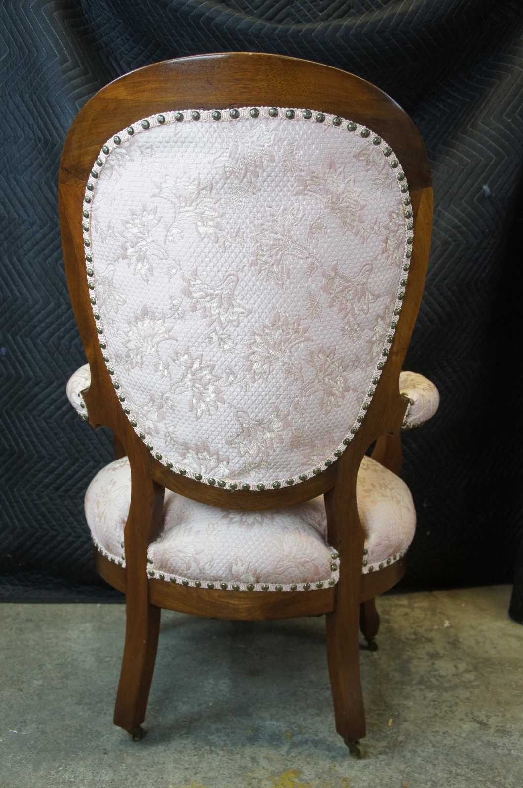 Pair of two antique Victorian his and hers parlor arm chairs. Made of walnut featuring serpentine form with blush pink floral upholstery, tufted balloon backs, padded arms, nailhead trim, and brass swivel castors.