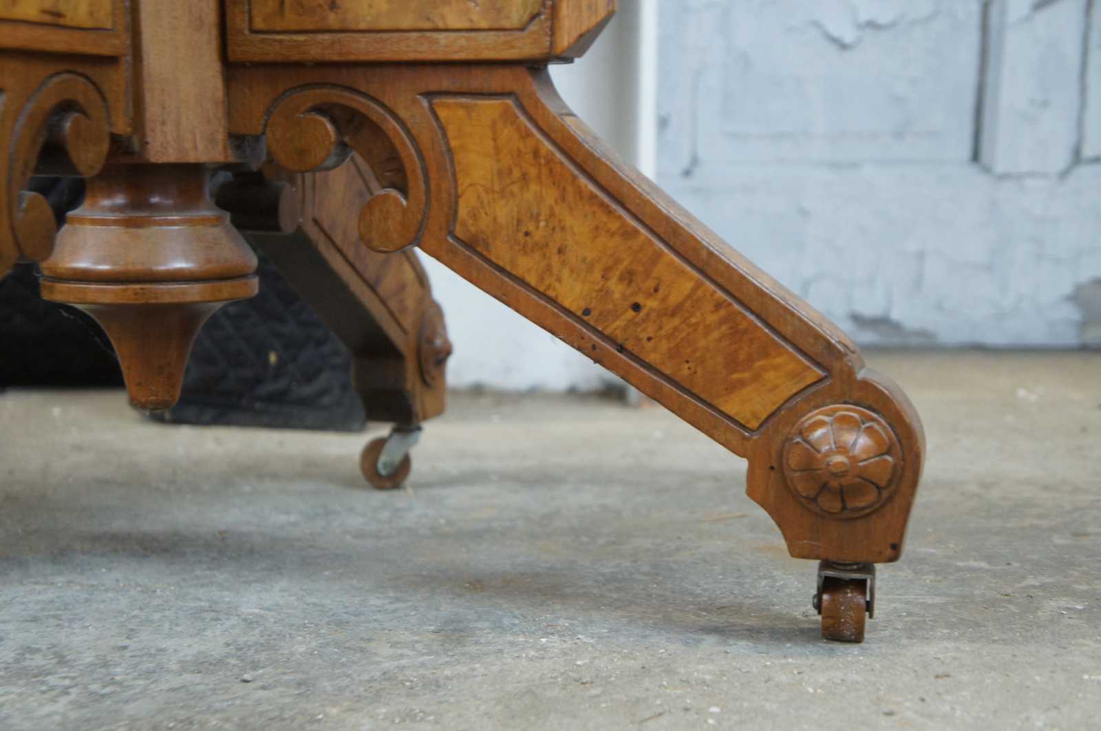 Late 19th Century Antique Eastlake Victorian parlor side or center table. A grande rectangular form made of walnut featuring burl accents, marble top, and a turned center support surrounded by carved panels.