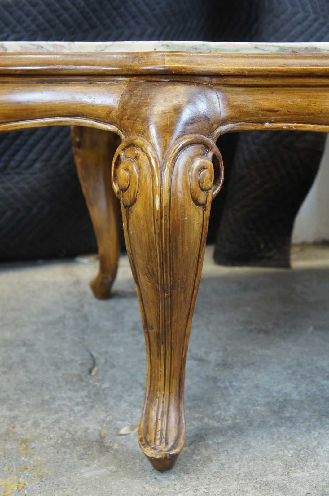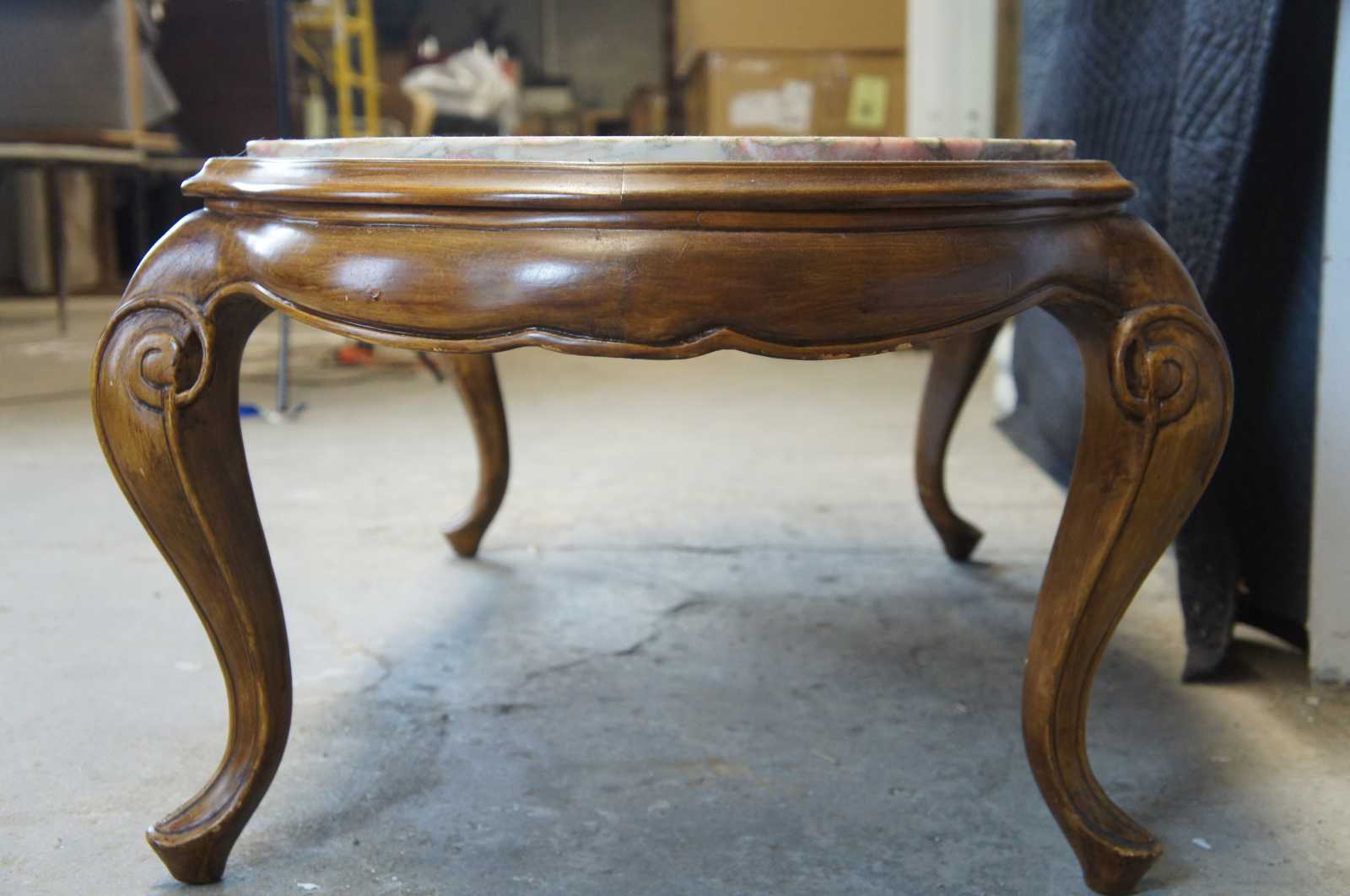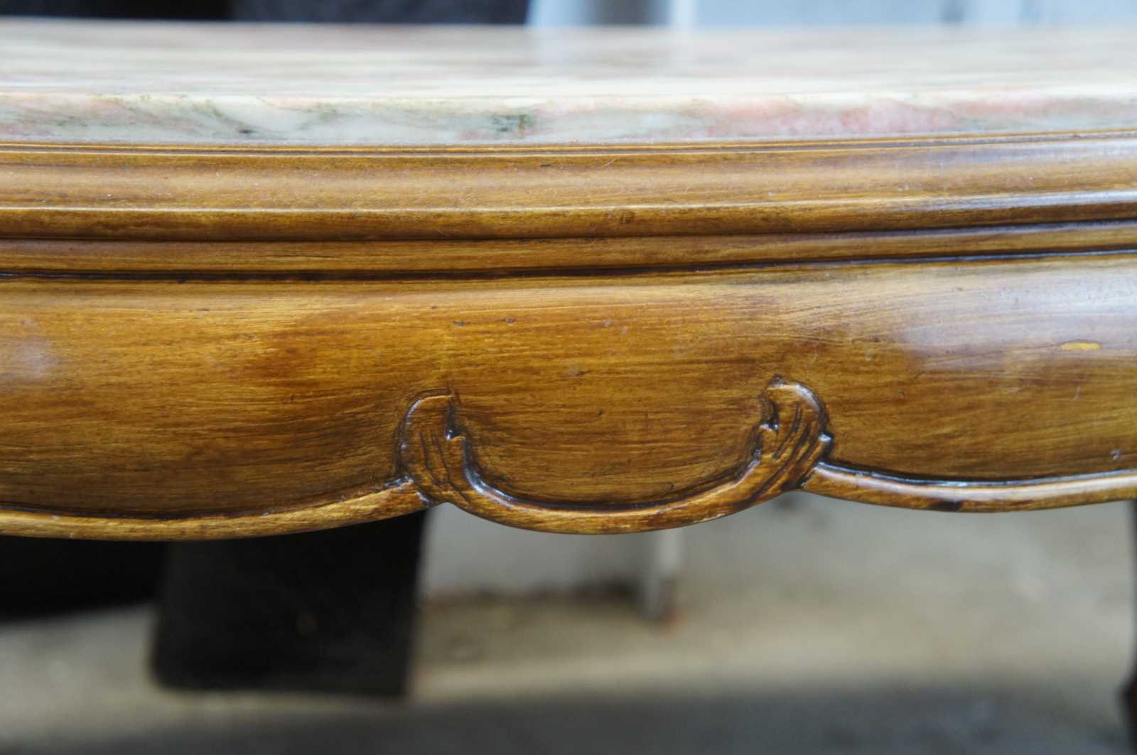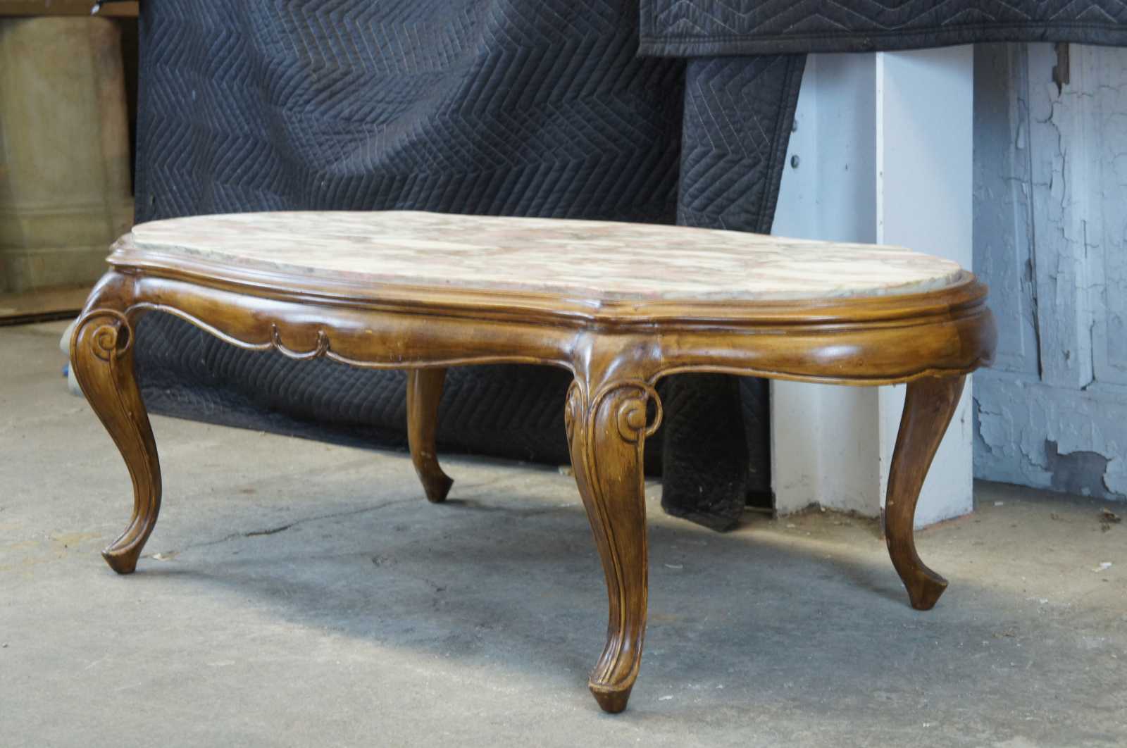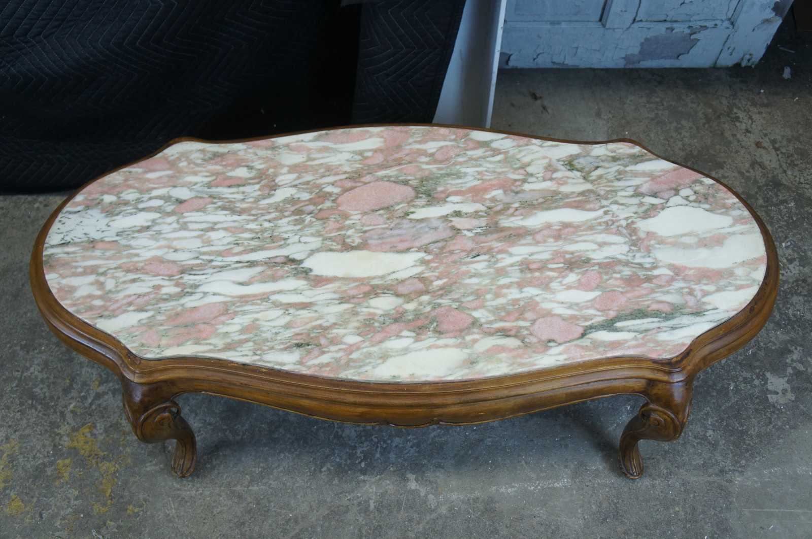 Antique French Provincial coffee table. Made of walnut and pink marble featuring oval serpentine form with scrolled and beveled accents.