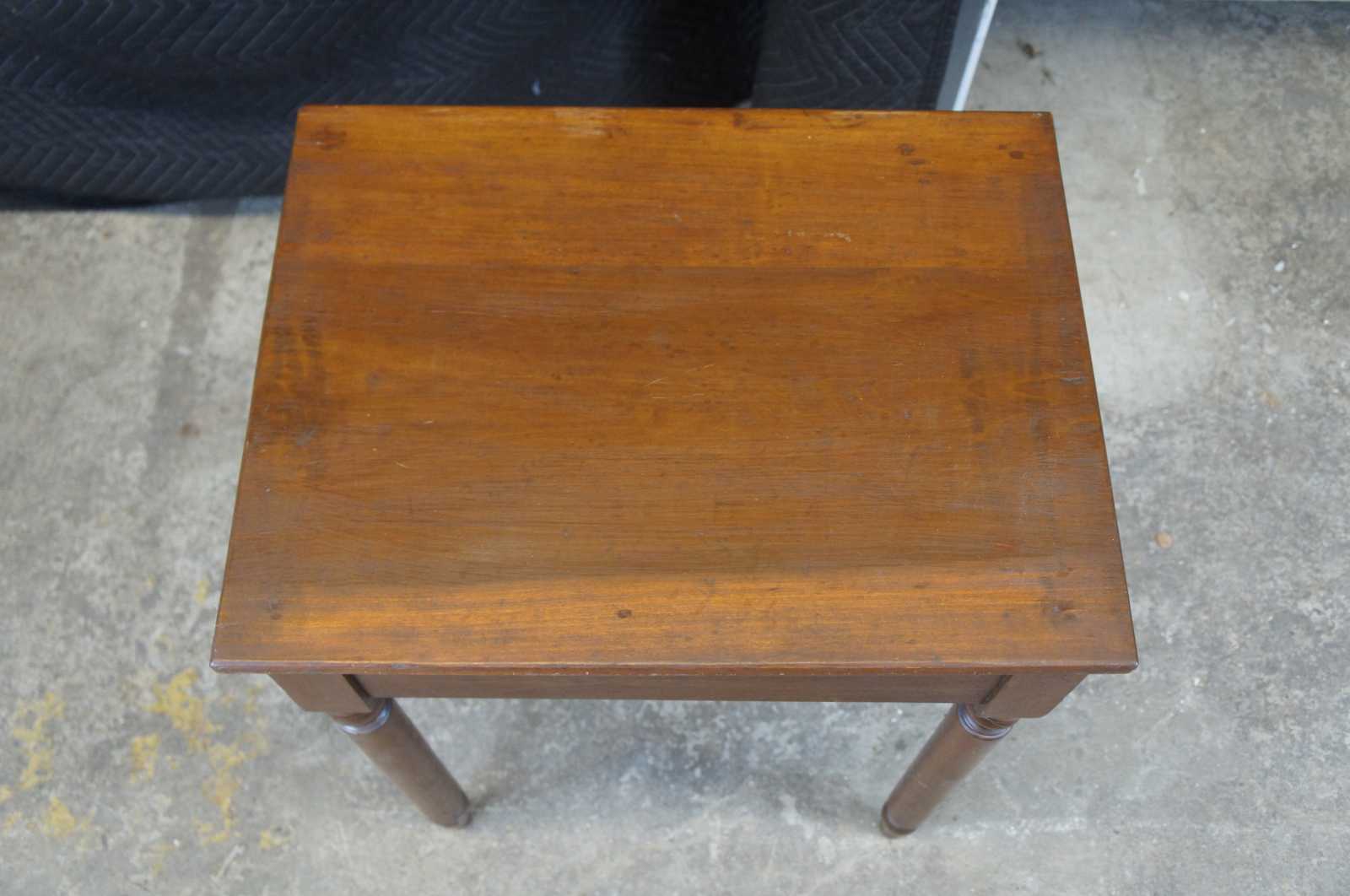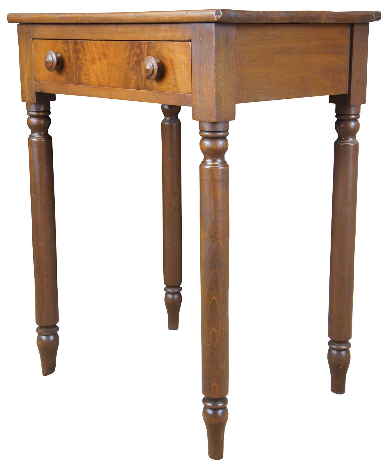 Antique Early American side accent or bedside table. Made of flamed mahogany featuring square form, one upper drawer and turned legs.