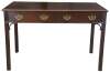 Vintage Hekman writing desk. Made of mahogany featuring rectangular form with tooled leather top, two drawers with brass hardware, and square form legs with a fluted edges.