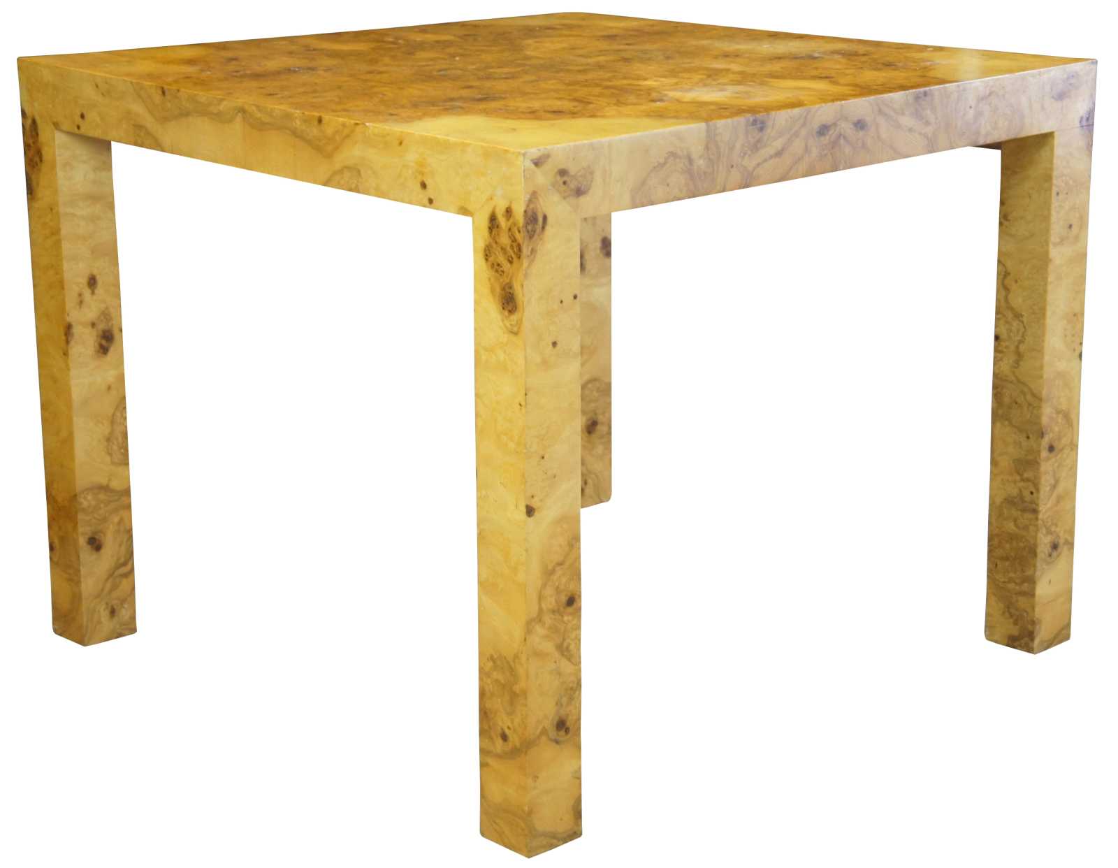 Circa 1970s Olive Ash Burl square form Parson style dining or card table. Inspired by the design elements of Milo Baughman from the 1960s. Made from pine with matchbook veneer. A handmade original custom order made by Ronald E. Wampler. Now R.E. Wampler & Son out of bellbrook, Ohio.
