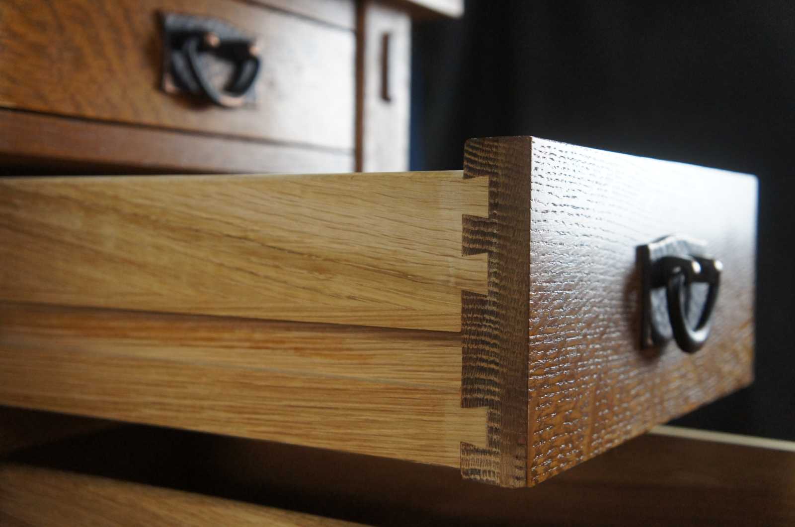 Central drawer (made with solid drawer carcasses joined with lap and through dovetails) with build in pen holder