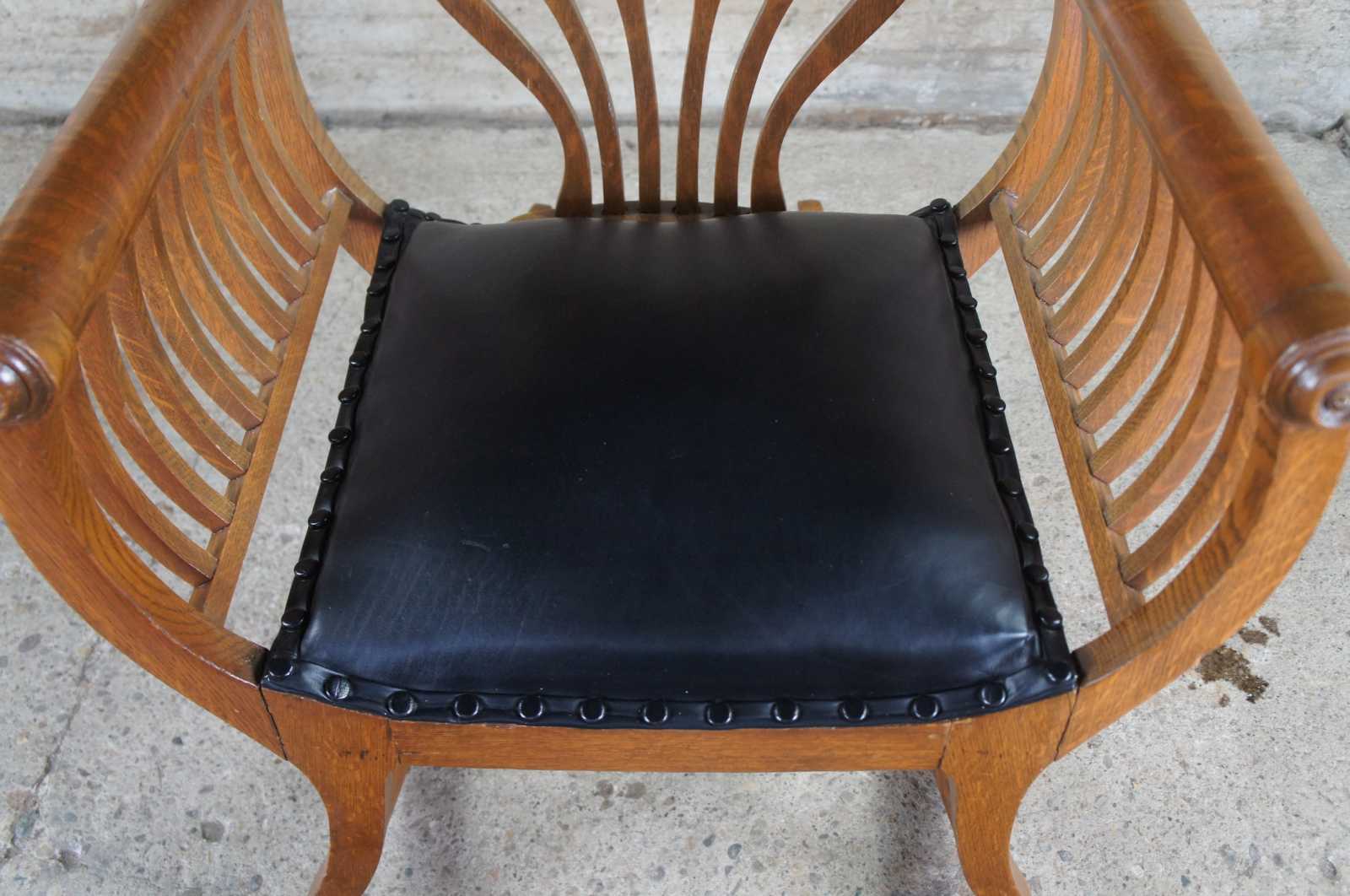 Antique Victorian era quartersawn oak barrel or saddle seat rocker featuring serpentine form for slatted accents, tufted black leather with nailhead trim.