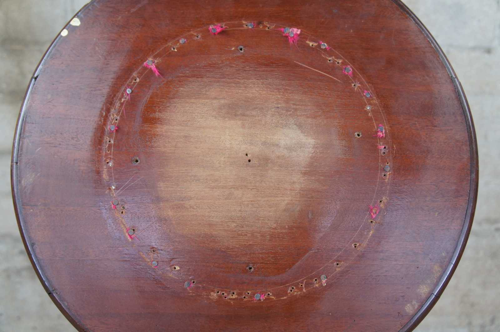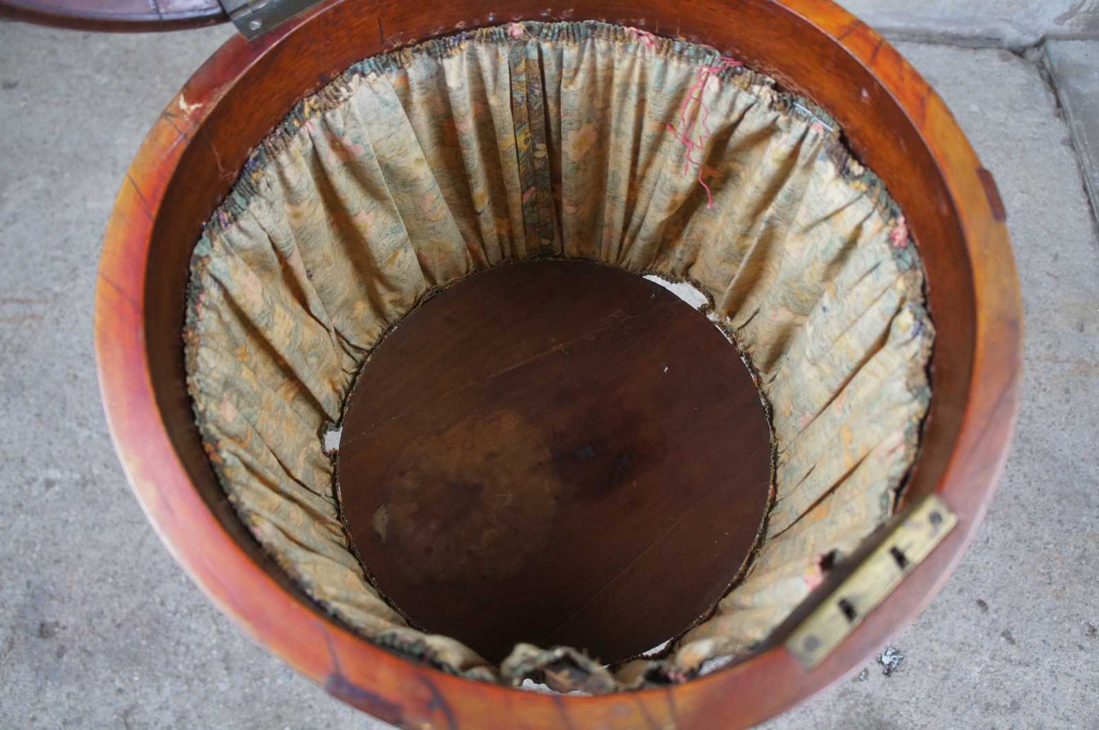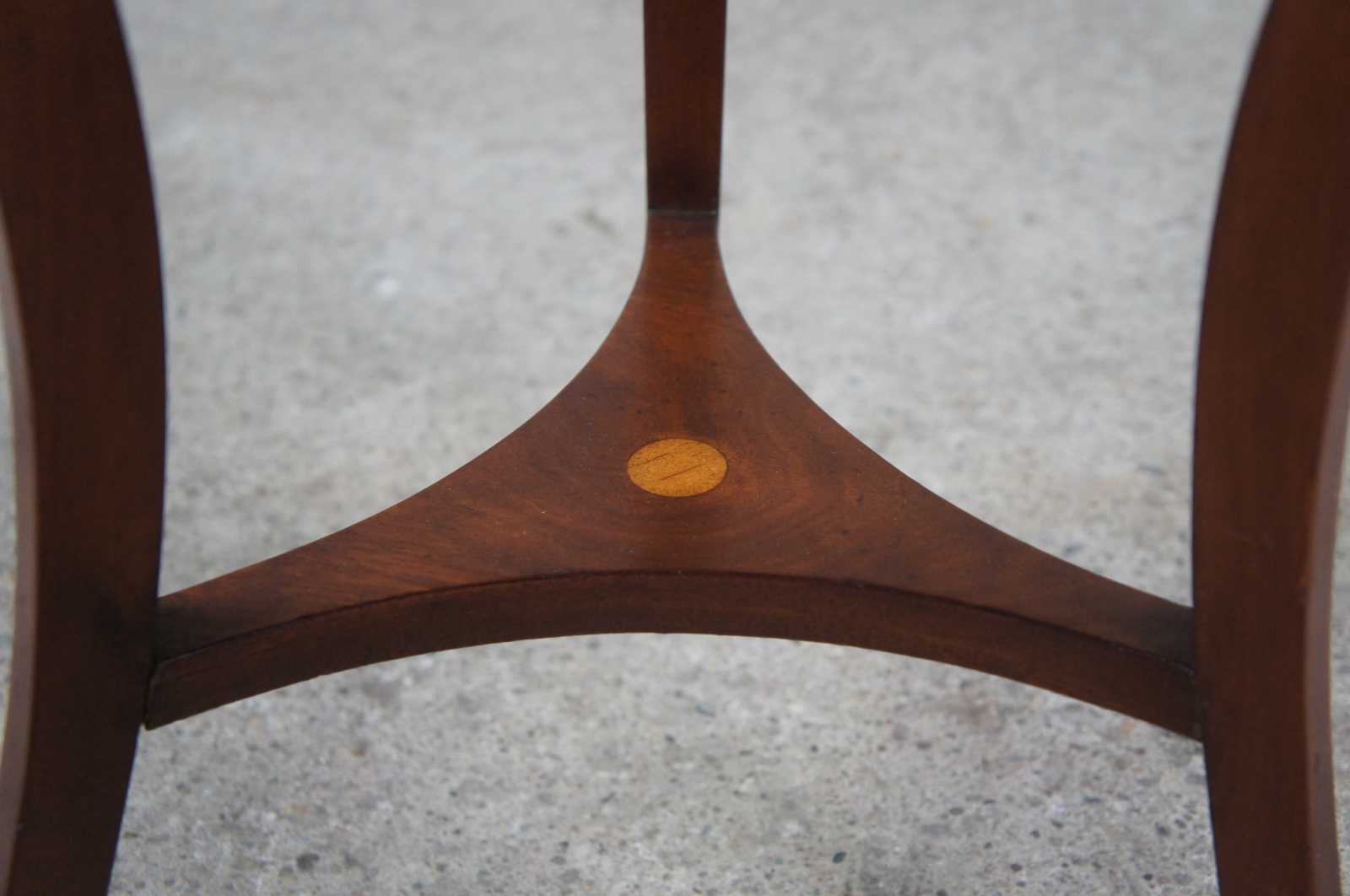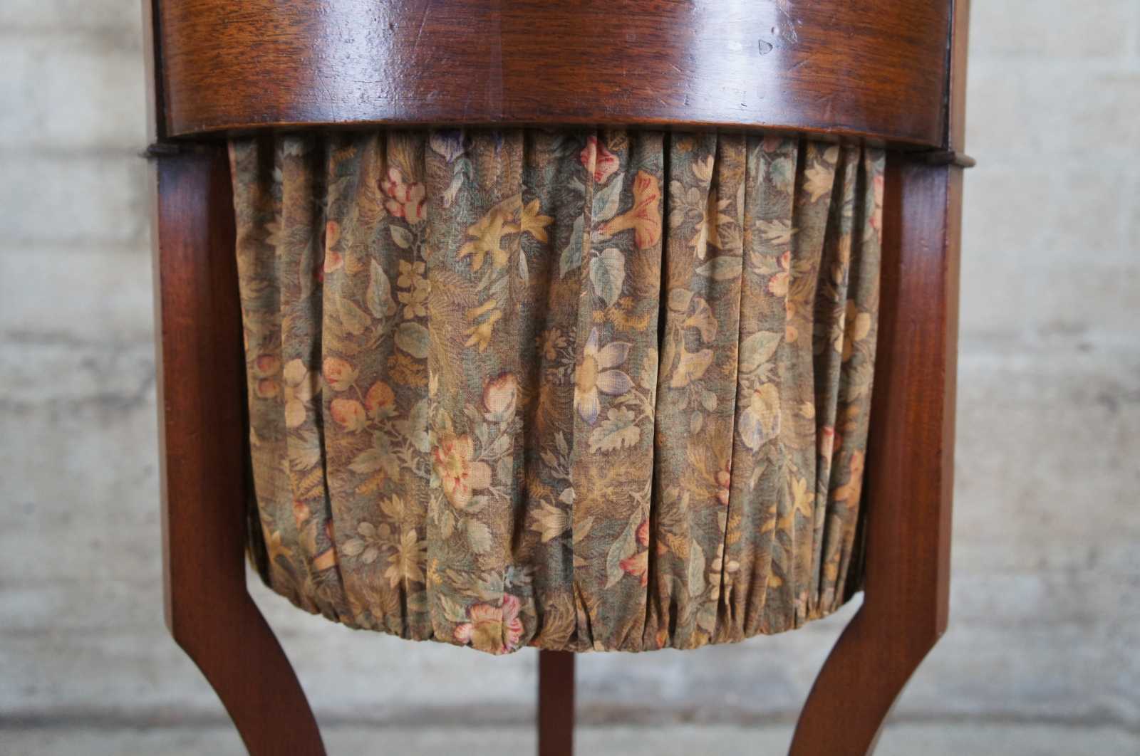 An exceptional late 18th century Hepplewhite Sewing Table. Made from mahogany with a round-form, floral upholstered box, fruitwood inlay and galleried top. The table is supported by elongated square form saber legs, connected by a triangular stretcher. Purchased in England and shipped stateside in the 1970s.