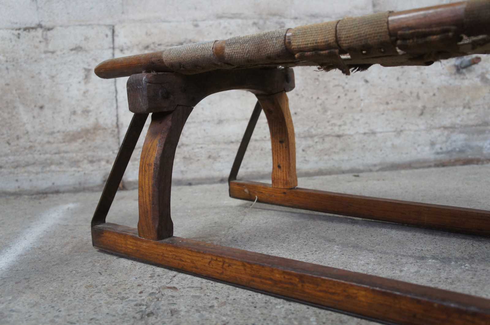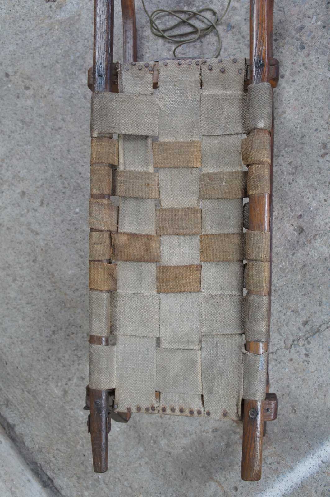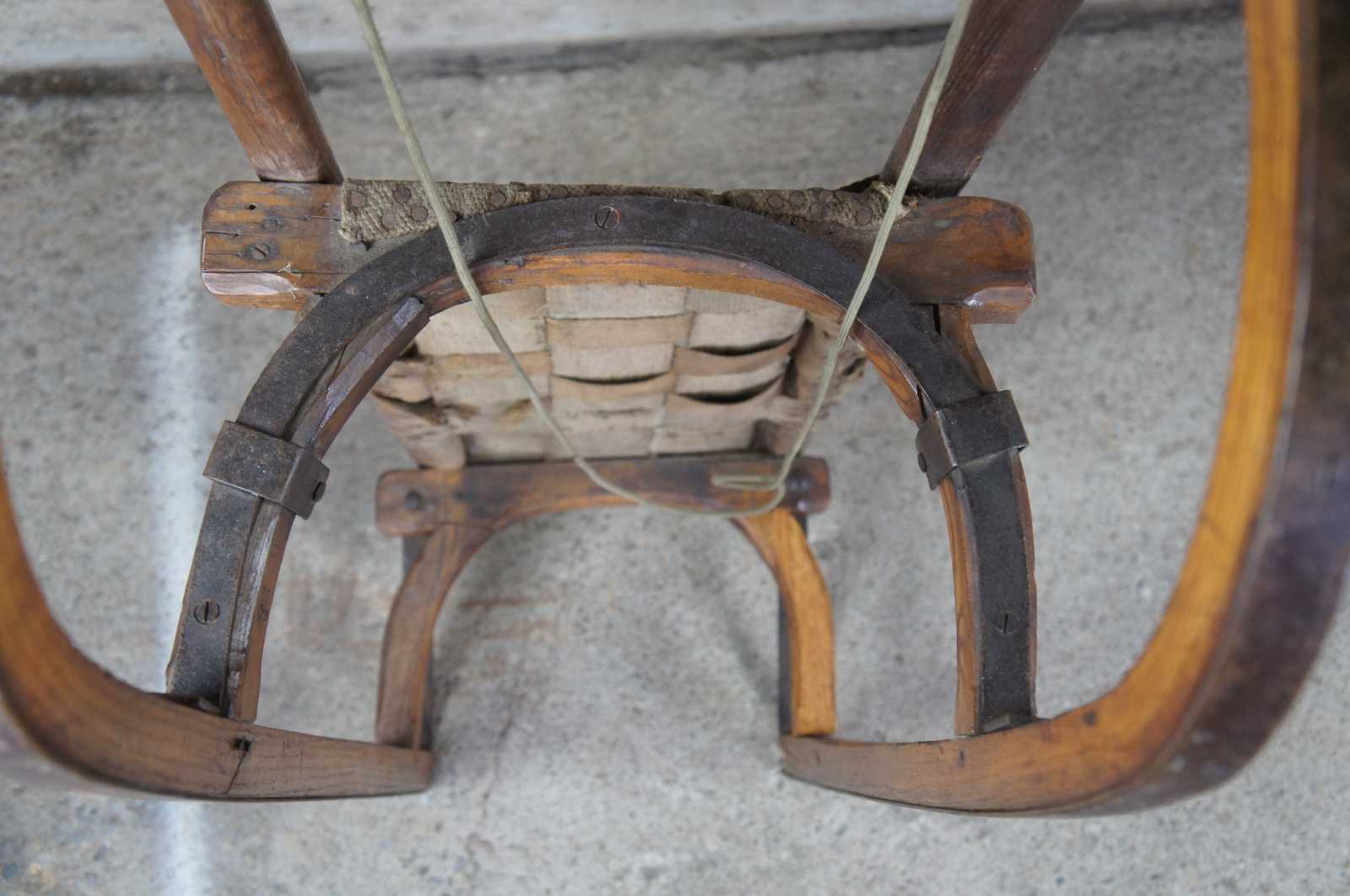 Antique Norwegian sled. Made of oak with bentwood Grindelwalder form featuring wrought iron supports with woven burlap seat.