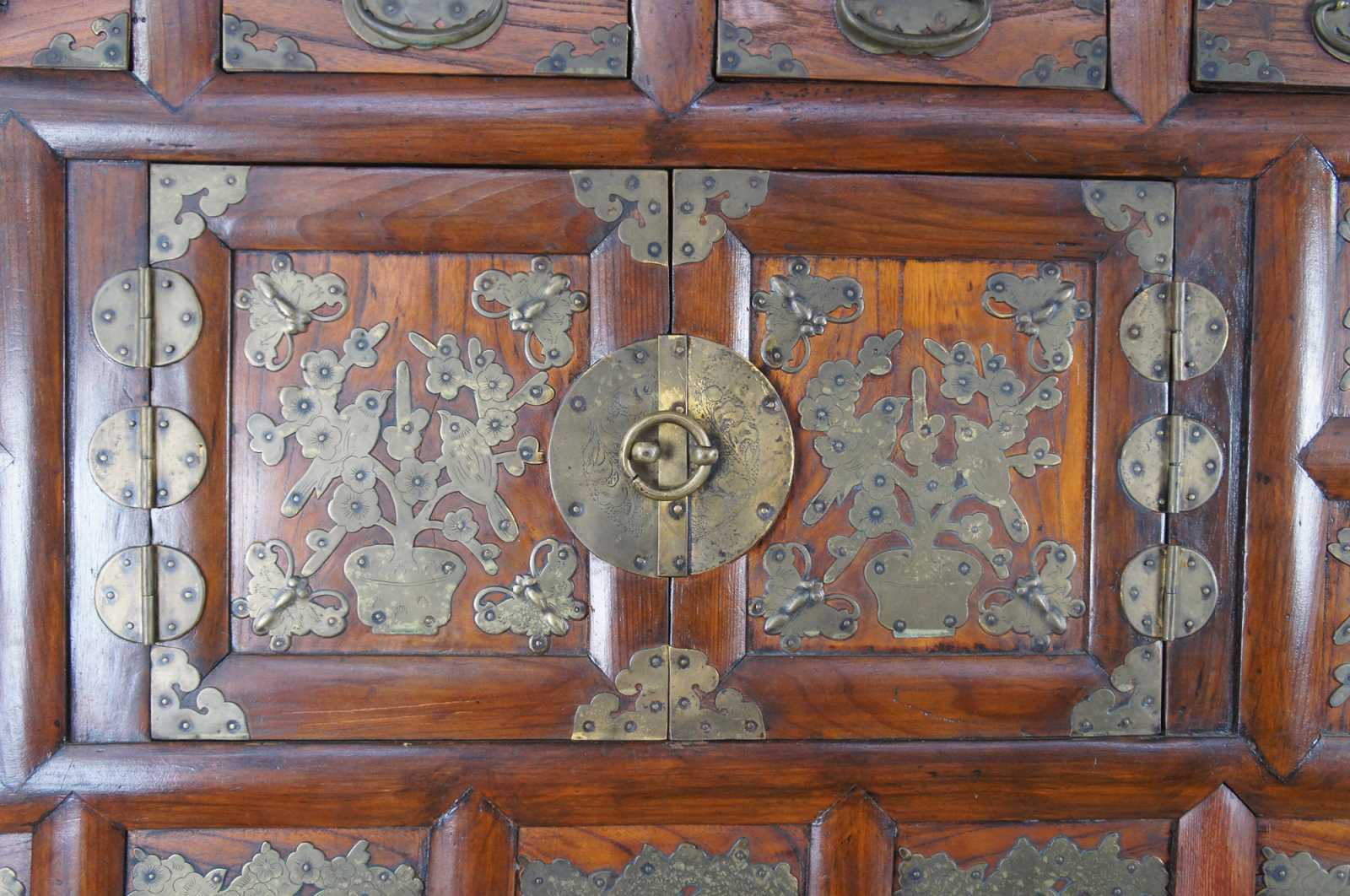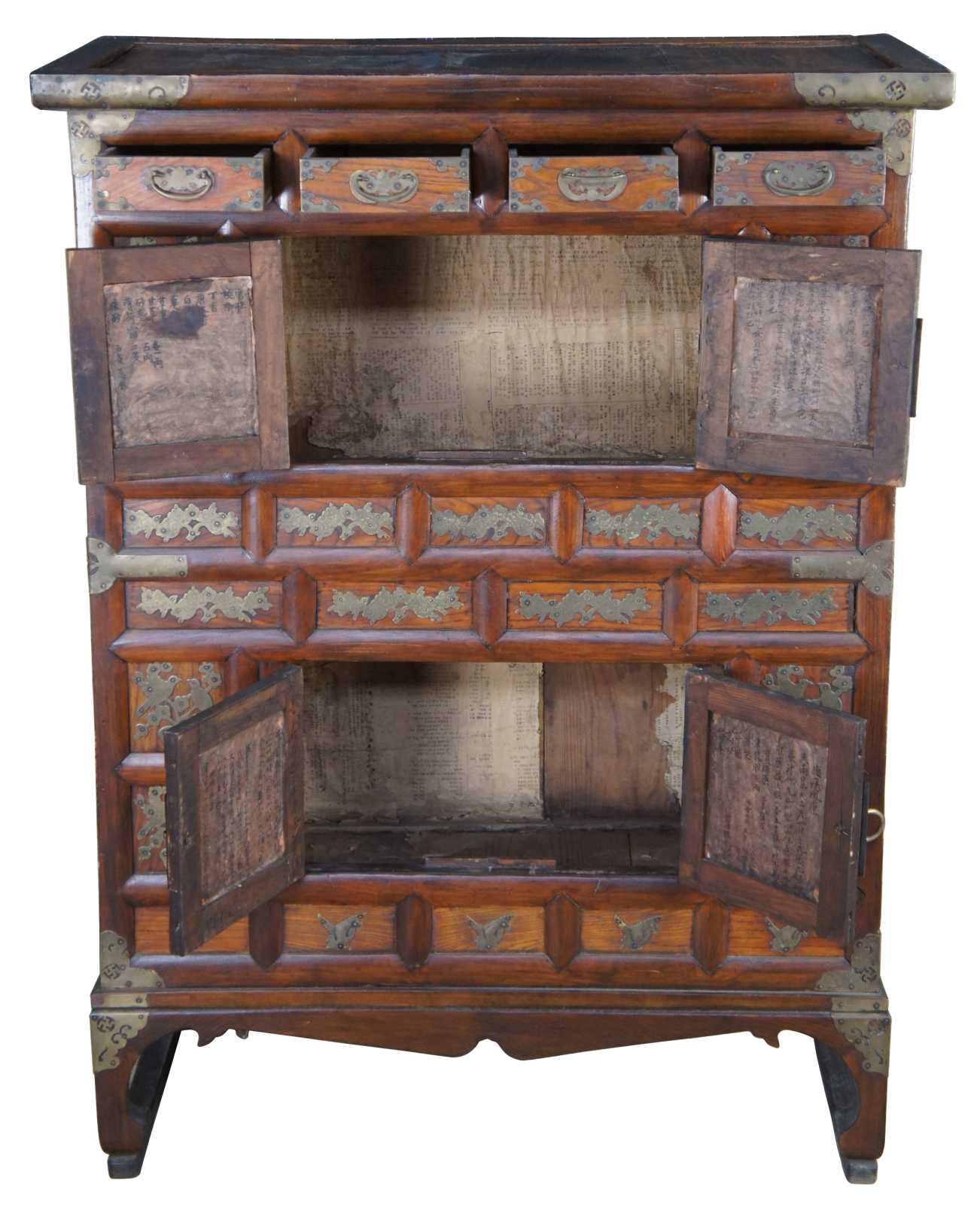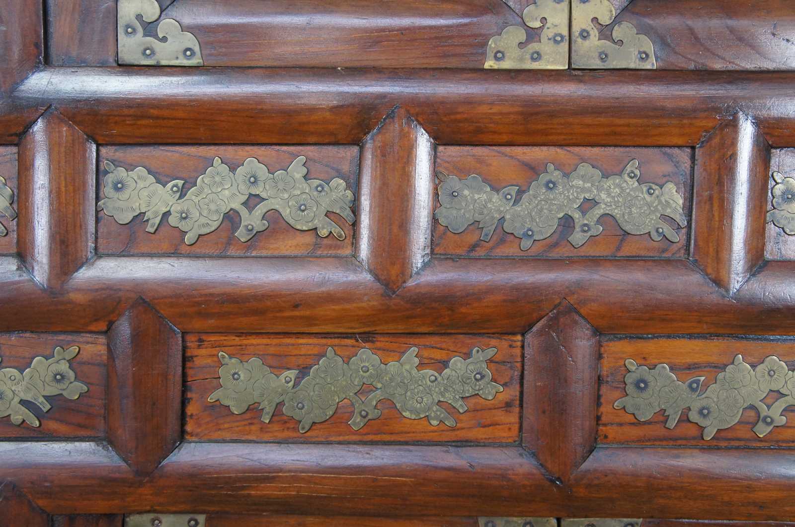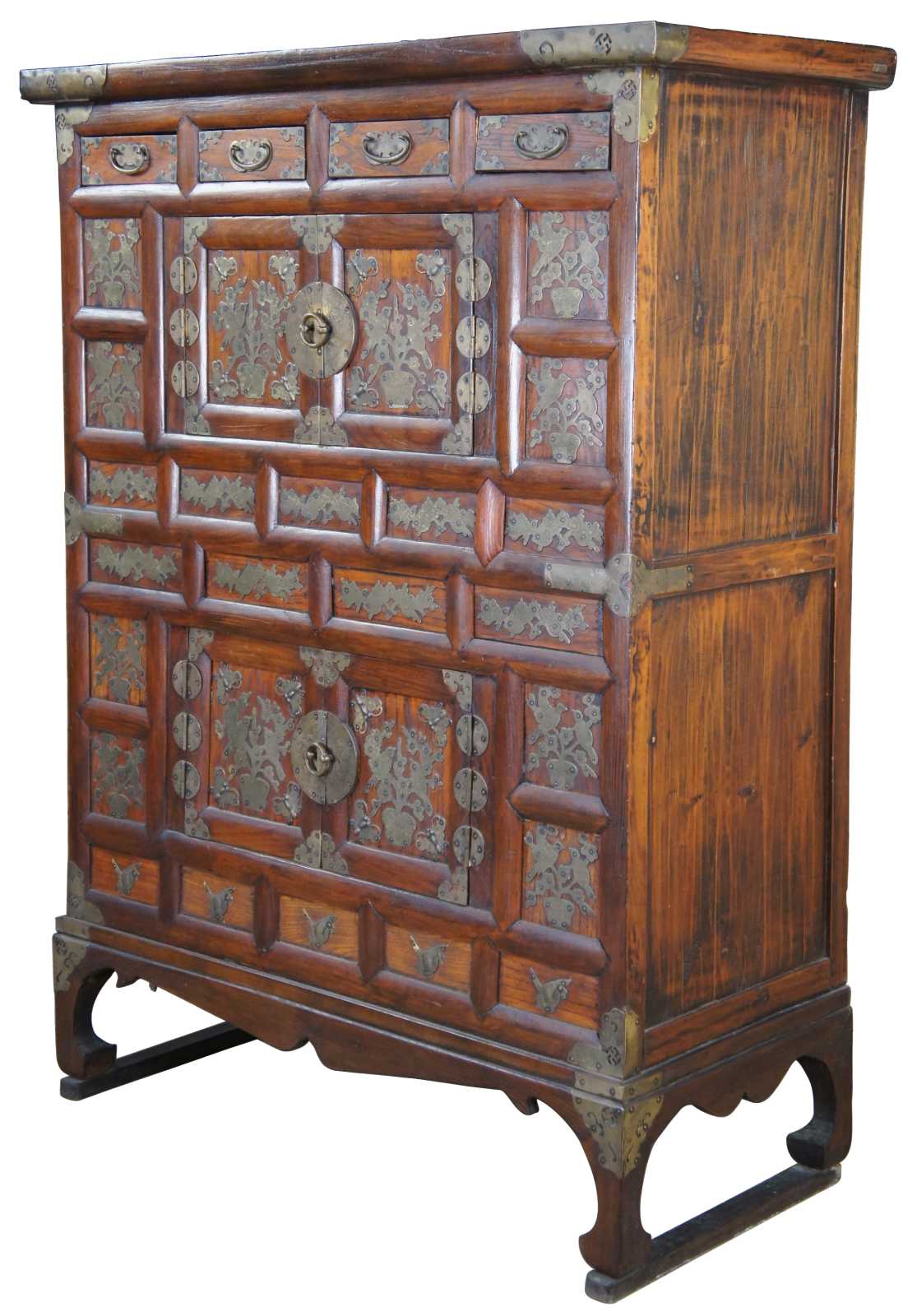 Antique Korean Bandaji chest or trunk featuring Zelkova elm frame with brass accents. The Korean name bandaji (literally meaning ""half closing"") derives from the hinged door in the front of this chest. This type of chest was one of the most essential, and most commonly found, pieces of furniture in a Korean household. Clothes, documents and valuables would be stored inside while folded blankets would be placed on top during the day (which explains why it is called a ""blanket chest"" in English). This chest, with its richly decorated fittings and extensive metalwork, was produced in the northern provinces of the Korean peninsula, mid nineteenth century; Kyong'gi Province, Joseon Dynasty (1392 - 1897).