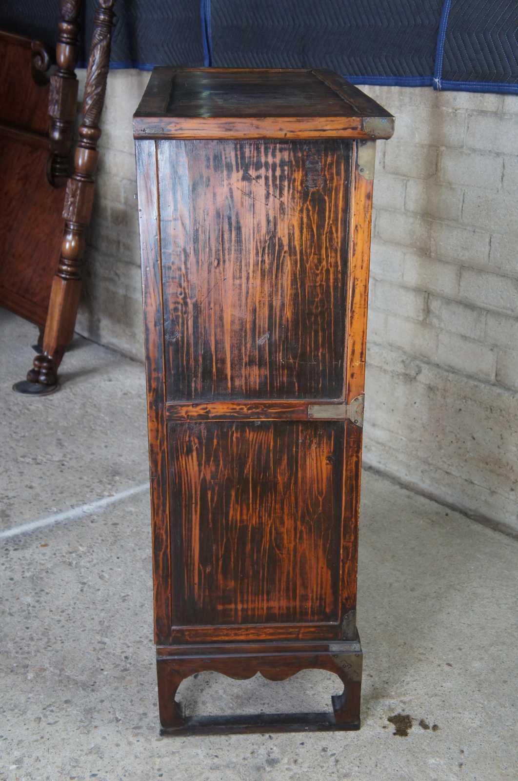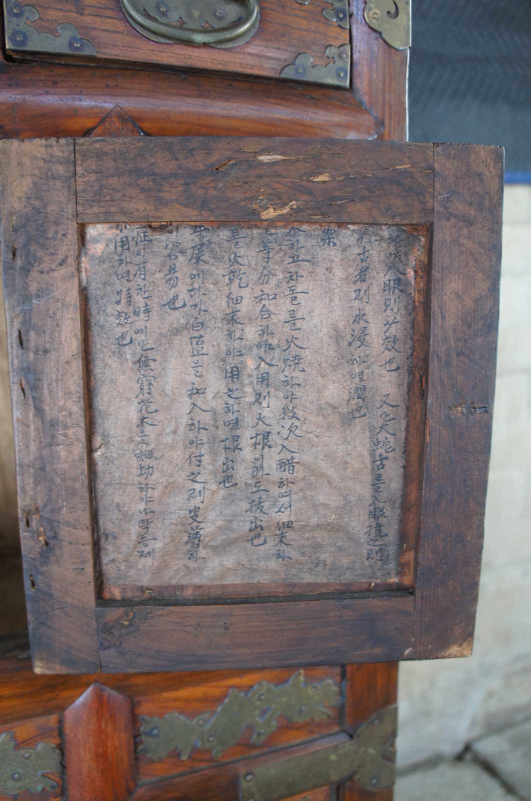 Early 19th Century Korean Tansu Nong Bandaji wedding chests or cabinet made of elmwood featuring ornate brass bird, butterfly and sauwastika accents. The swastika symbol, 卐 (right-facing or clockwise) or 卍 (left-facing, counterclockwise, or sauwastika), is an ancient religious icon in the cultures of Eurasia. It is used as a symbol of divinity and spirituality in Indian religions, including Hinduism, Buddhism and Jainism.