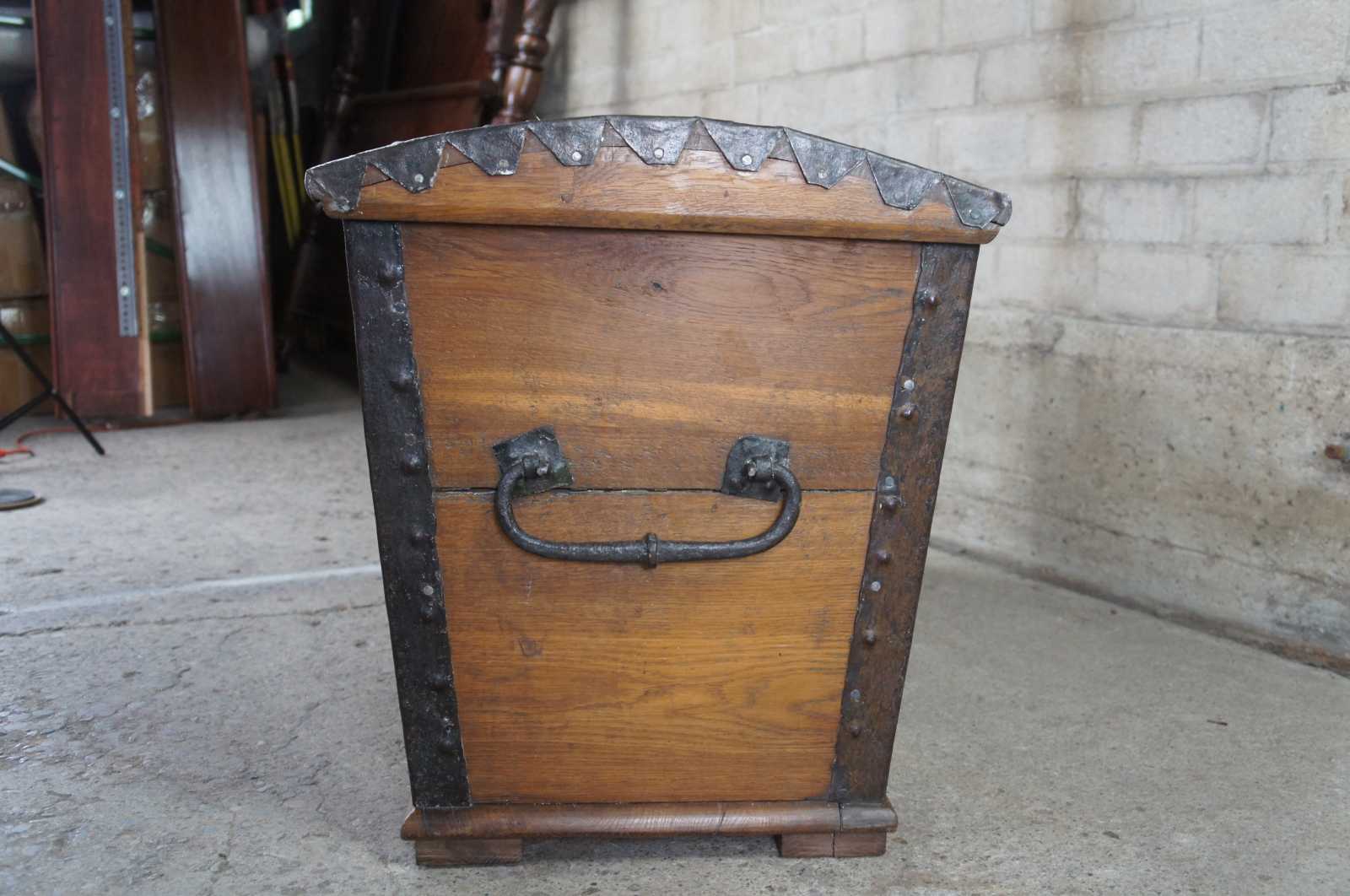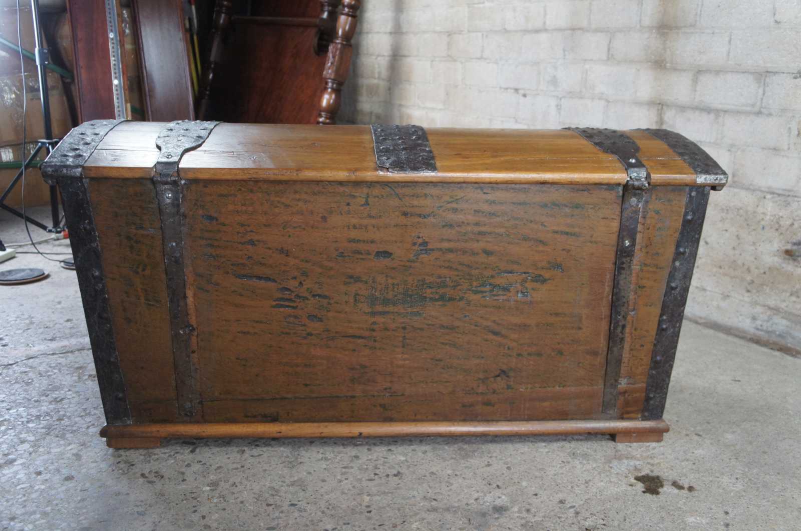 Designed to serve as a container for sea transport, sea chests were sometimes elaborately adorned with intricate ironwork as is the case with this museum quality extra large, hinged, dome top chest. The chest has high quality, detailed, decorative forged iron edging. Includes a working lock. The top of the chest shows the remnants of an old paper tag as well as unique hand stenciled three petal rosettes. Circa Late 18th to Early 19th Century Swedish/ Norwegian (Scandinavian).