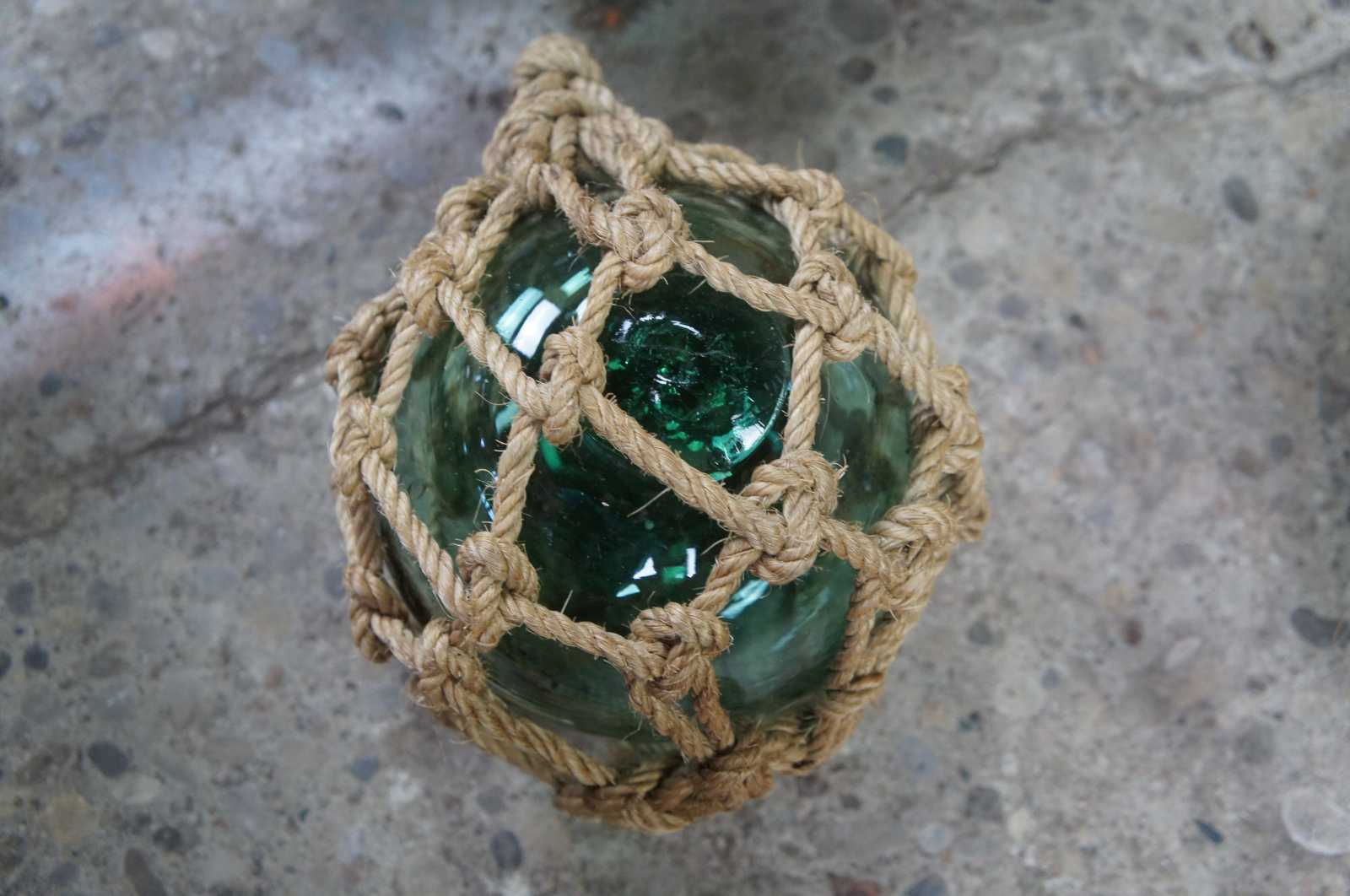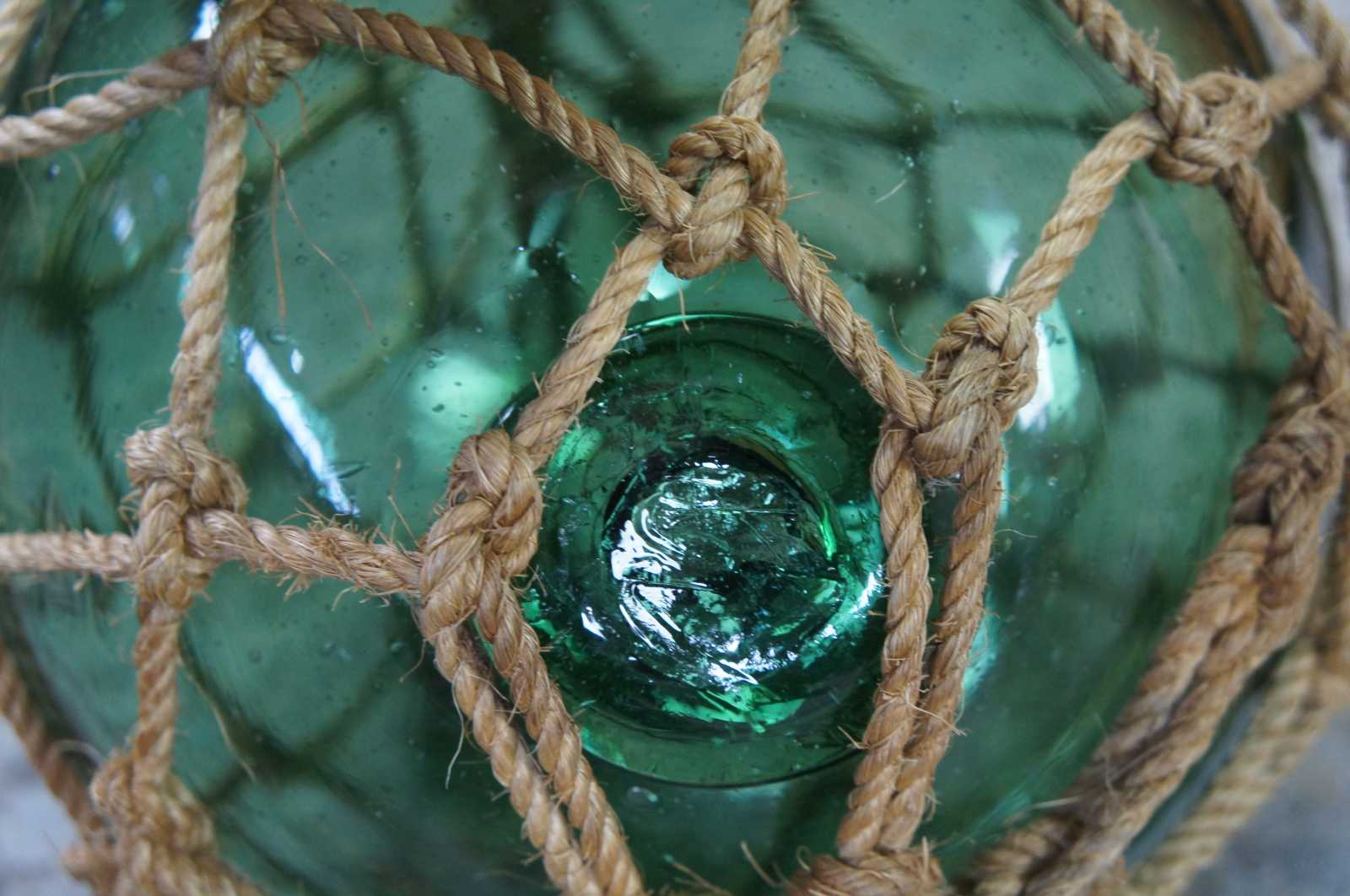 Lot 7 hand blown netted blue Japanese fishing floats. Made from recycled glass bottles and used to buoy a fisherman's net when cast into the water. Feature hand tied knots with hanging loop making them great for use on a dock or displayed in a nautical theme space.