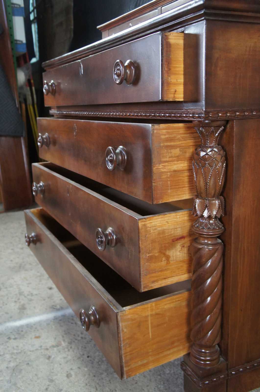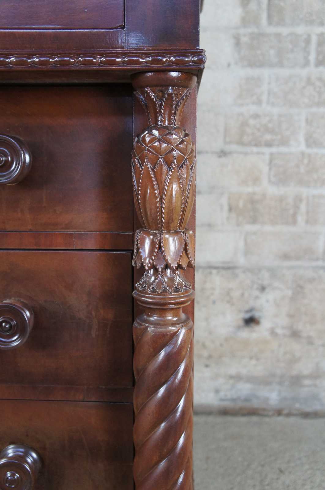 Early 19th Century American Empire finely carved chest of drawers, with pineapple topped, barley-twist columns. A rectangular form made from mahogany with crotch veneer along drawer fronts and stepback design featuring two glovebox drawers. Includes hand dovetailing, scrolled backsplash, beaded trim and nubby turned feet with casters.