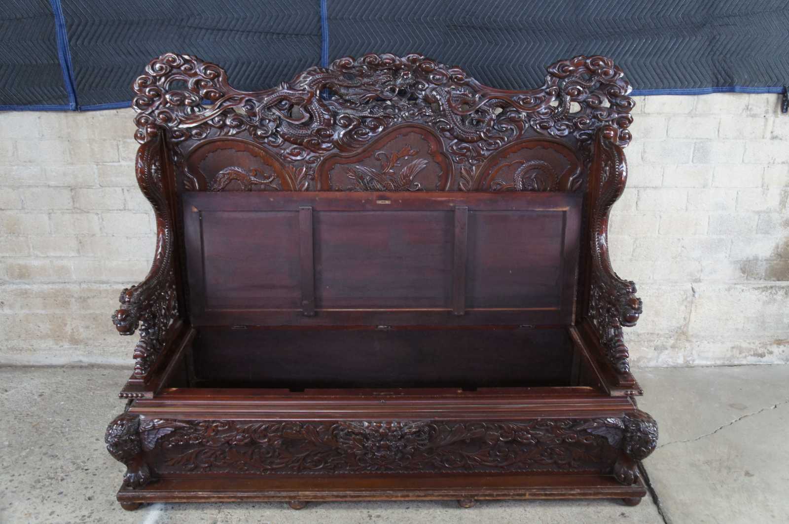 Imperial Japanese Meiji Period Dragon Bench. Features high relief carved accents and under seat storage. From top to bottom this piece is ordained with three toed dragons. The crown is pierced with a serpentine dragon sprawling through a field of clouds. The seat backing features three inset panels showing a phoenix centered between two inward facing dragons. Backing is flanked by figural arms carved in the manner of gnarling dragon with thick scales and a ball in mouth over reticulated floral designs. The rectangular form base shows a dragon face at the center and winged dragons over ball and claw foot along the corners, offset by a floral pattern in between. Base is supported by bun feet. An exquisite design that will make a statement in any setting.
