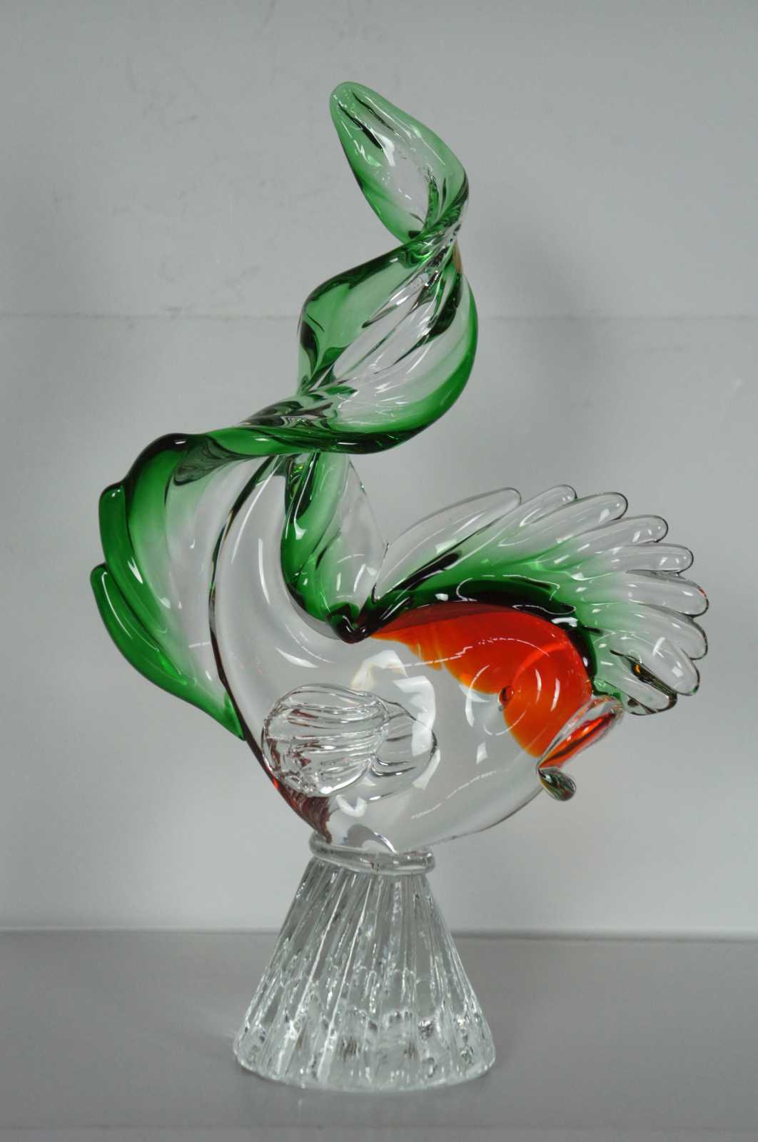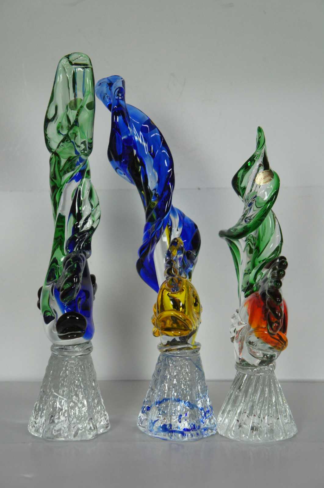 Set of three mid century hand crafted Murano Sommerso art glass sculptures in the shape of fish with pronounced dorsal fins and long swirling tails.