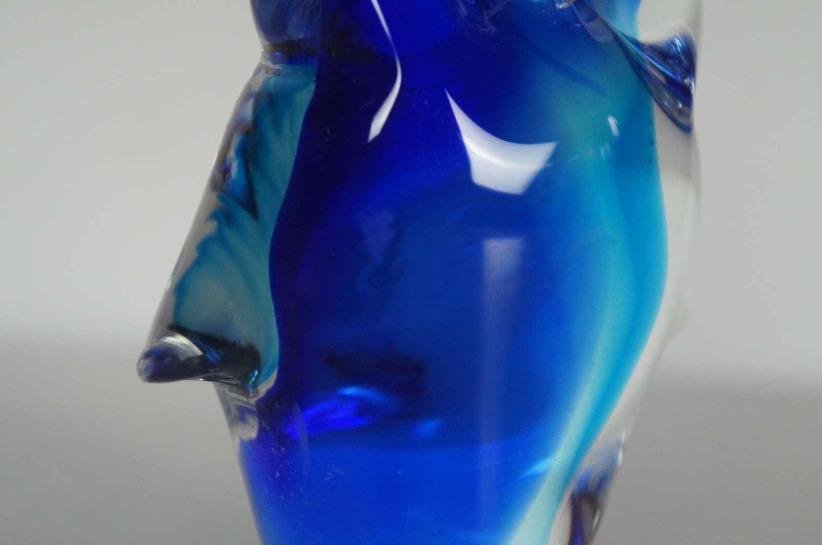 Hand blown Italian art glass figurine of a small blue horned owl with curling beak and deeply set cane eyes.
