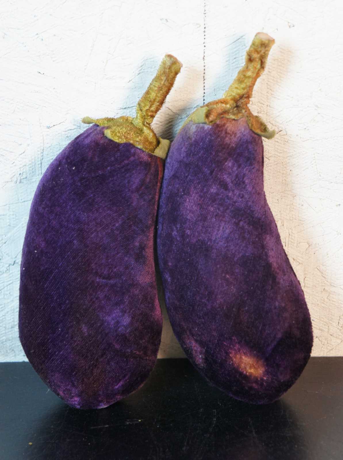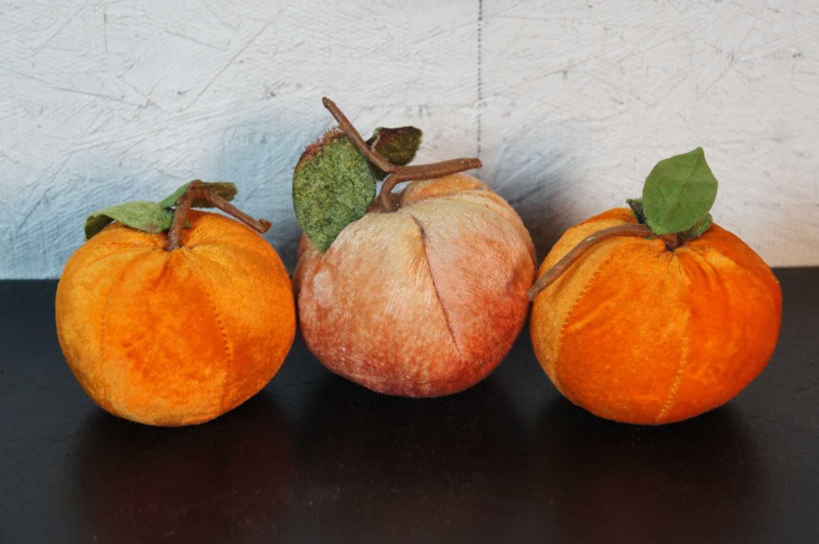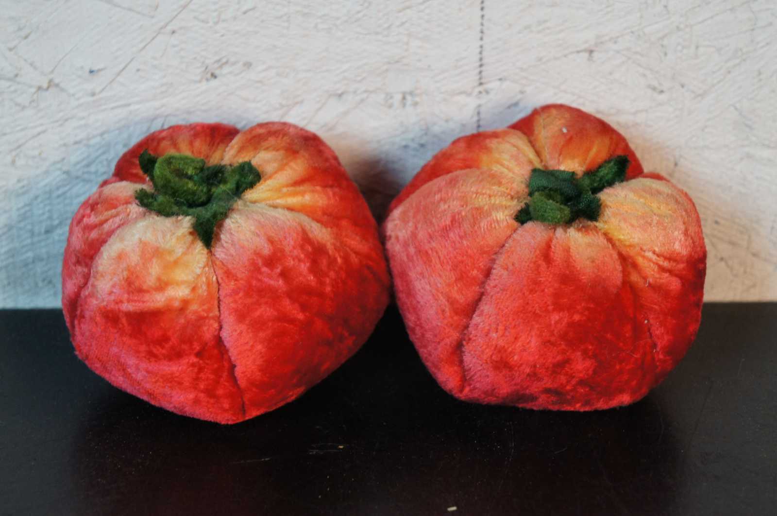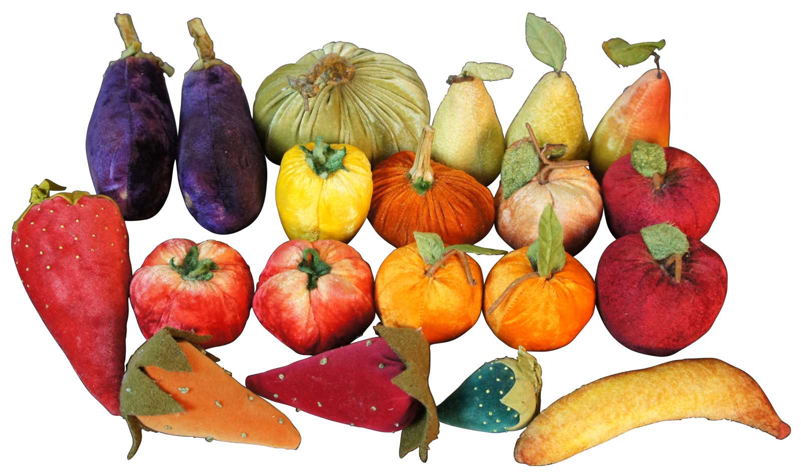 Lot of 20 pieces of velvet stuffed fruit and vegetables, including eggplant, strawberries, pears, apples, pumpkins, tomatoes, peaches/oranges, bell pepper and banana.