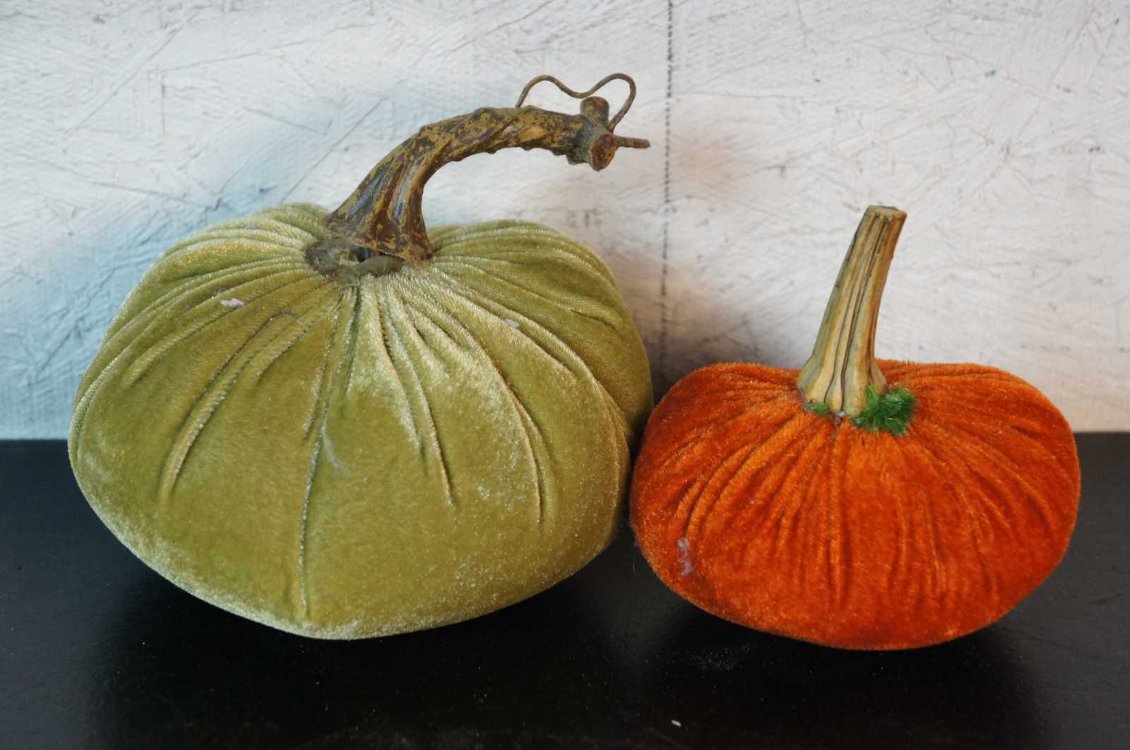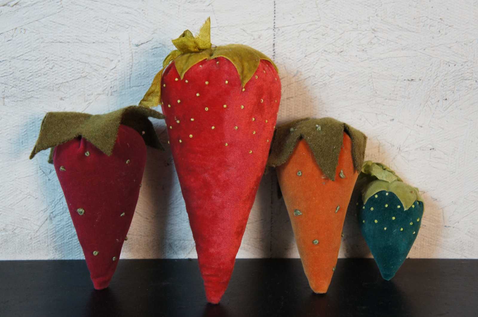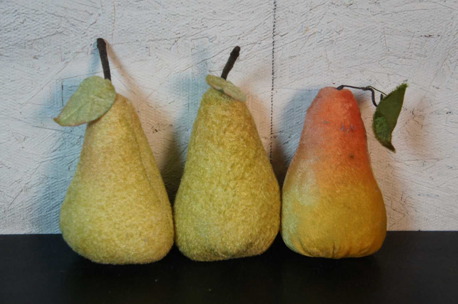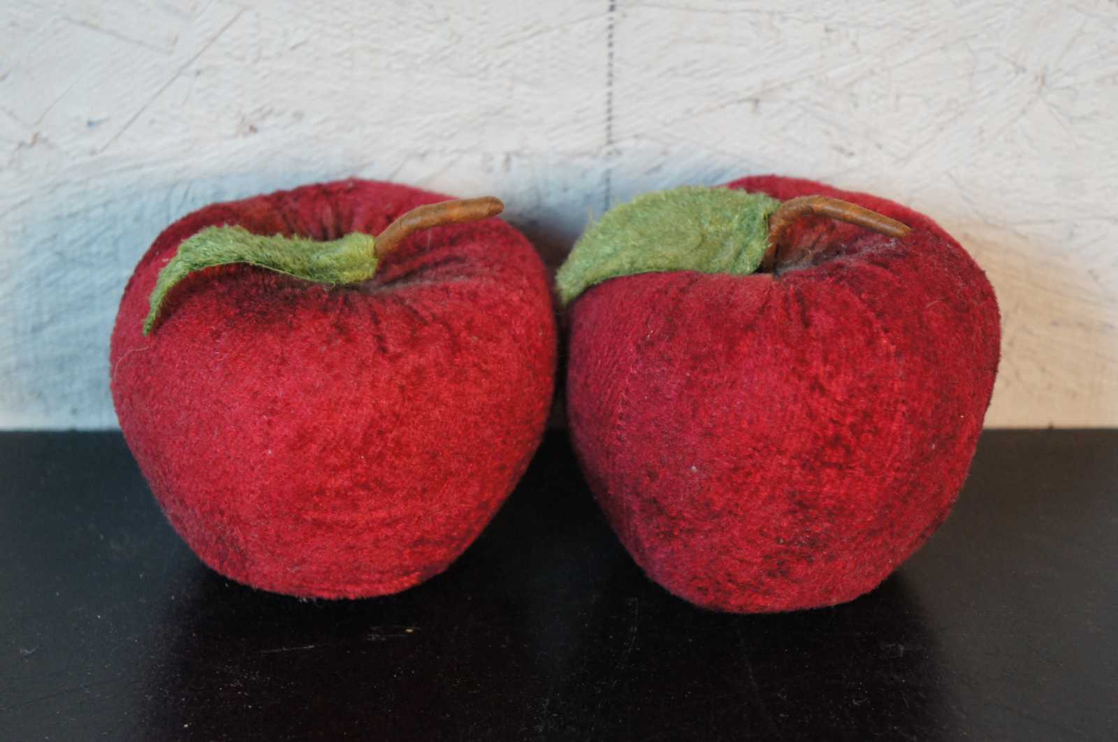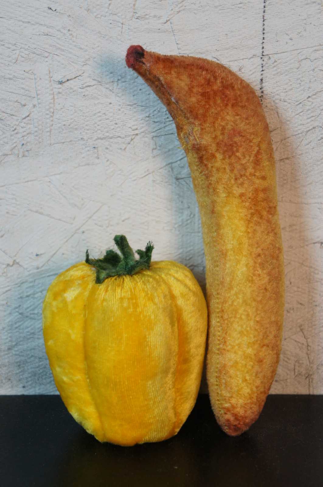 Lot of 20 pieces of velvet stuffed fruit and vegetables, including eggplant, strawberries, pears, apples, pumpkins, tomatoes, peaches/oranges, bell pepper and banana.