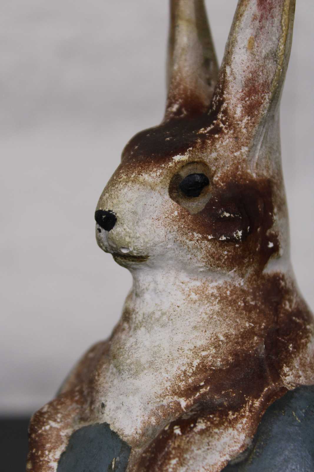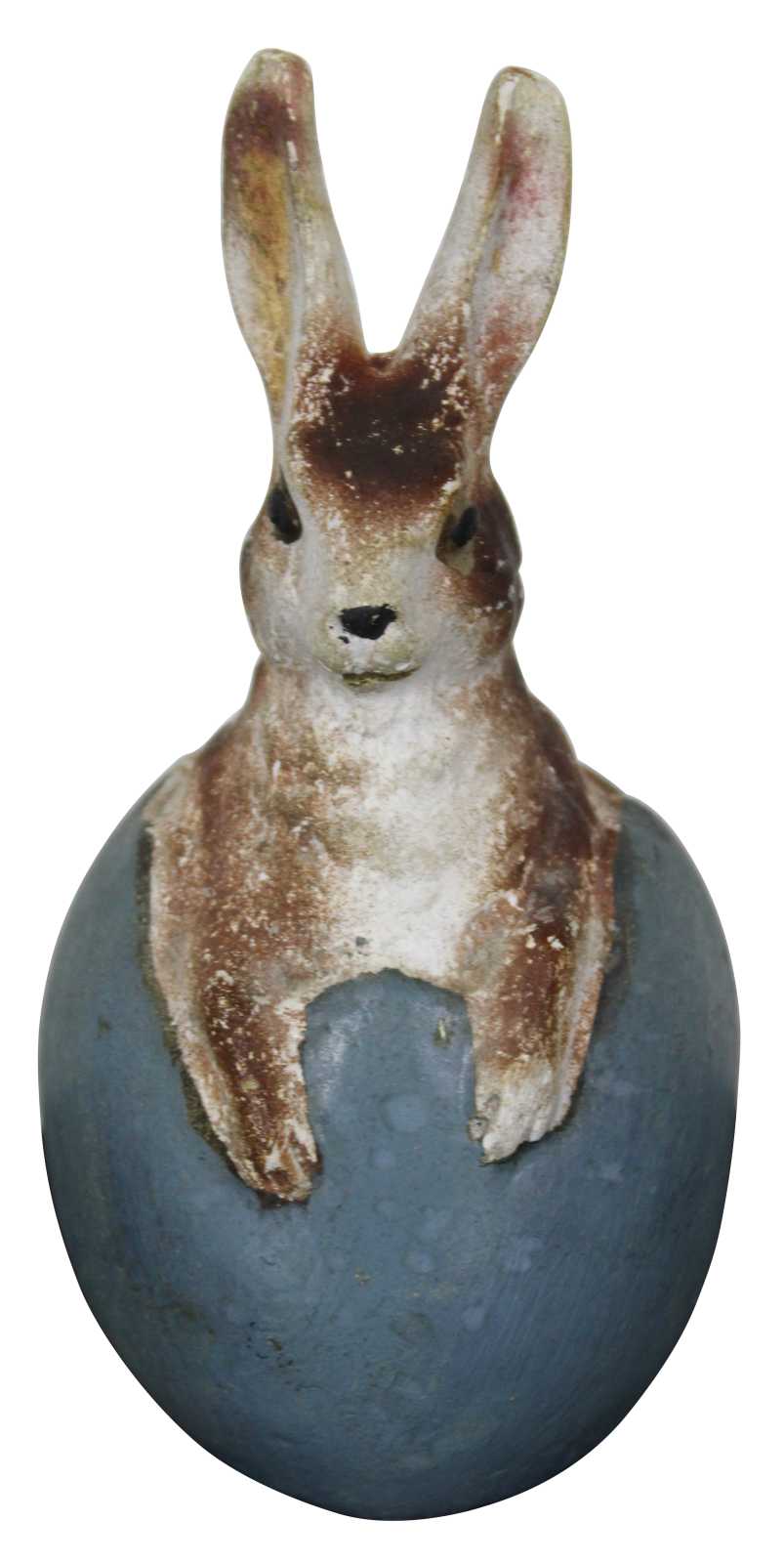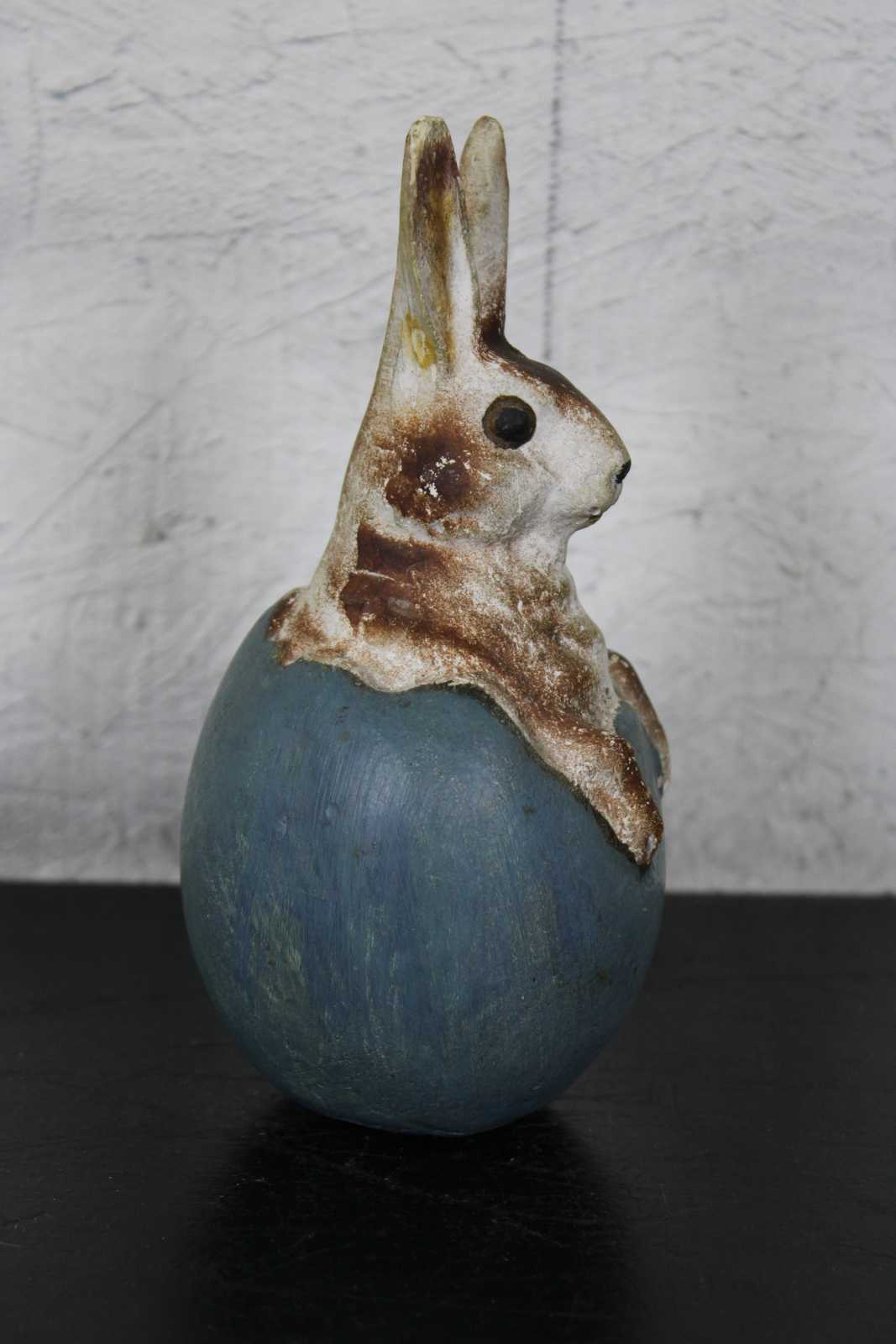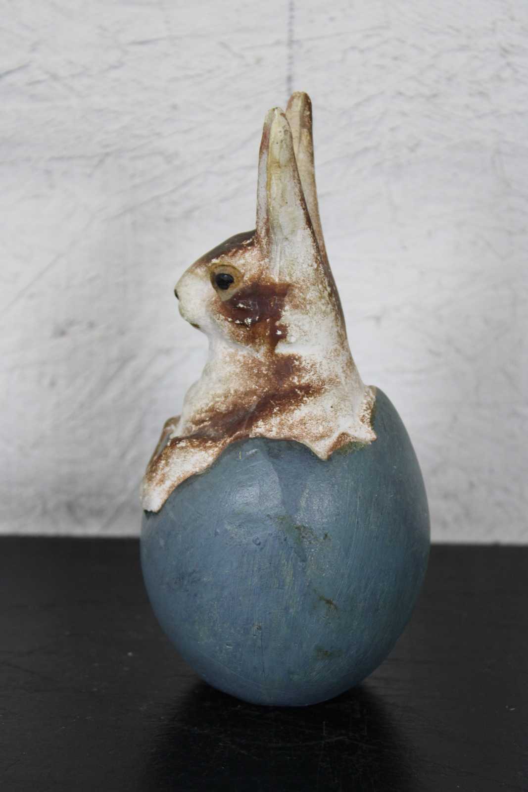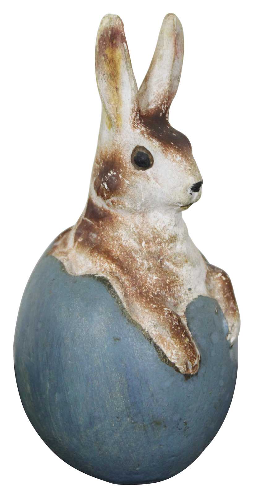 Antique ceramic or composition figurine in the shape of a brown and white rabbit sitting in a blue Easter egg. In the style of German paper mache candy containers.