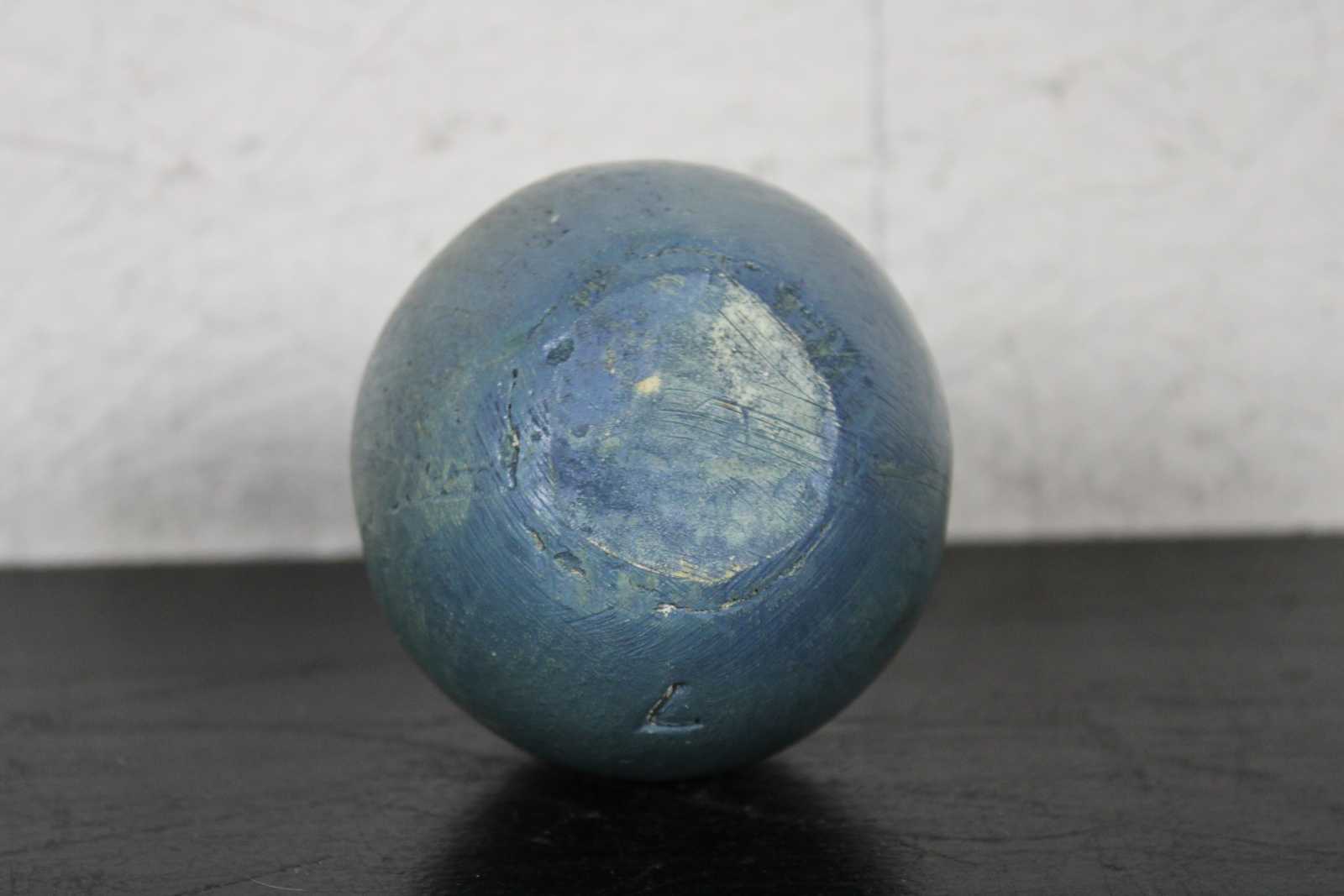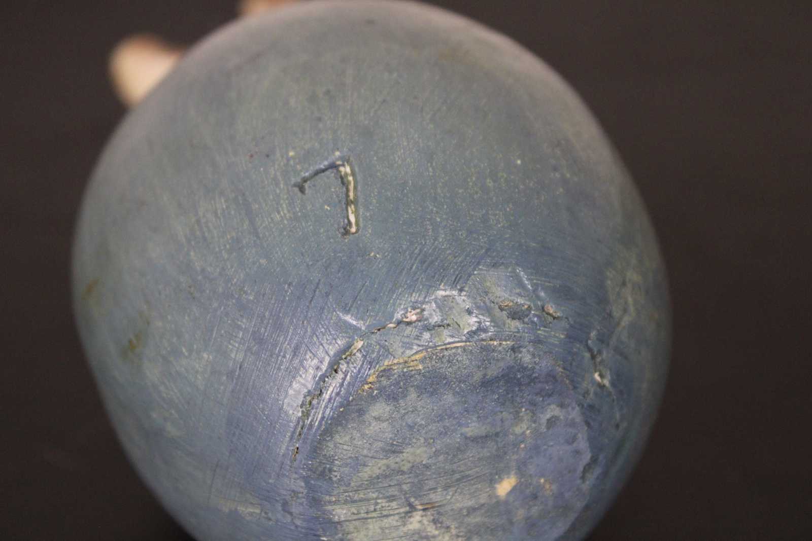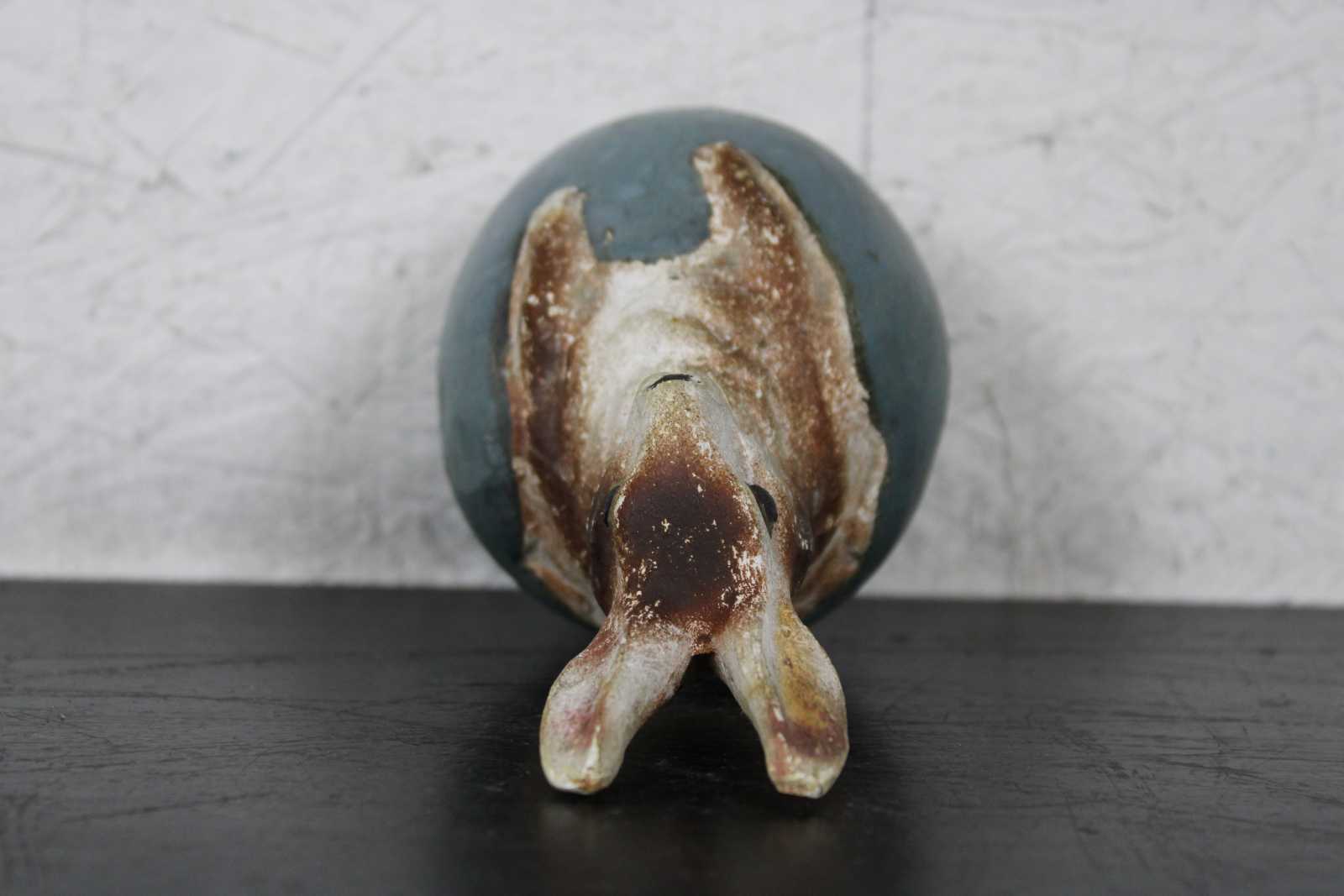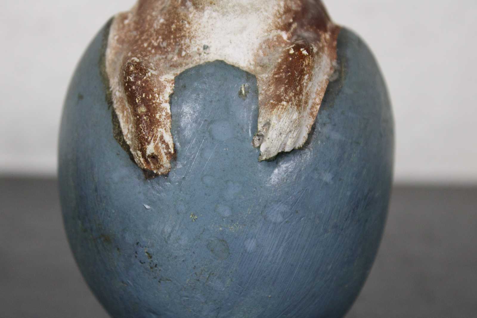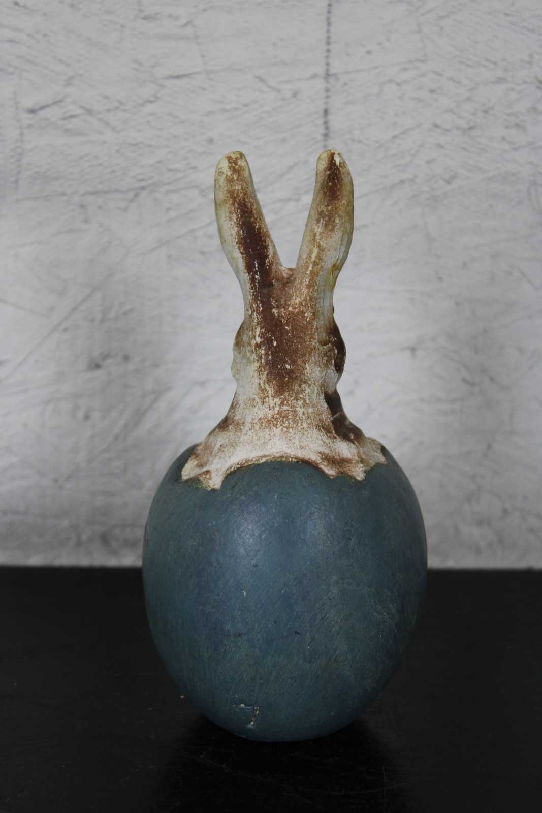 Antique ceramic or composition figurine in the shape of a brown and white rabbit sitting in a blue Easter egg. In the style of German paper mache candy containers.