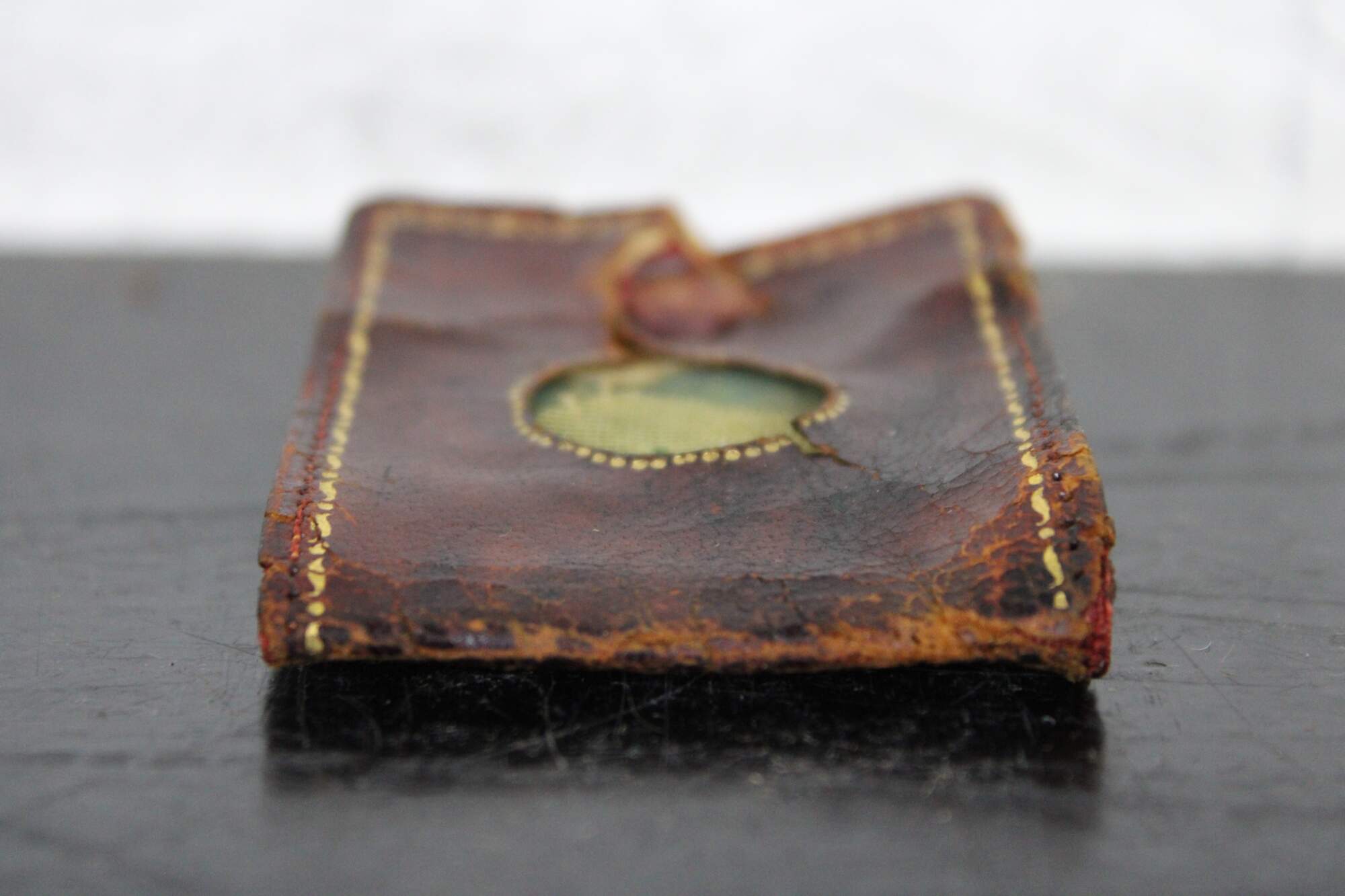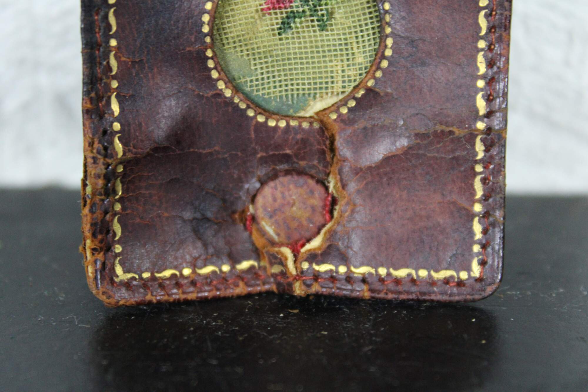 Antique Victorian brown leather sewing needle case with red interior, snap closure, gold painted details and inset embroidered rose on the front.
