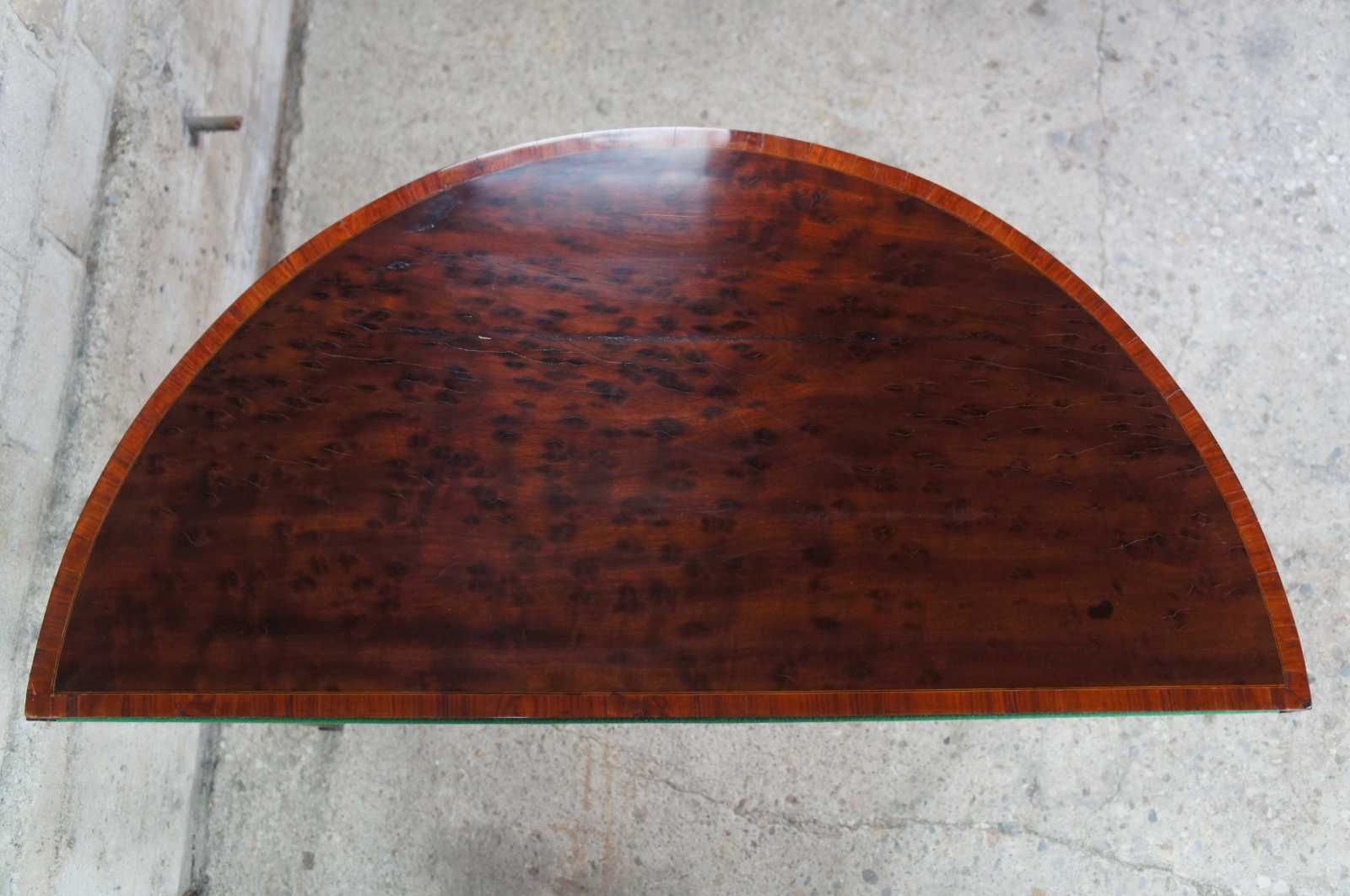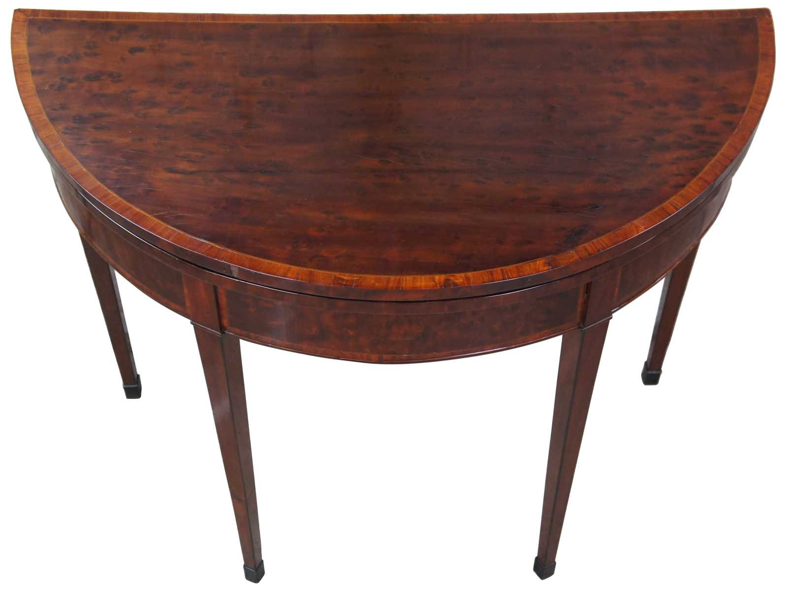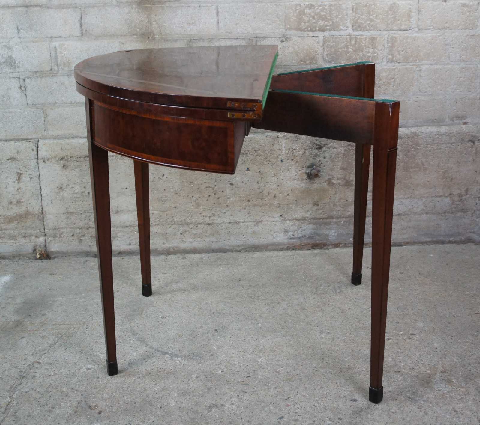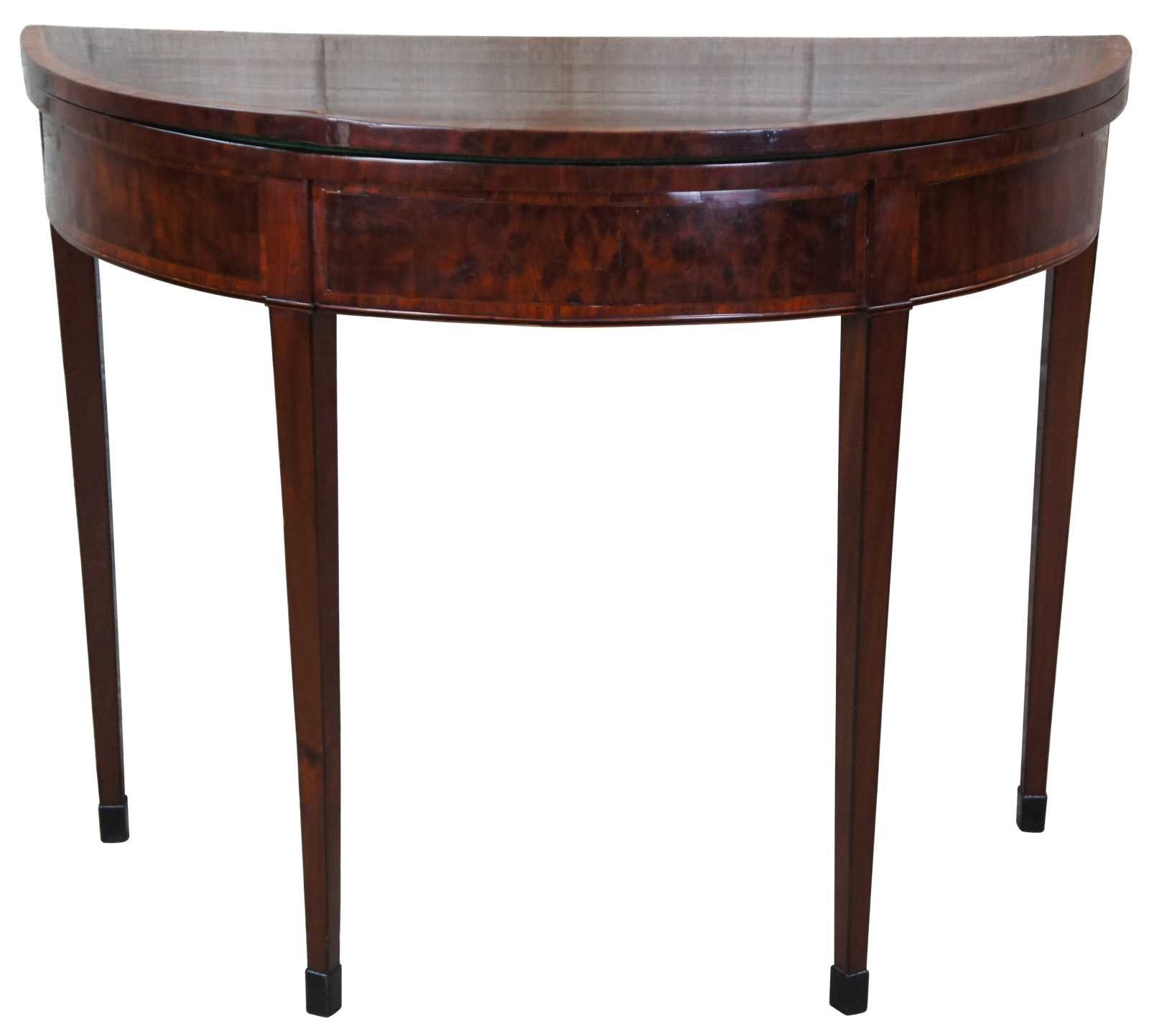 A fine and impressive authentic Hepplewhite period console table, circa 1790s. Made from "Plum Pudding" Mahogany with a demilune, crescent or half moon form. Perfect for use as an entry console table or game table. Features two gate legs along the back side that swing out from wooden hinges to support the flip top. Includes banding along the frame and a green baize game surface. The top is supported by square form tapered legs leading to spade feet.