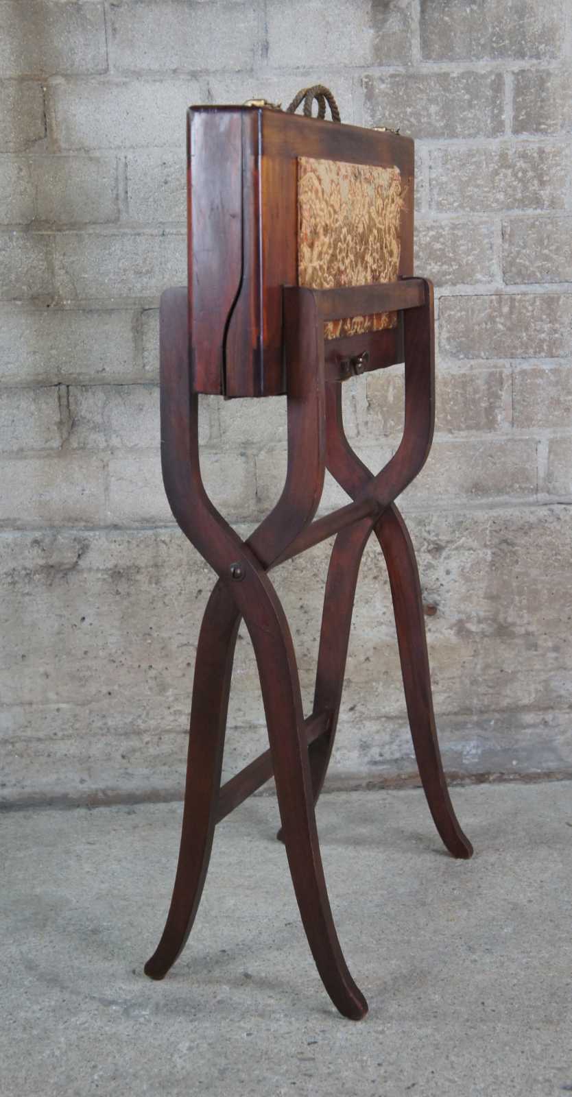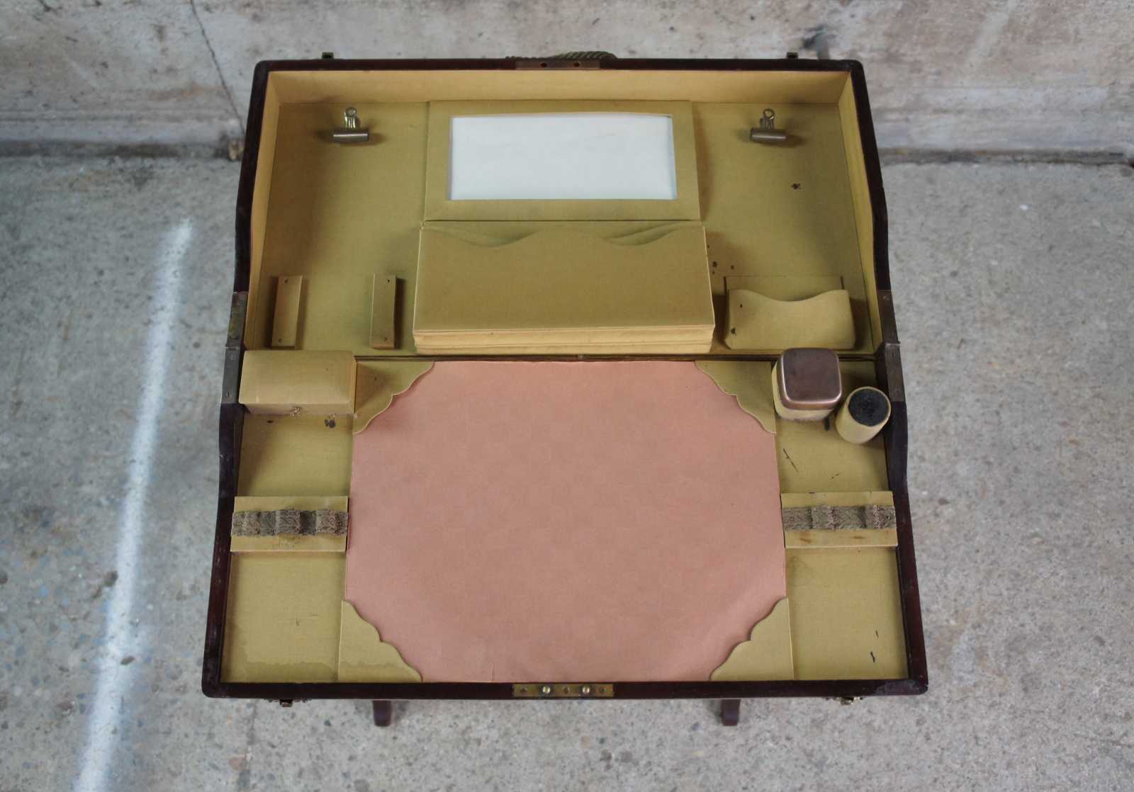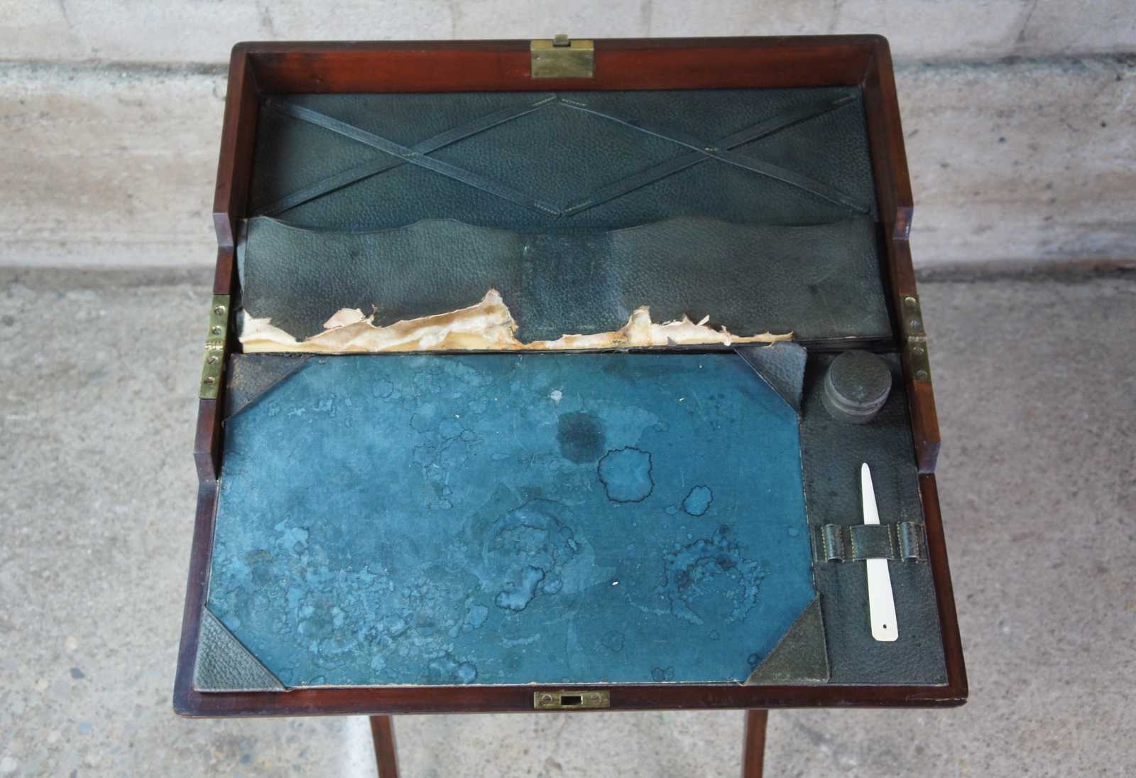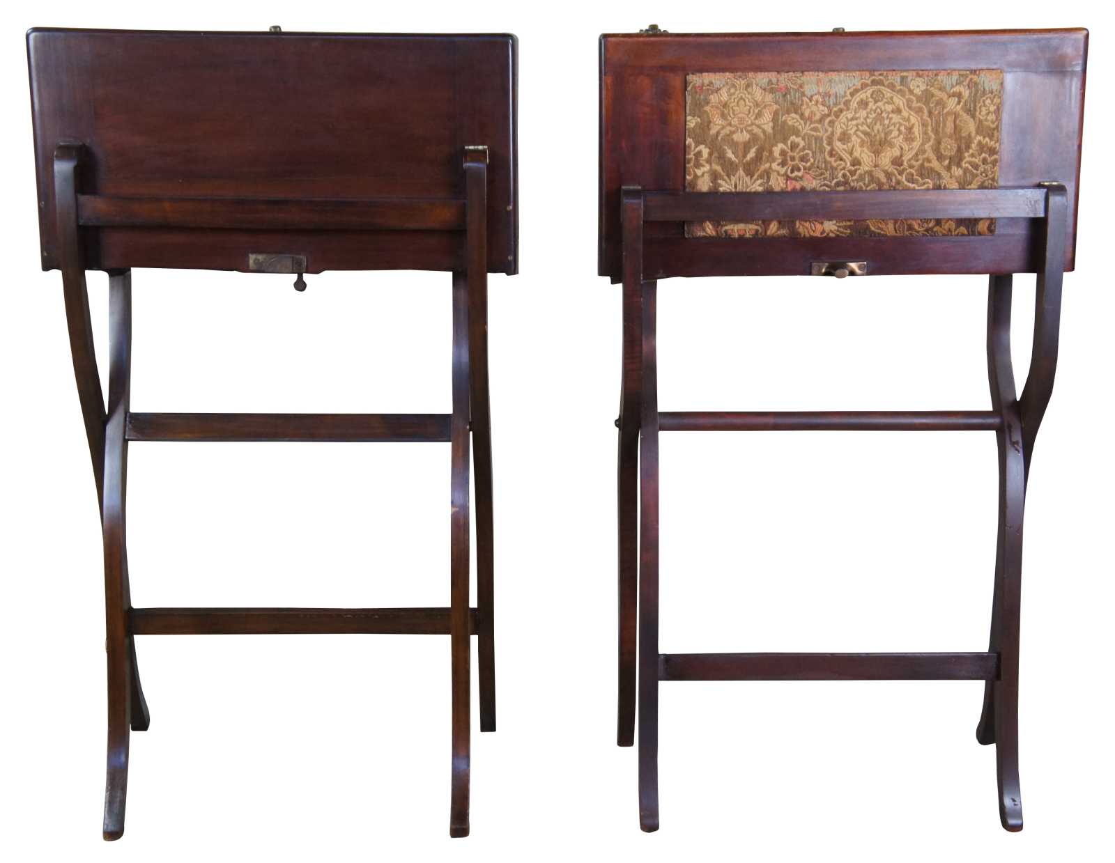 2 Civil War era British campaign writing desks. Made of mahogany featuring a folding form that opens to a writing surface complete with inkwells and letter storage. Slightly different forms and interiors, one boasting a needlepoint exterior design.