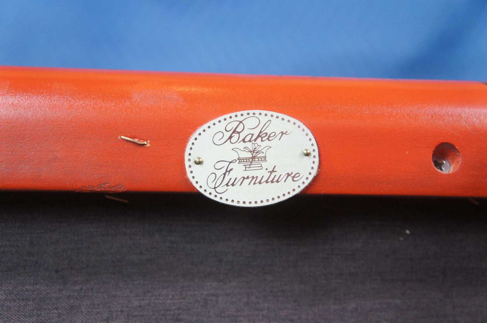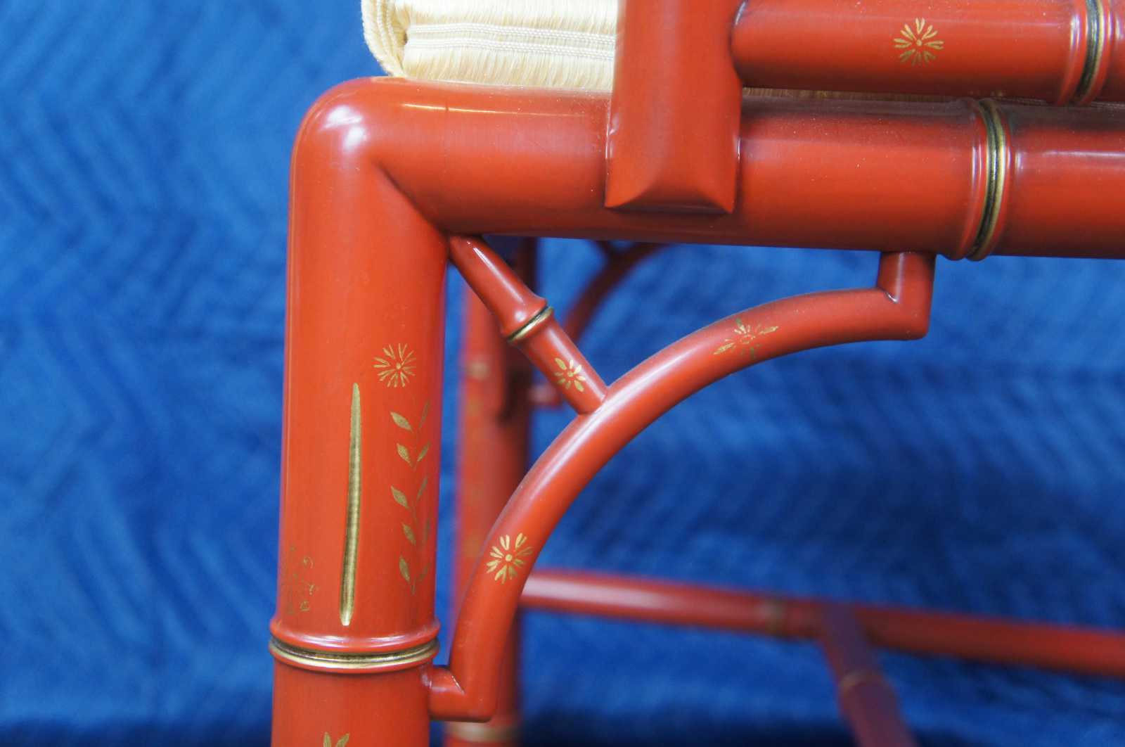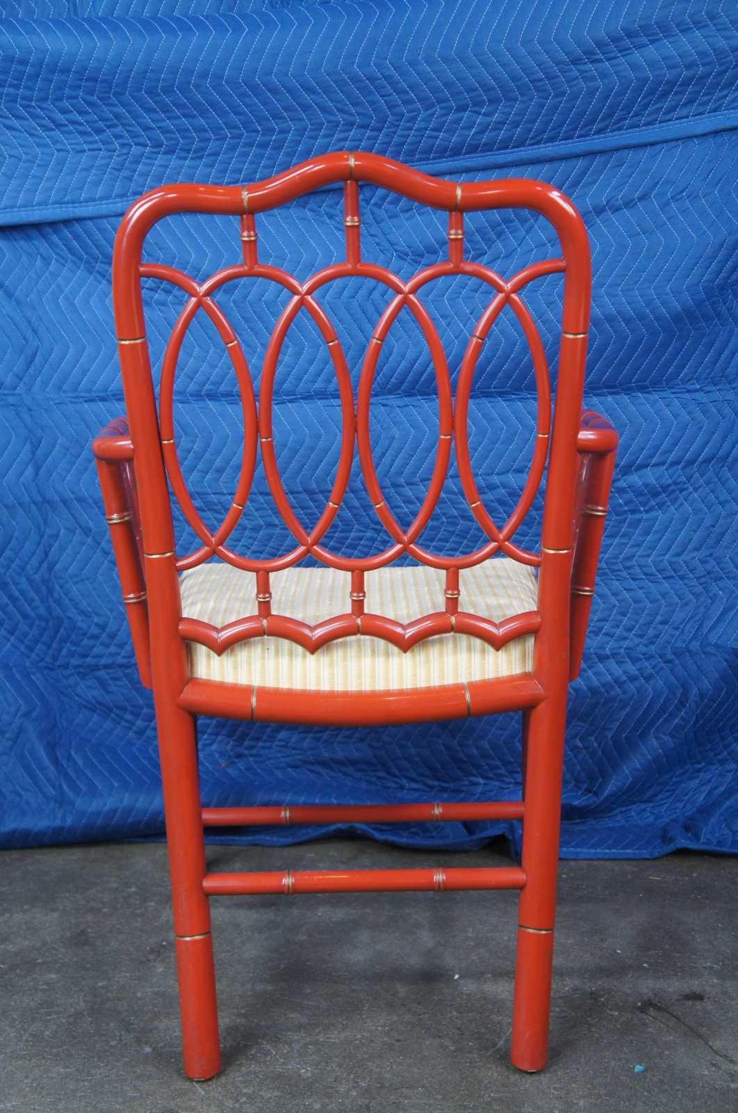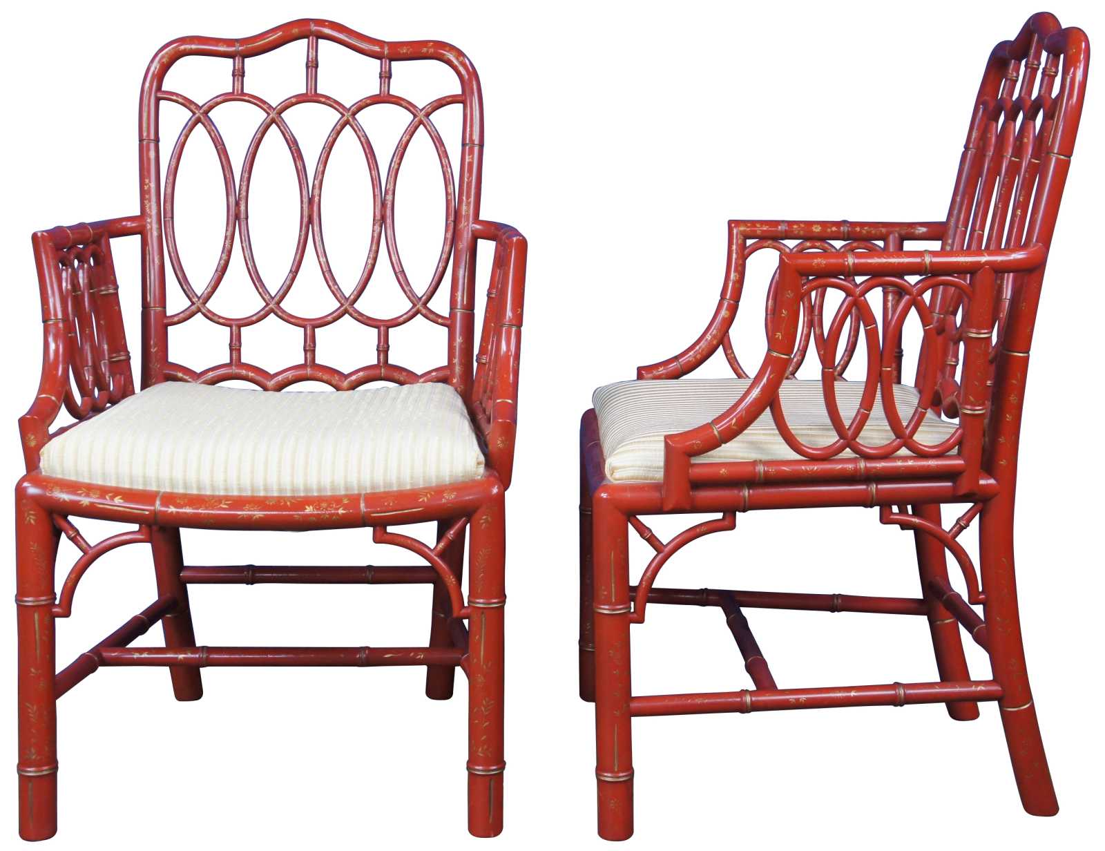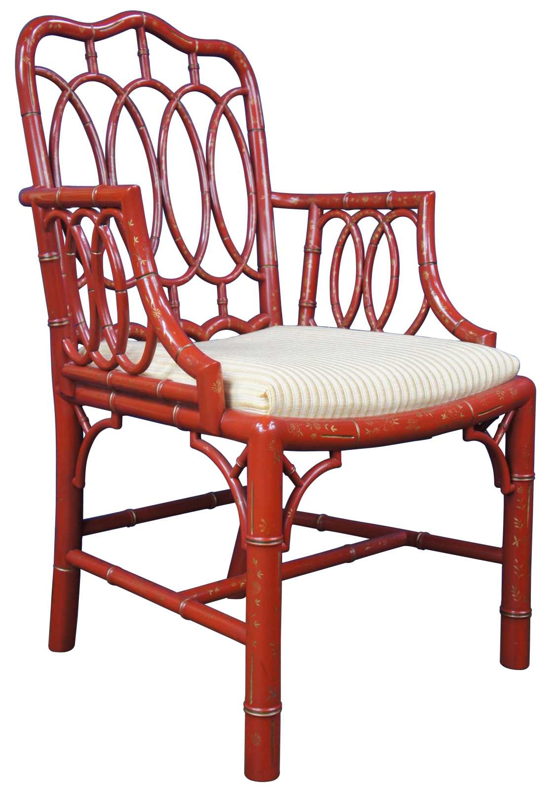 A rare and important set of 8 Baker Furniture Chinese Chippendale Loop or Hoop back dining armchairs, circa mid 20th century Featuring faux bamboo pierced bentwood frame with red lacquer finish and hand painted gilt floral accents. An archive style for the legacy brand. The maker’s mark is present to the bottom of each chair.