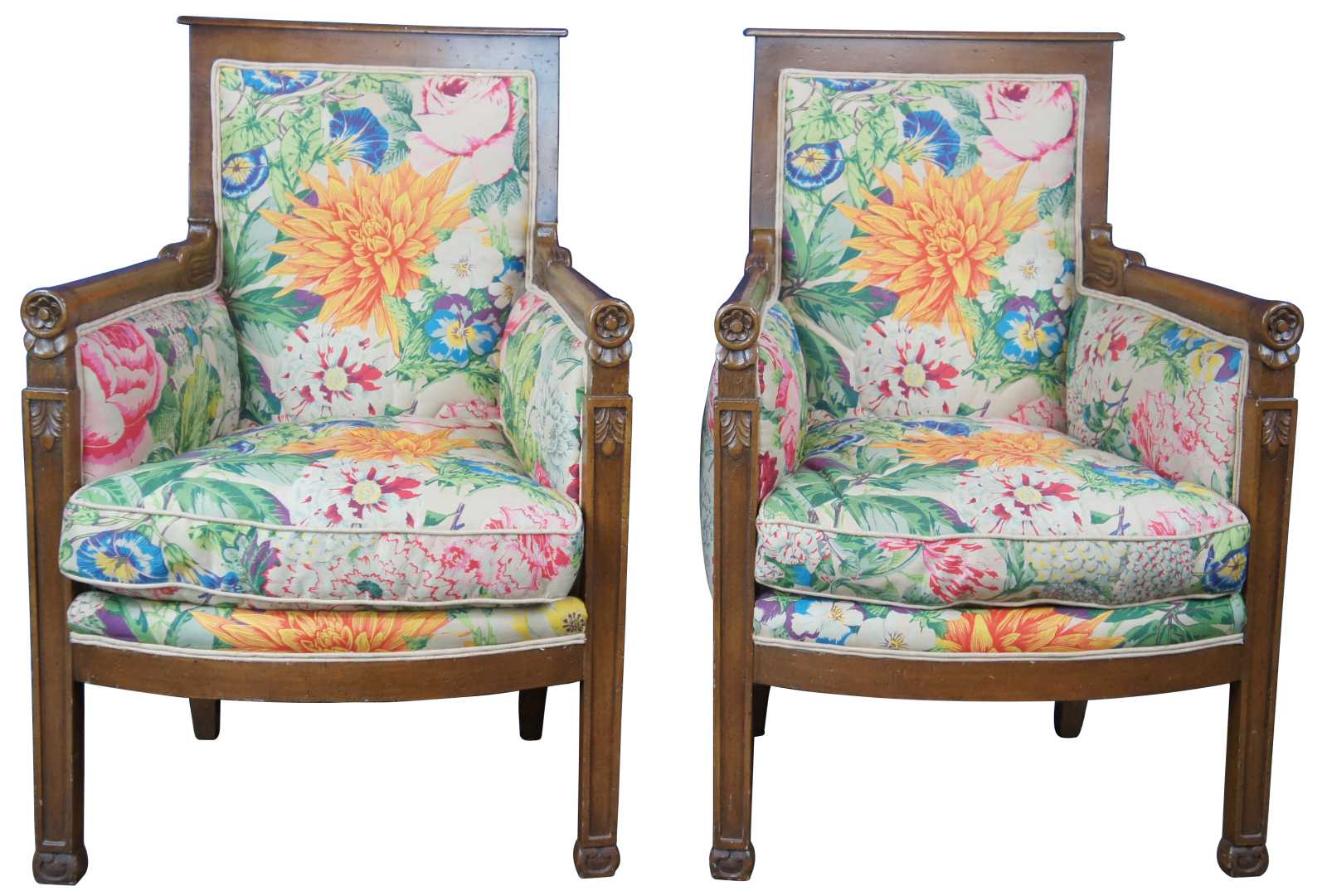 Vintage pair of French Empire or Louis XVI Inspired armchairs by Baker Furniture, circa 1976 . Made of walnut featuring carved floral details with fluted legs, round arms, and vibrant boho floral upholstery.