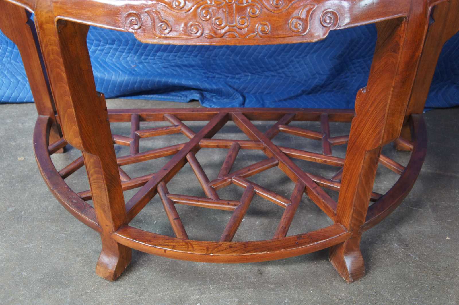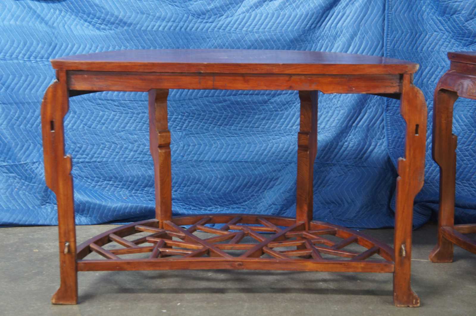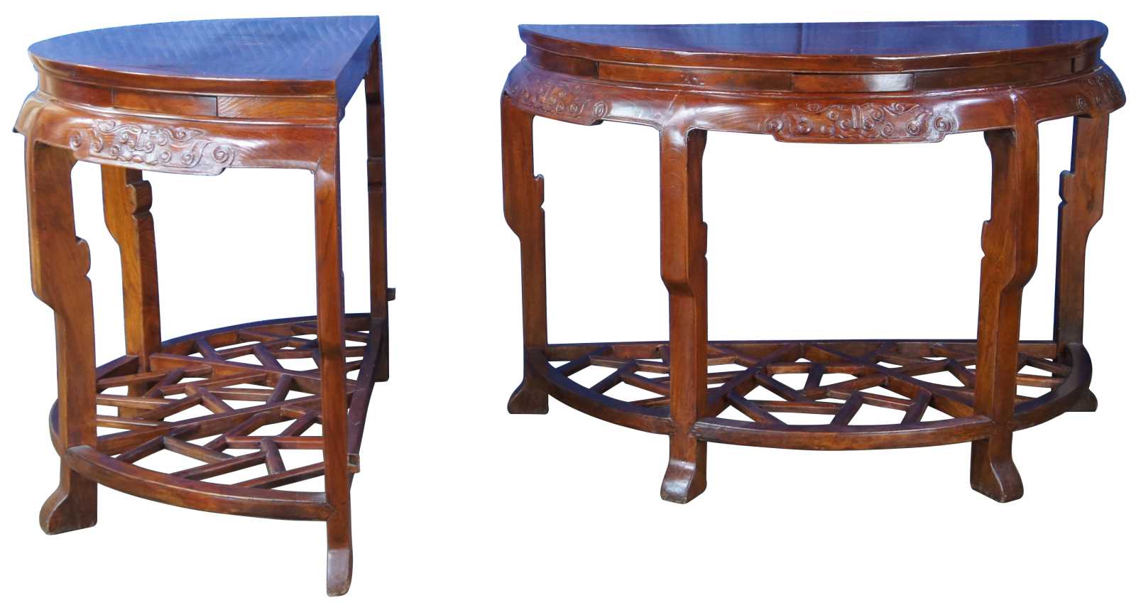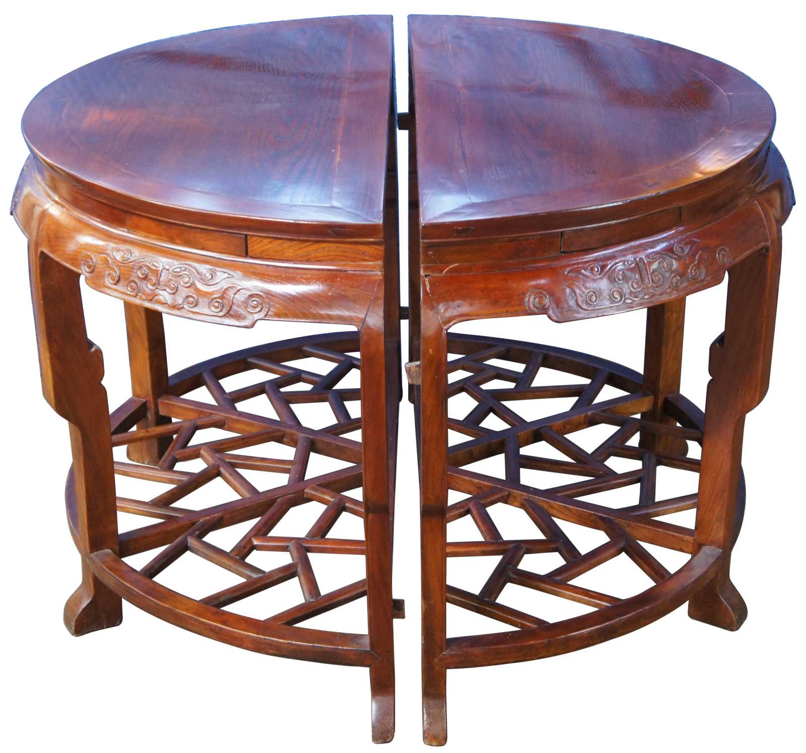Exquisite Antique pair of Chinese Qing Dynasty Half Moon or crescent shaped center entry console tables. Each console is made of elm featuring demilune form with three concealed drawers that open from underneath, carved aprons, and lower tier that features lattice fretwork design. The tables can stand alone or connect via tongue and groove mechanism to form a uniform round center table.