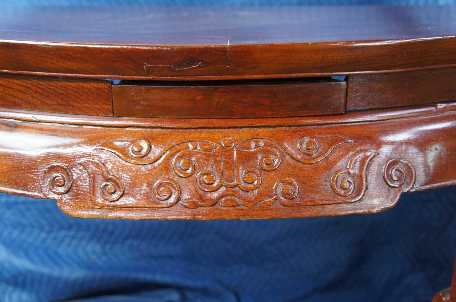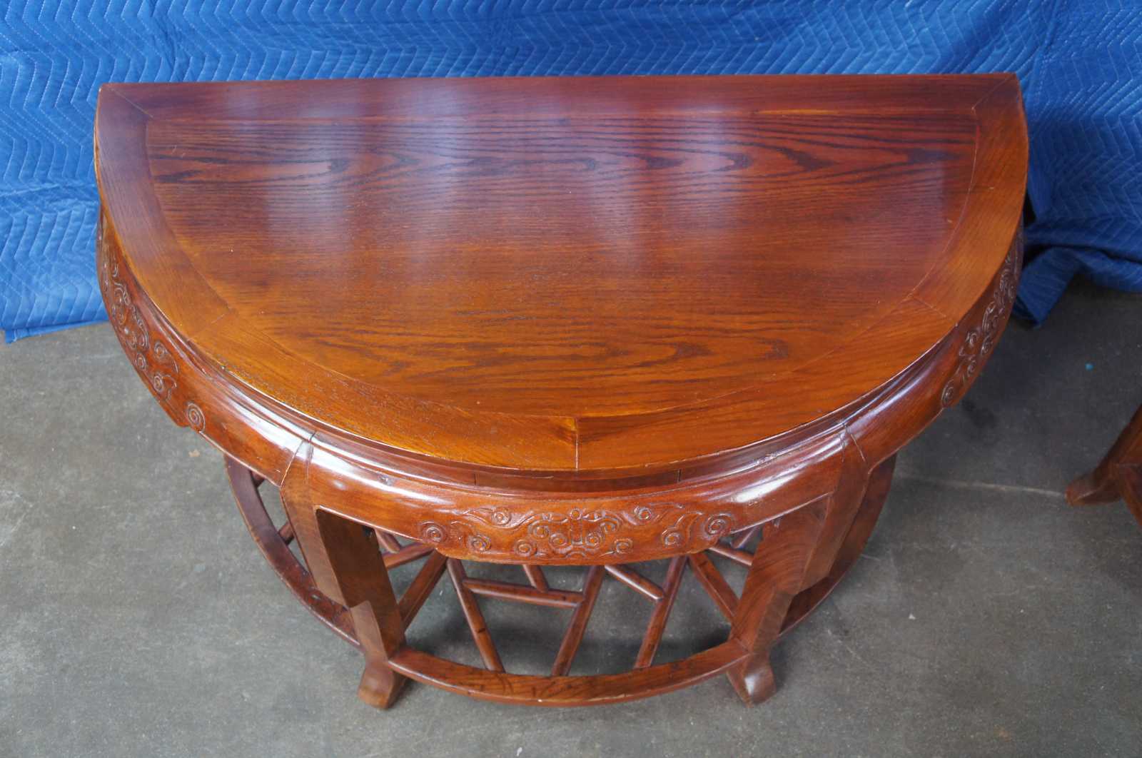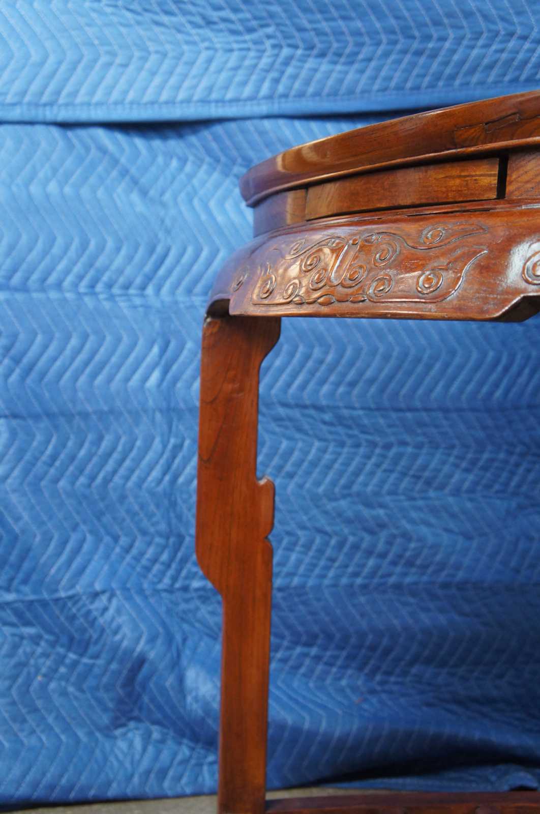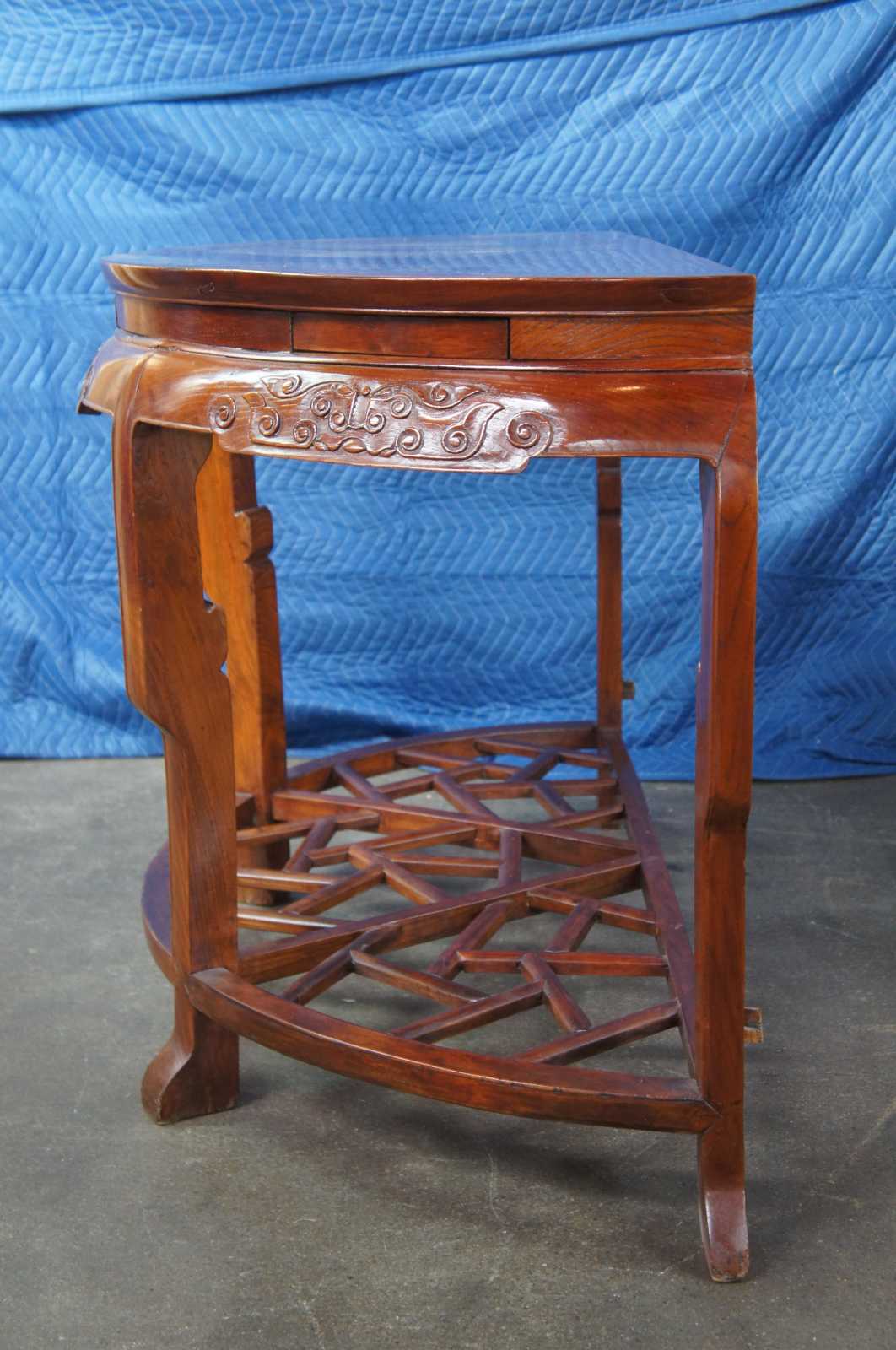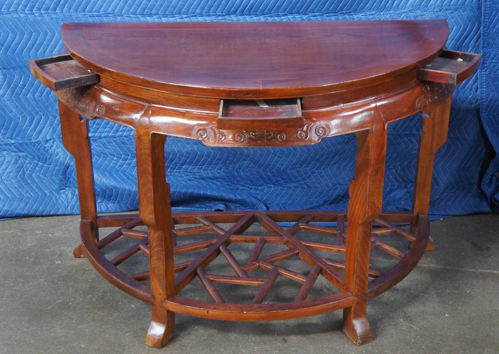 Exquisite Antique pair of Chinese Qing Dynasty Half Moon or crescent shaped center entry console tables. Each console is made of elm featuring demilune form with three concealed drawers that open from underneath, carved aprons, and lower tier that features lattice fretwork design. The tables can stand alone or connect via tongue and groove mechanism to form a uniform round center table.