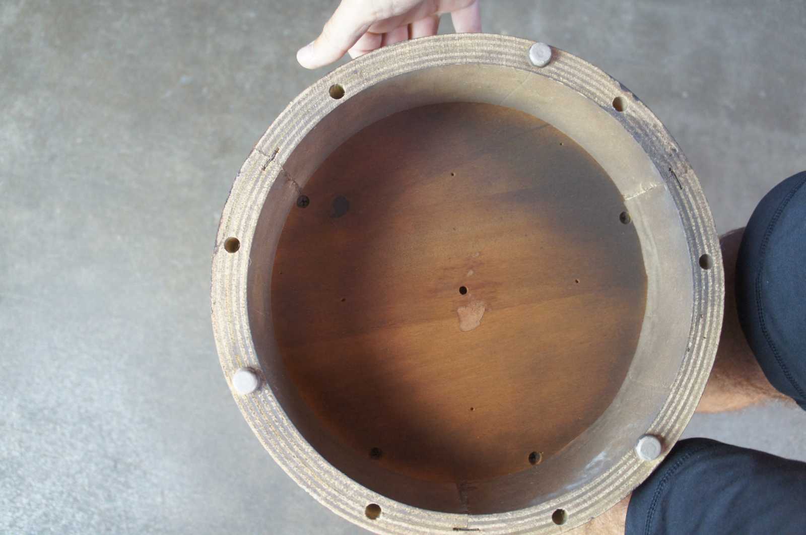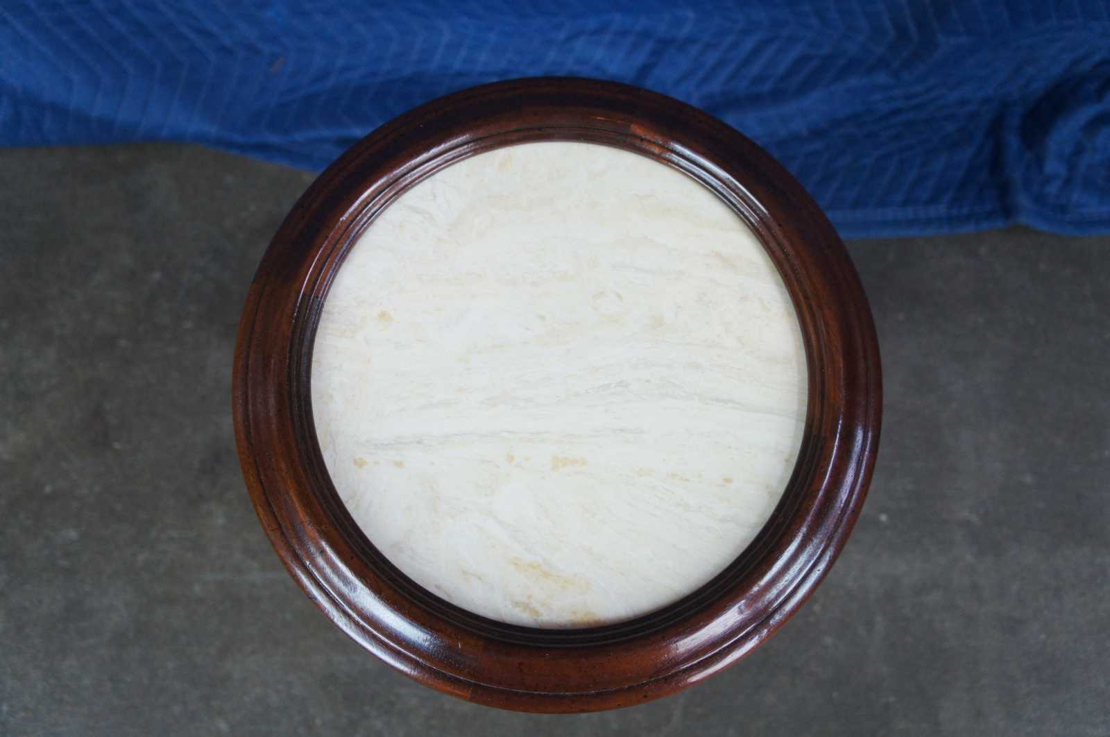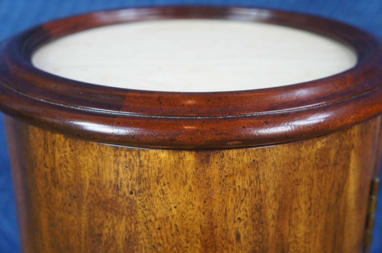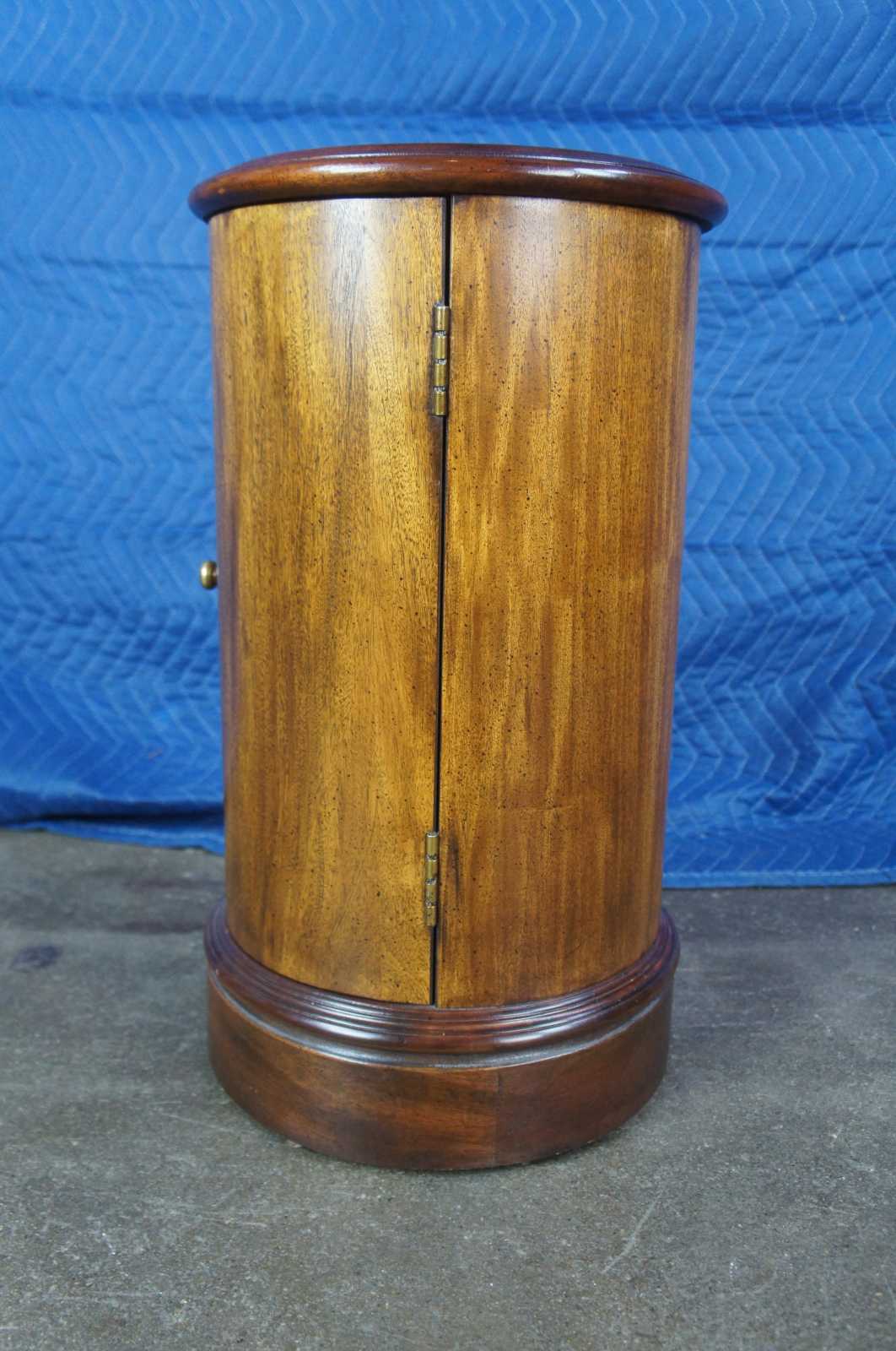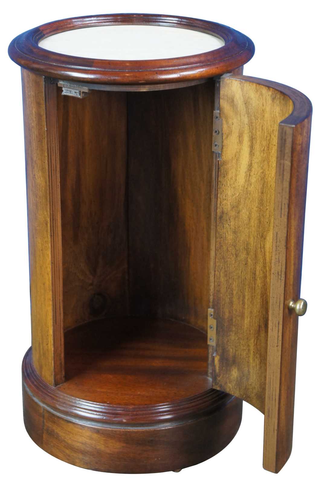 Mid Century 20th Century Louis Phillipe, Empire or Napoleon inspired ""Somno"" Table. Cylindrical modern form made from mahogany with hinged door, marble insert, and brass pull. The petite form makes it perfect for use as a pedestal, smoke stand or for displaying a sculpture. Meaning sleep in Latin 'Somno' Tables were originally intended as furniture for the bedchamber, now, however, they have acquired a versatile role and could be used as a side table or act as an elegant base for a statue in the centre of a room or corridor.