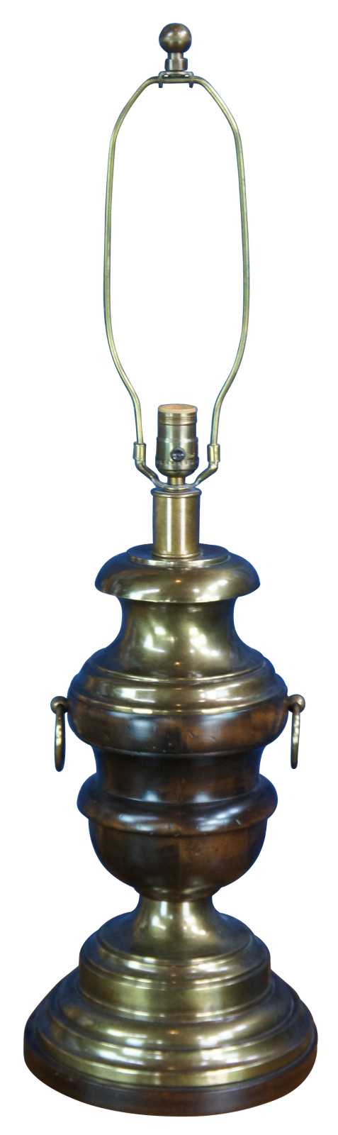 Two mid century Frederick Cooper lamps. Made of brass and wood featuring a turned baluster trophy shaped design with ring handles.