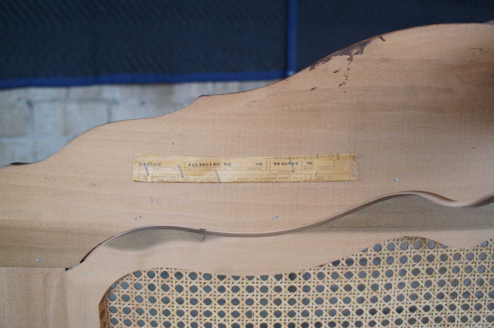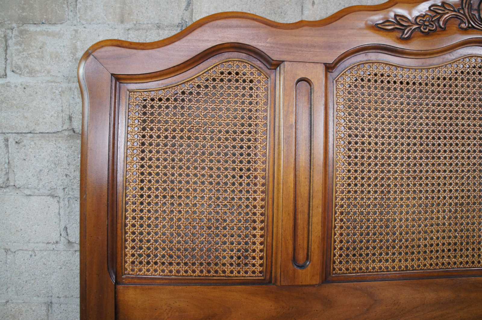 Mid century French Provincial full or queen size headboard featuring serpentine form with shell and floral design and caned back.