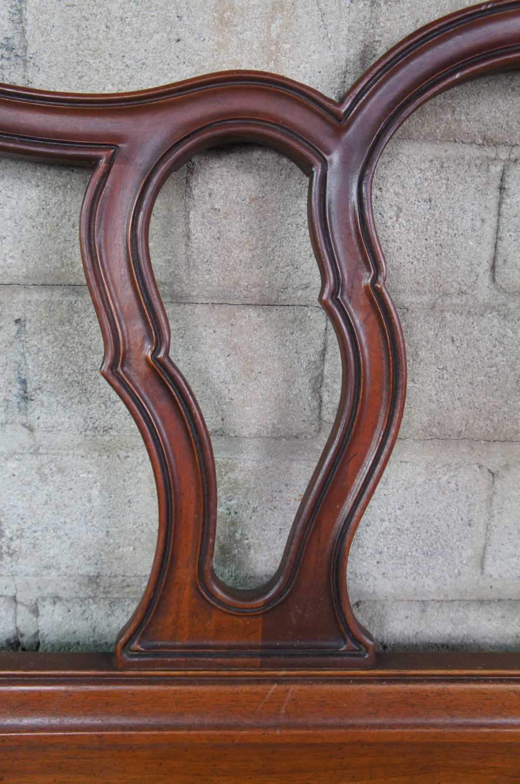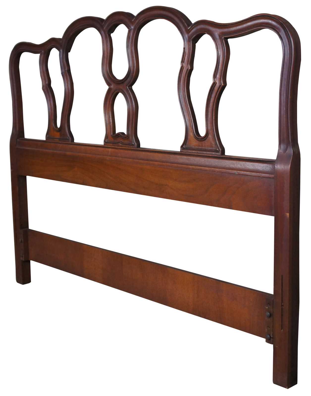 1966 Mid century Drexel Bordeaux French Provincial full size bed headboard. Made from walnut with a serpentine form and pierced back. 206-540.
