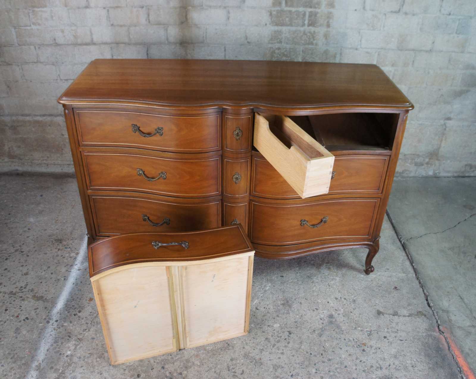 An exquisite oxbow chest or desser with mirror by Drexel Furniture, circa 1965. Features a serpentine form with six drawers and hidden compartment. The dresser is supported by cabriole legs with scrolled feet. 206-120.