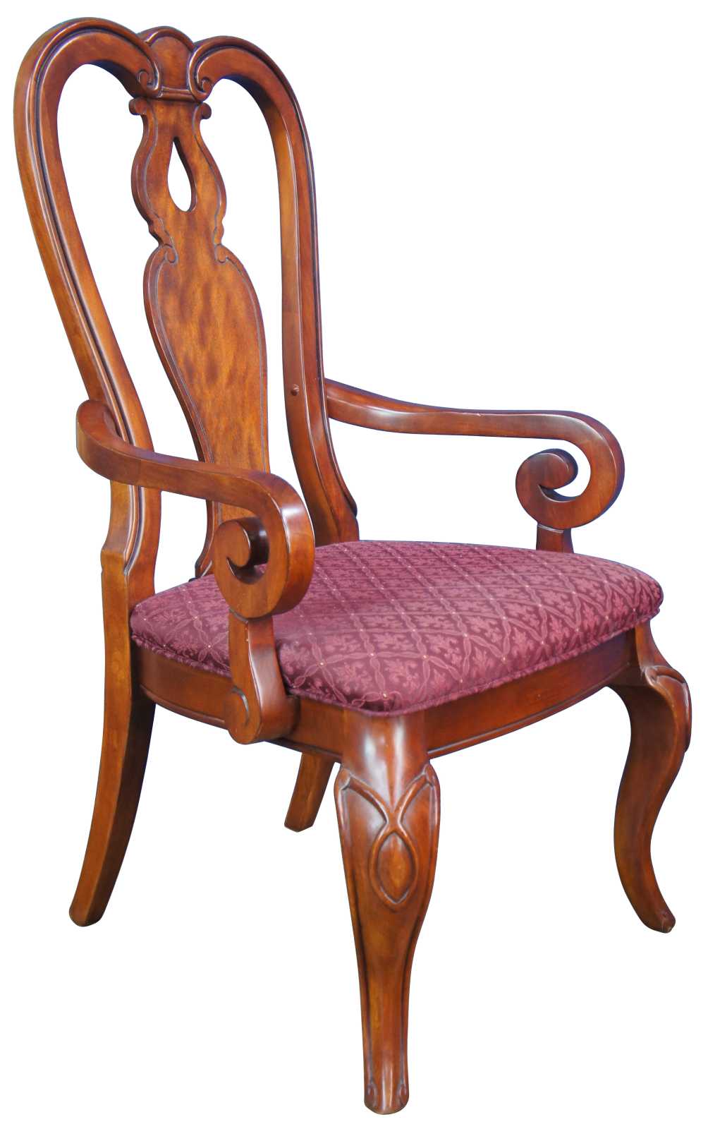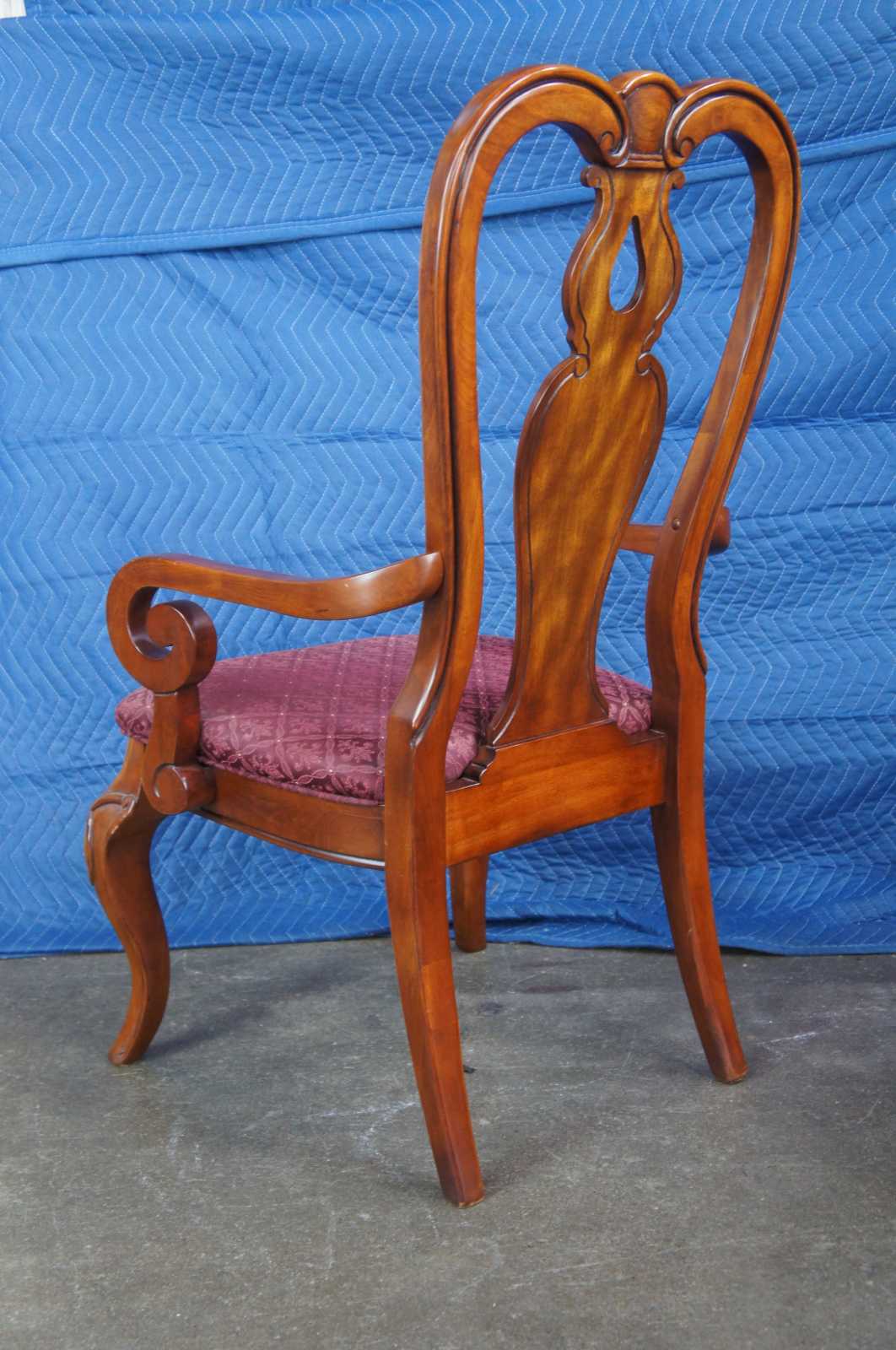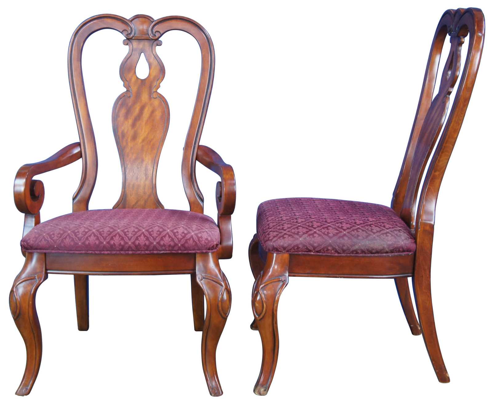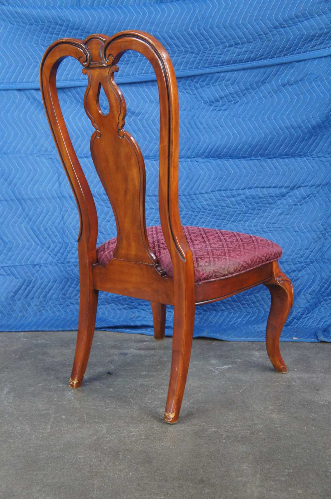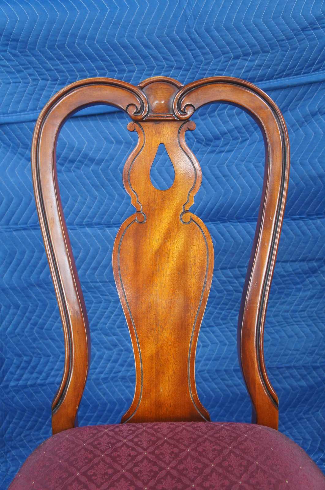 Six vintage mahogany Queen Anne dining chairs. Made of mahogany featuring serpentine form with fluting and urn shaped splat back support.