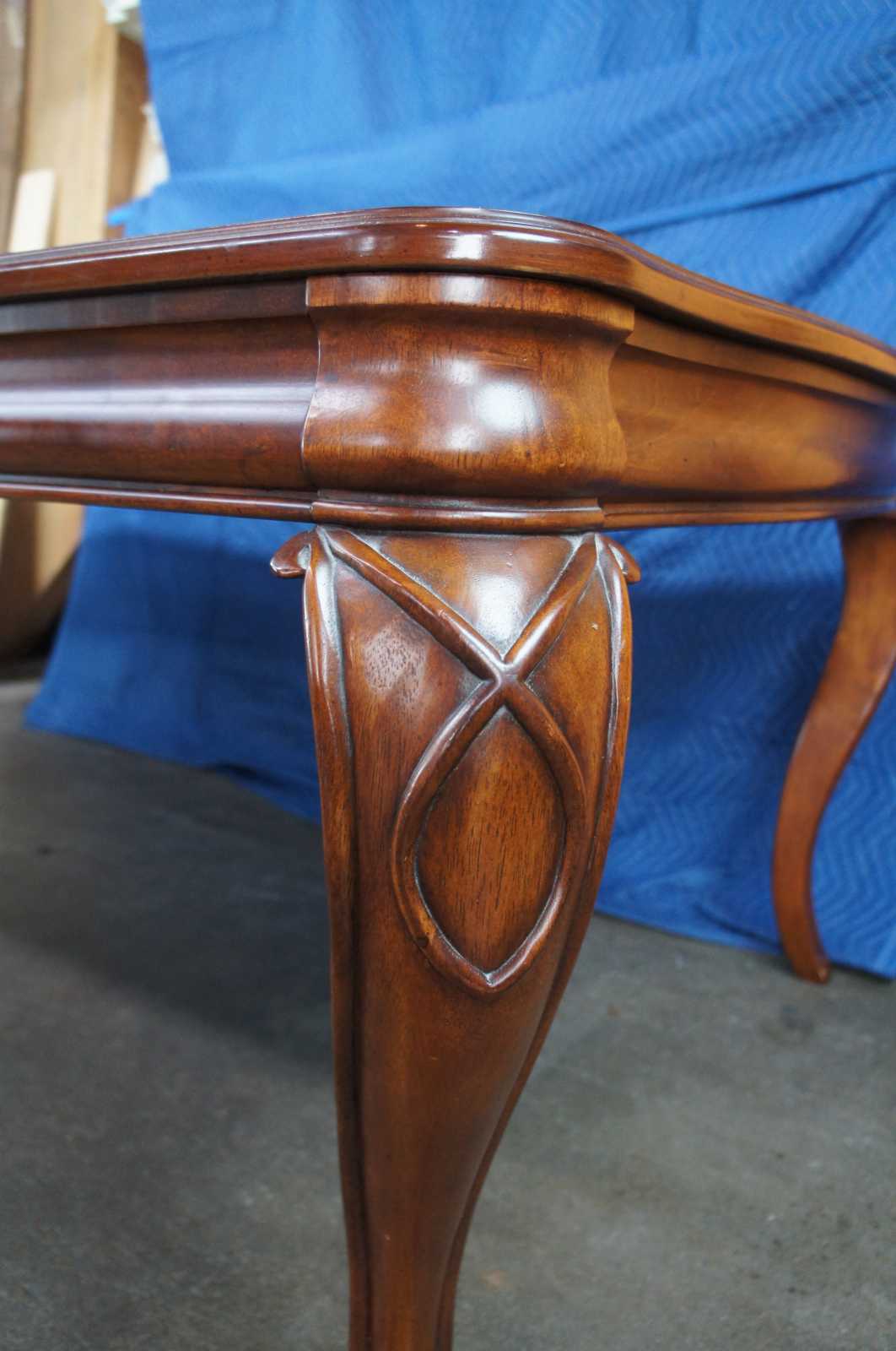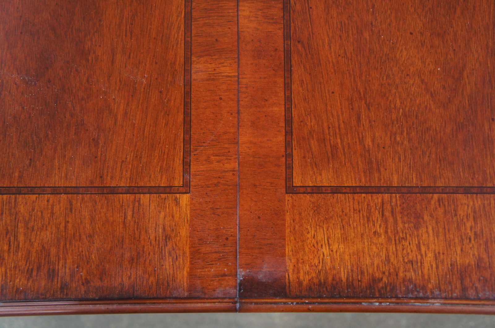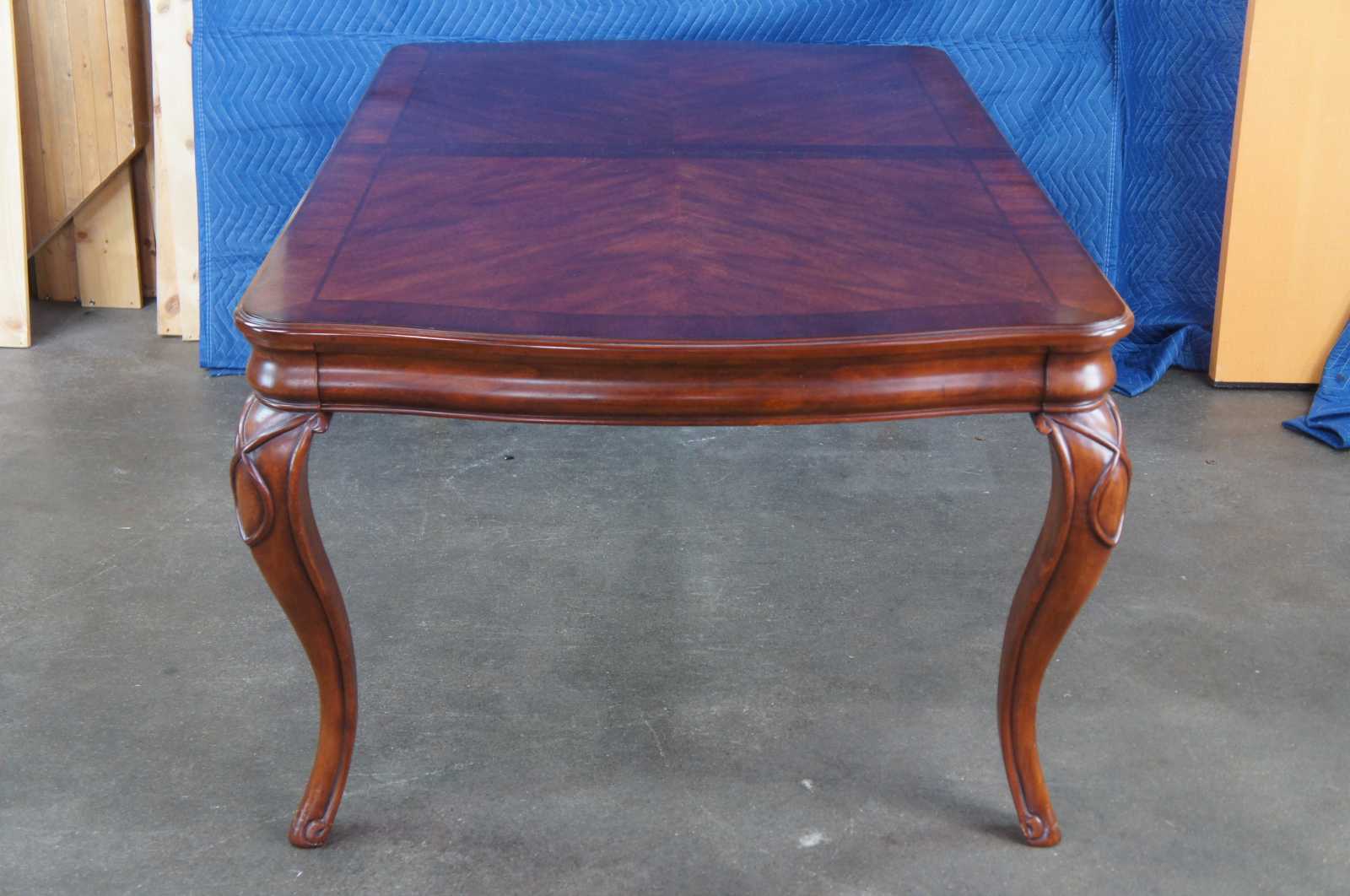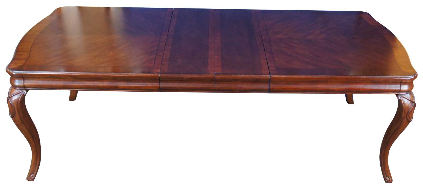 Vintage Queen Anne dining table featuring serpentine form with fluting and banding. Includes two leaves.