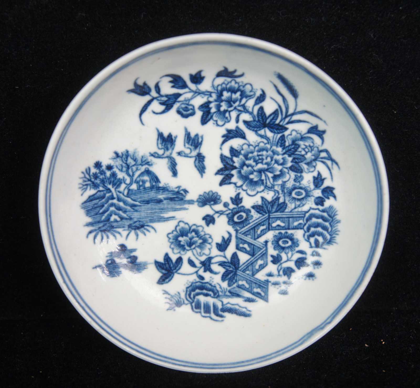 Antique 18th century (Circa 1770s) English George III Worcester 1st period tea bowl or coffee cup and saucer. Made of porcelain featuring the 1st period crescent mark and decorated with the chinoiserie motif known as Fences with an Asian landscape scene with a pagoda house, a fenced in garden and flowers with two large birds / cranes / geese.